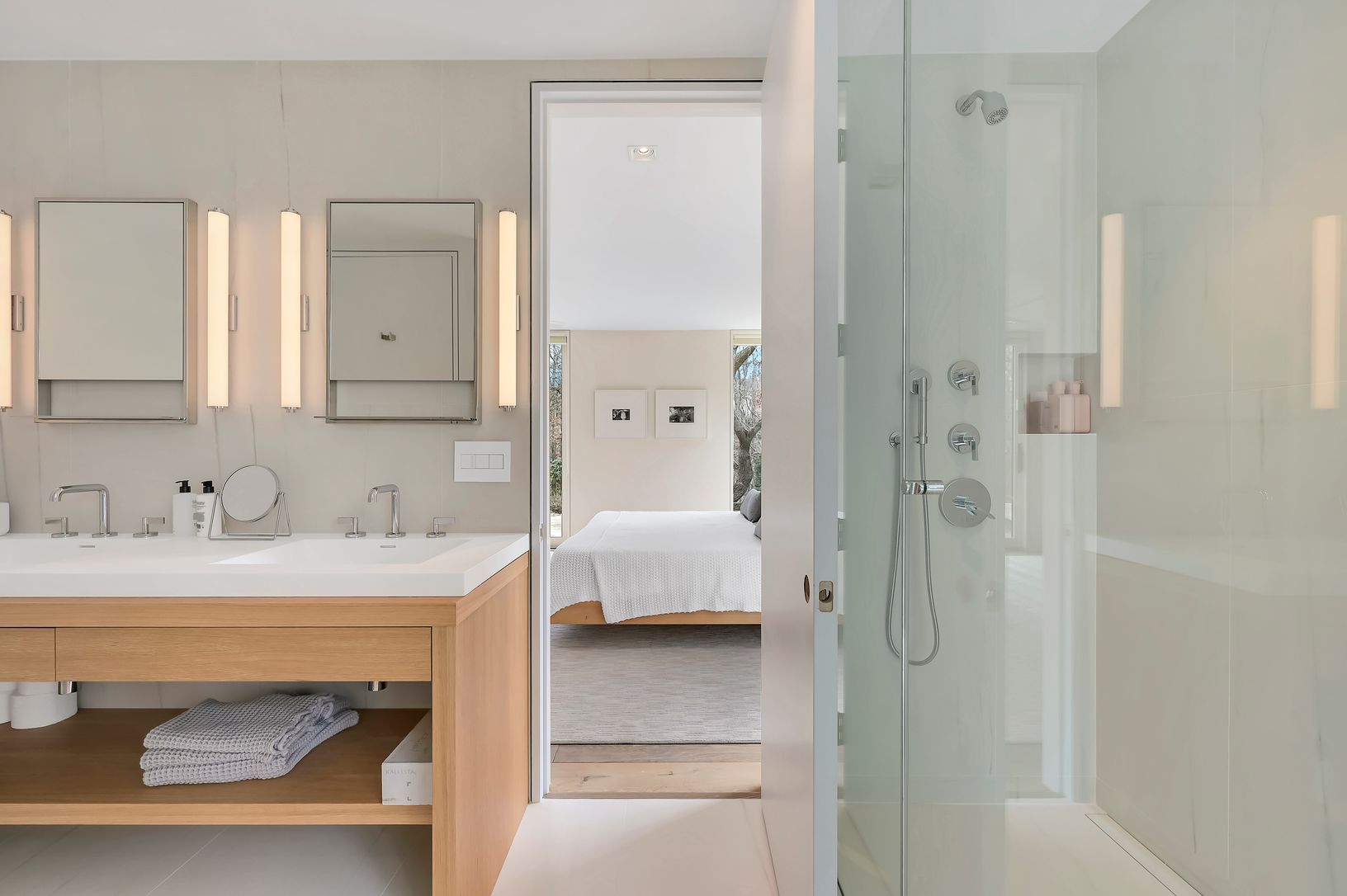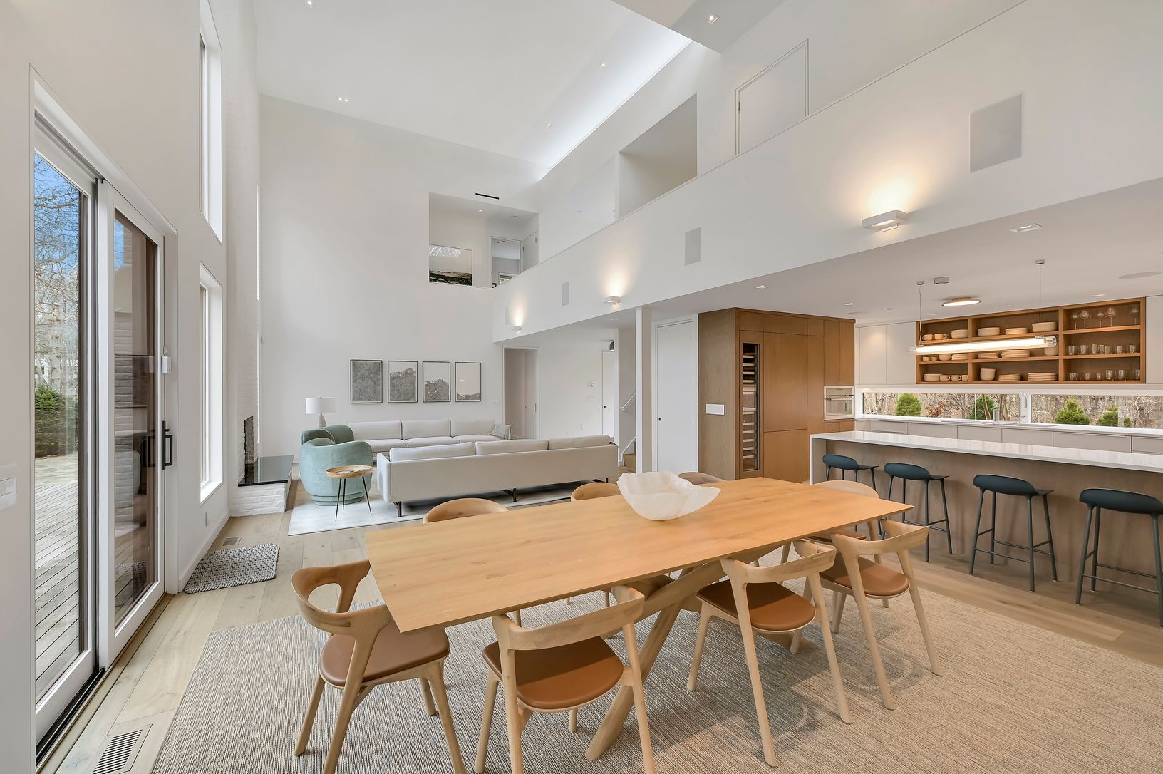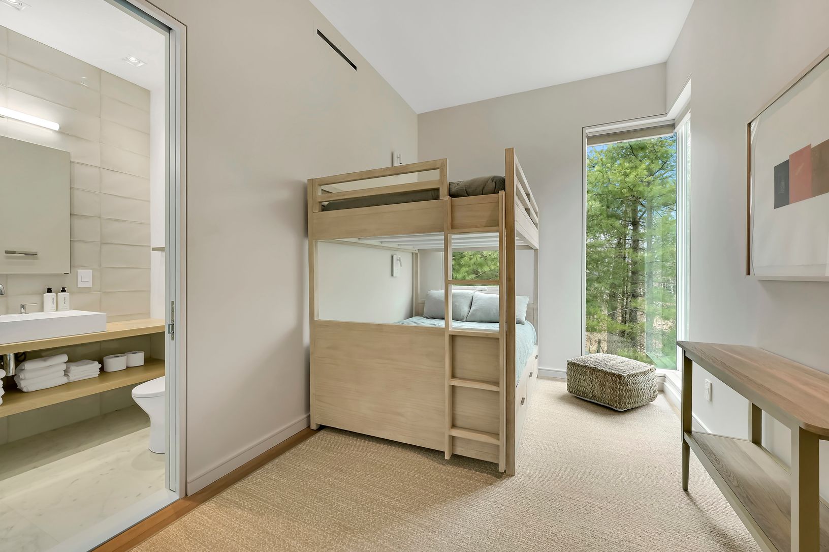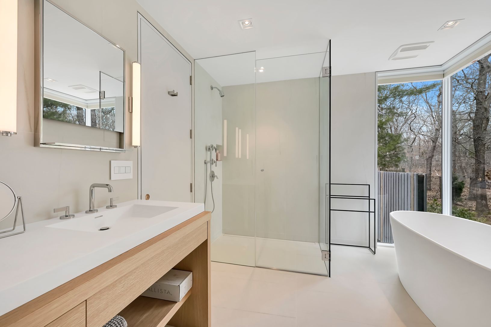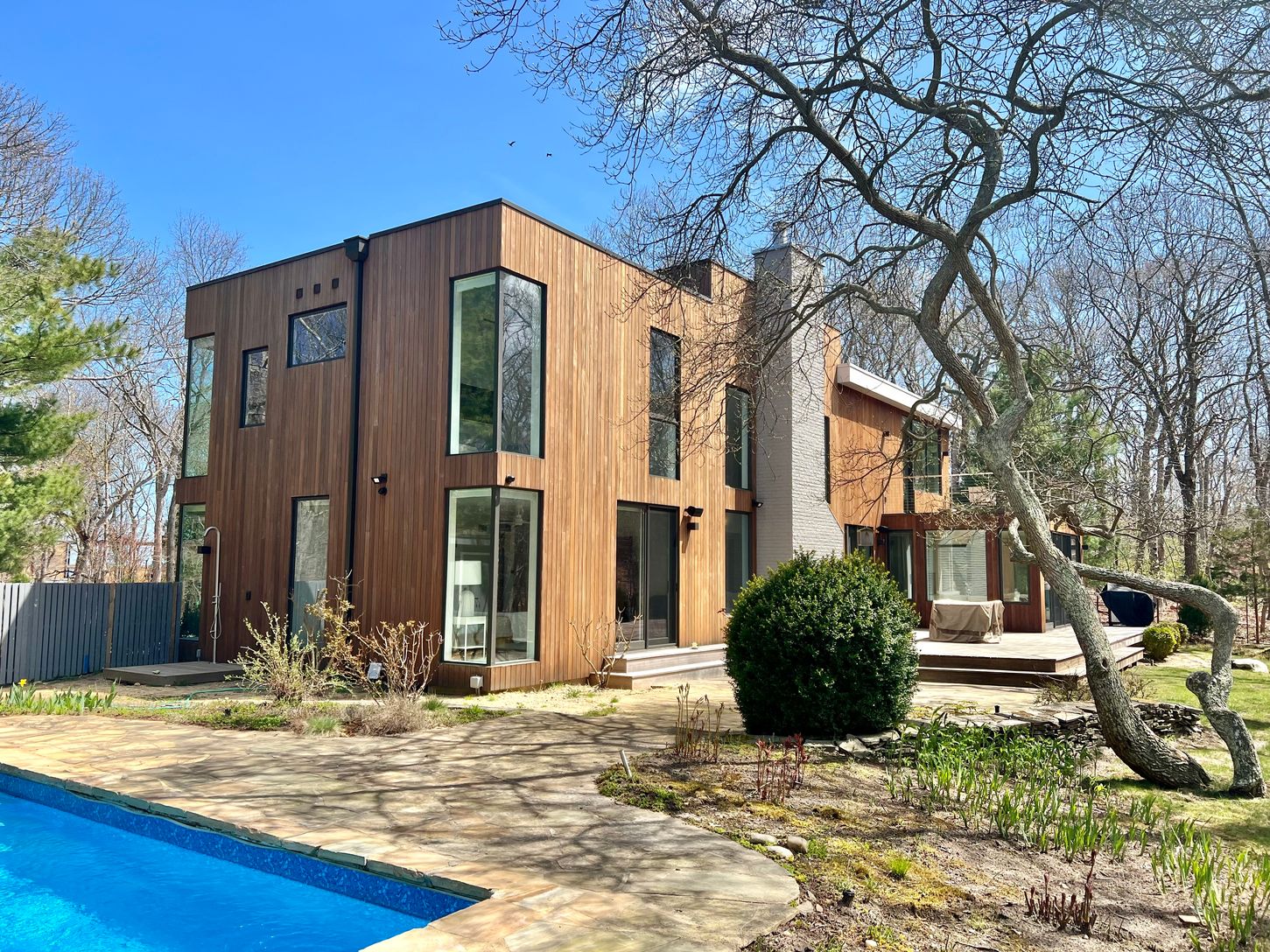 This new modern home is available for the first time as a rental. Located in the Northwest Woods, directly across from the Bay, it incorporates a sleek modern feel but with a warm California vibe. Sited well off the road on a shy acre, everything you would want as a summer rental is included. All bedrooms have ensuite bathrooms. The main level features a large living area bathed in light from multiple skylights and large windows. There is a sl