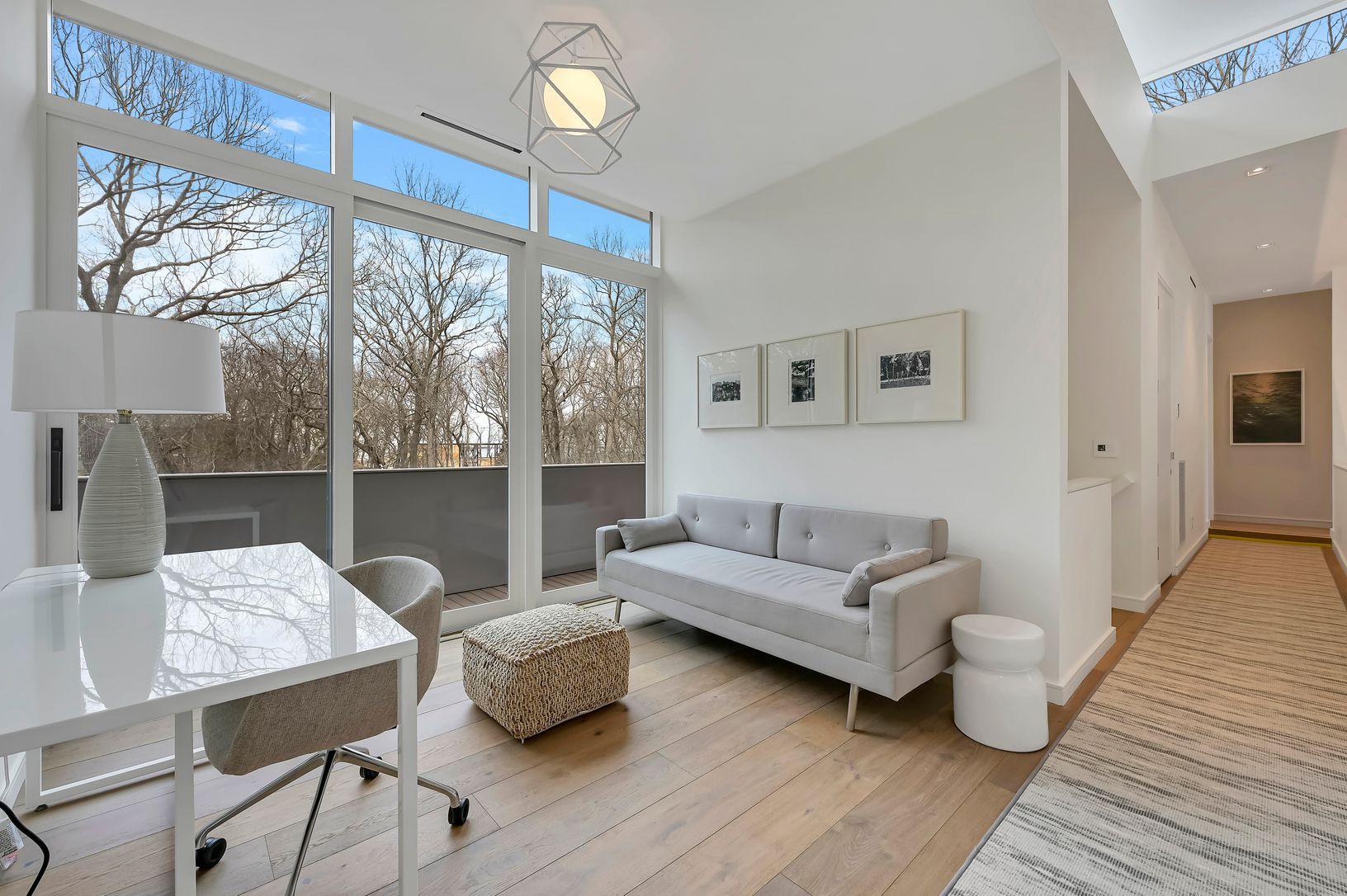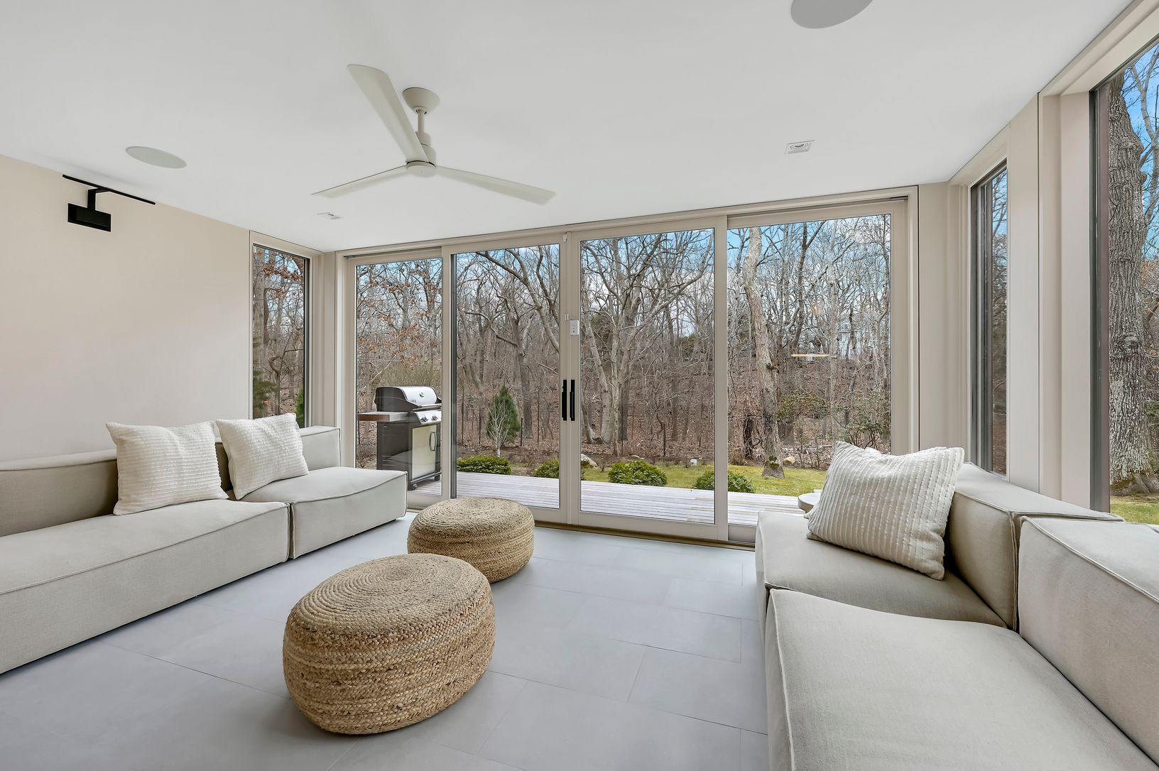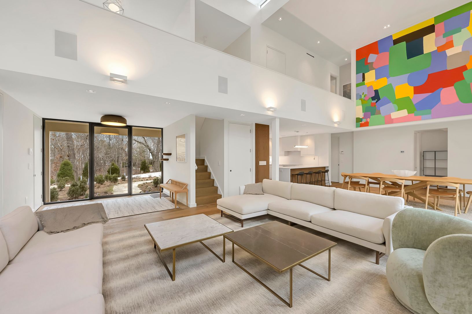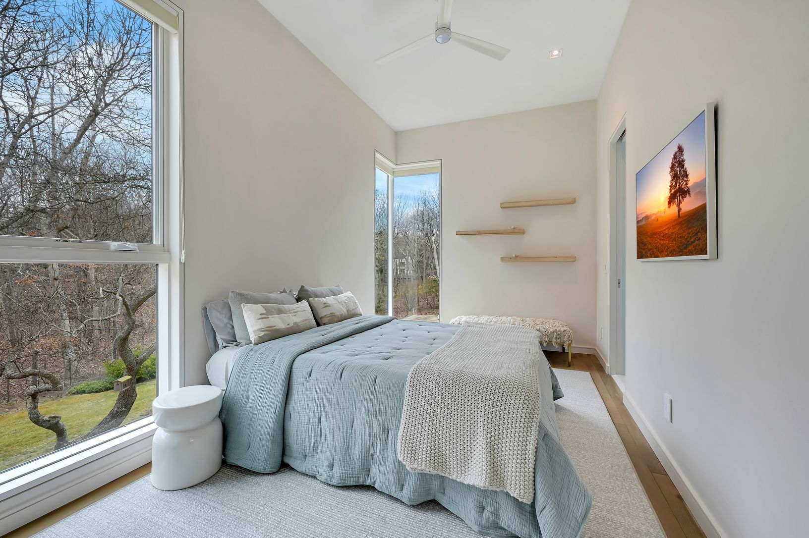 This new modern home is available for the first time as a rental. Located in the Northwest Woods, directly across from the Bay, it incorporates a sleek modern feel but with a warm California vibe. Sited well off the road on a shy acre, everything you would want as a summer rental is included. All bedrooms have ensuite bathrooms. The main level features a large living area bathed in light from multiple skylights and large windows. There is a sl