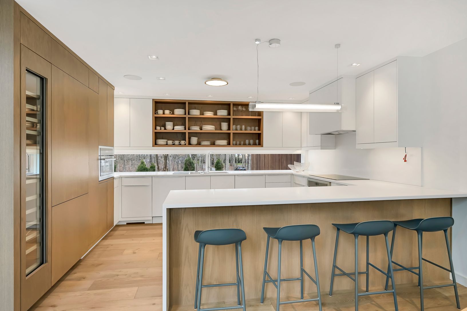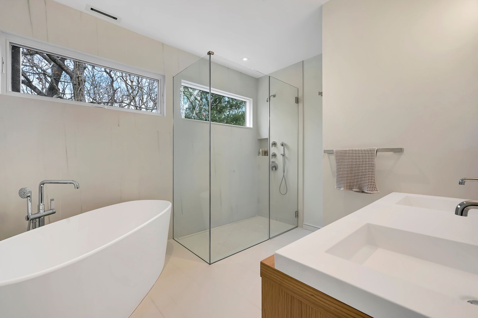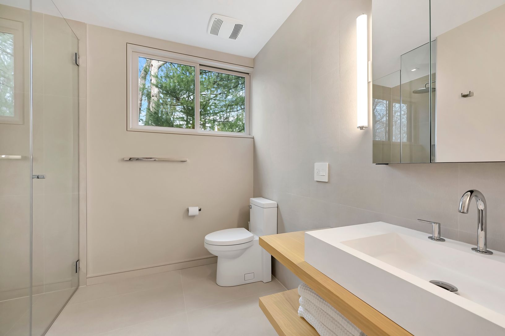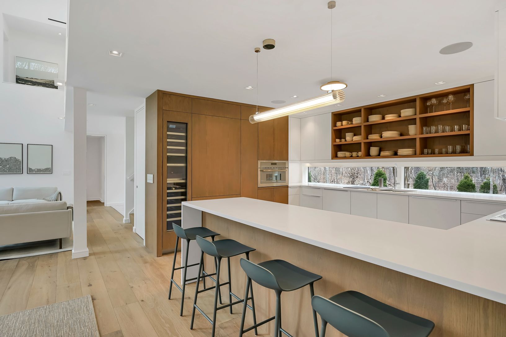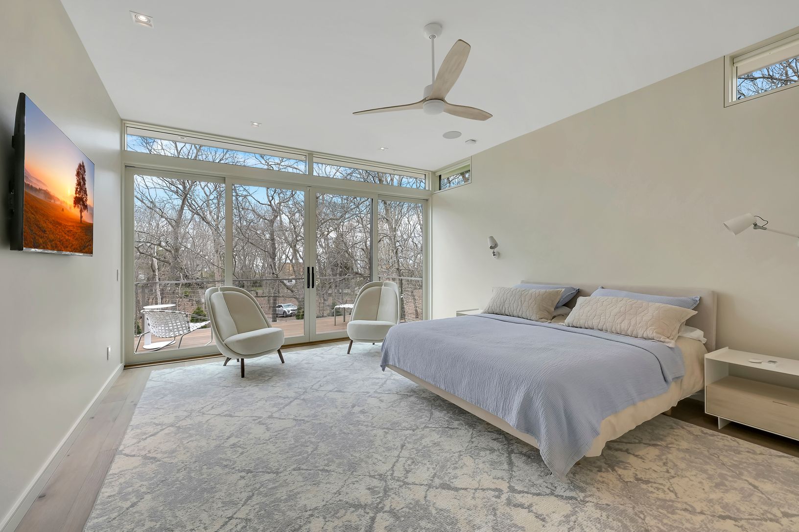 This new modern home is available for the first time as a rental. Located in the Northwest Woods, directly across from the Bay, it incorporates a sleek modern feel but with a warm California vibe. Sited well off the road on a shy acre, everything you would want as a summer rental is included. All bedrooms have ensuite bathrooms. The main level features a large living area bathed in light from multiple skylights and large windows. There is a sl