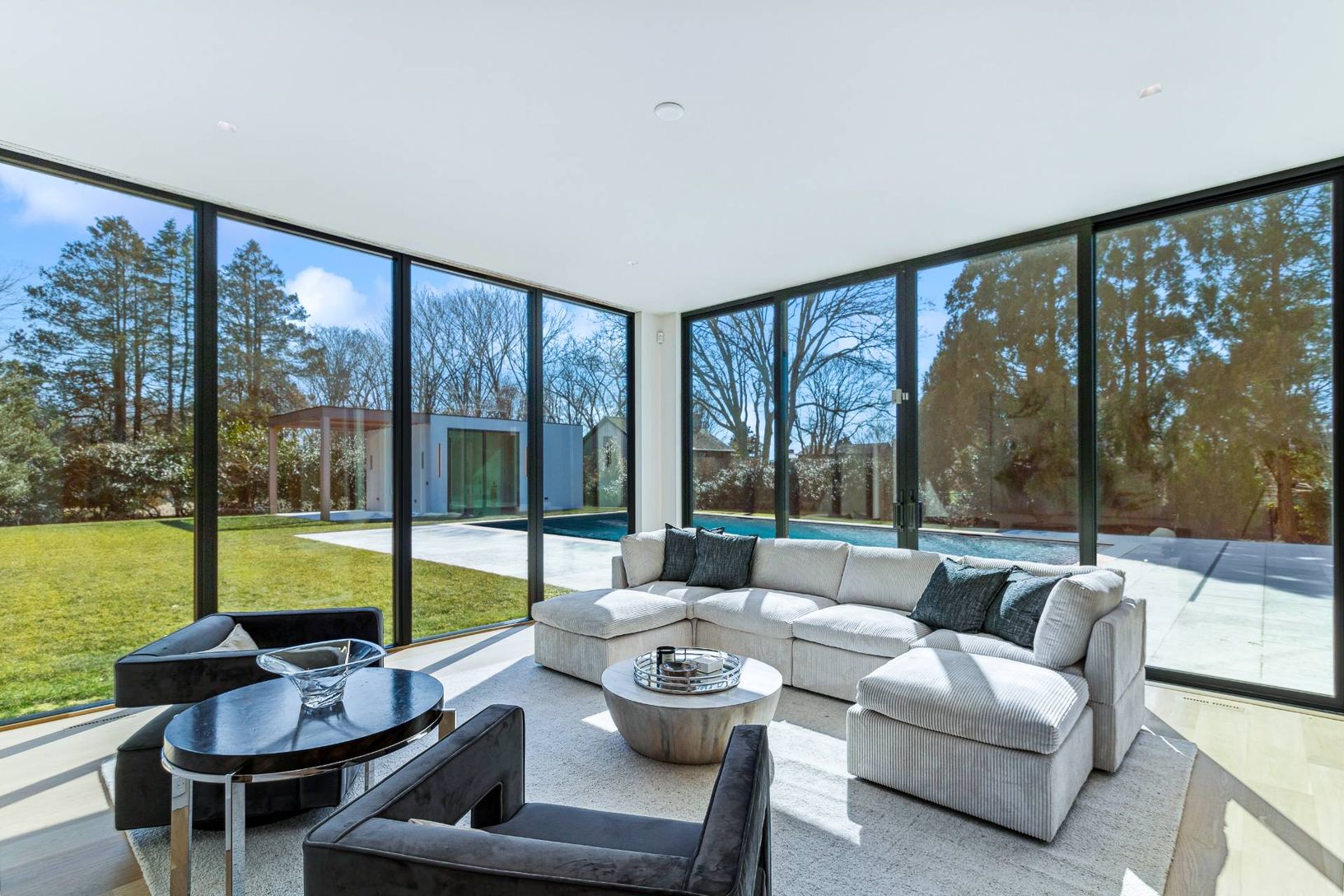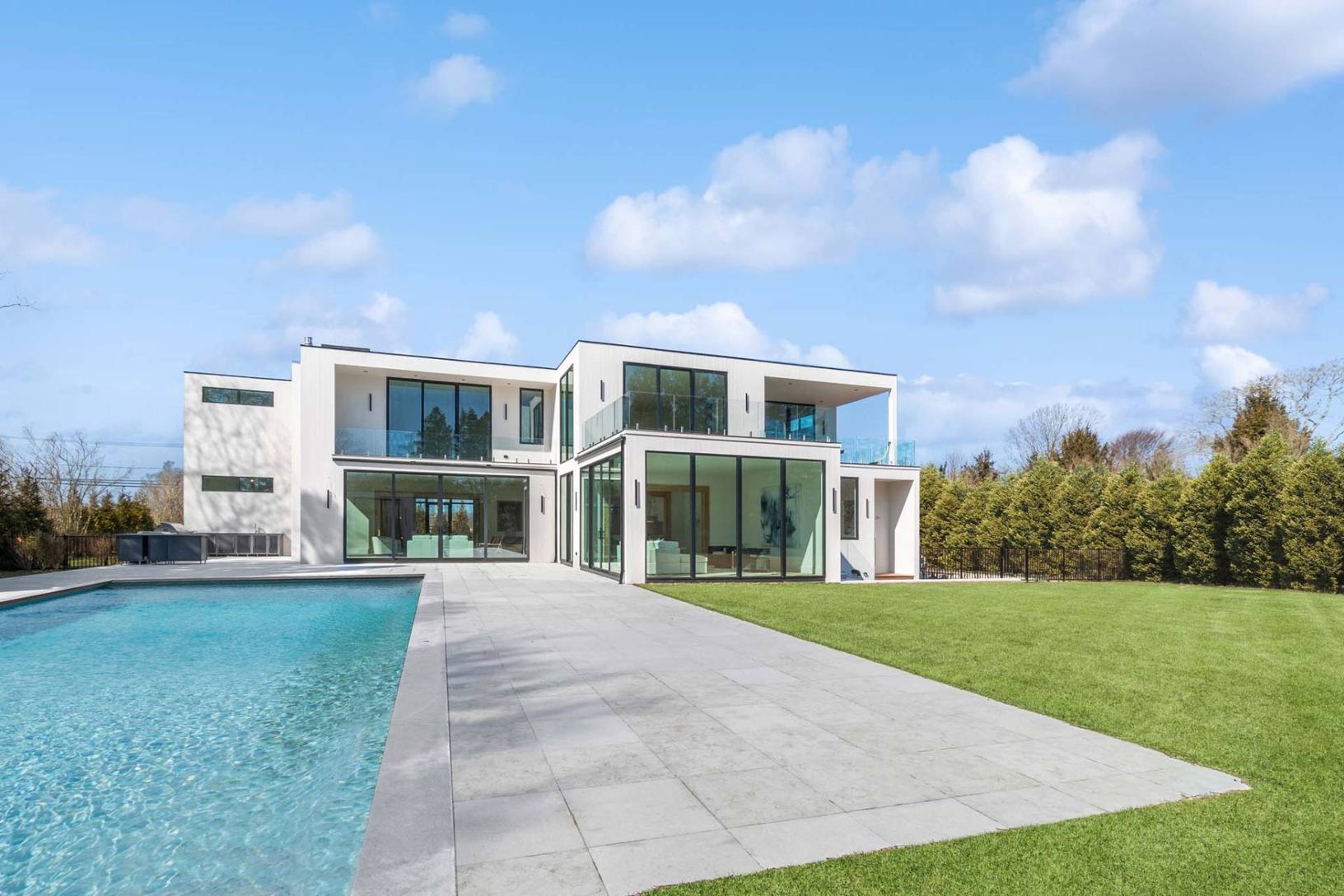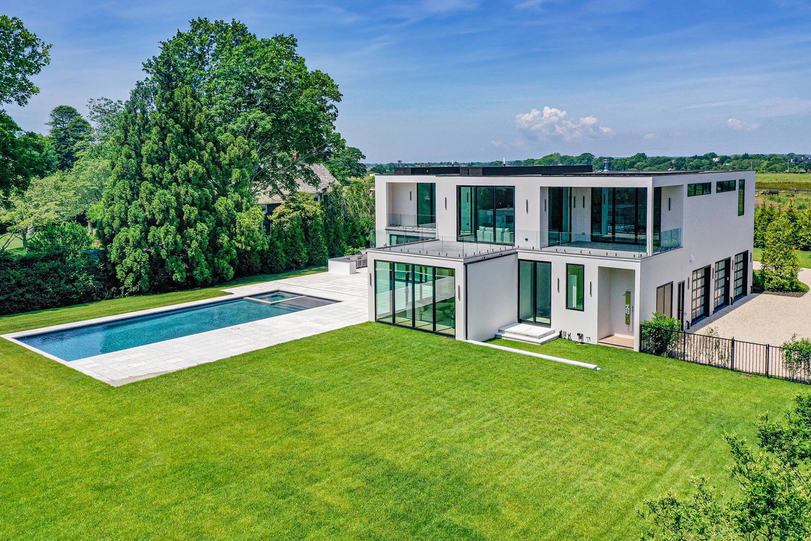 South of the highway in Bridgehampton, a few minutes to both Ocean Road and Mecox ocean beaches, a spectacular new home with new pool and pool house is under construction by Konner Development on this just-shy 1-acre property. The property has beautiful western views over 30 acres of farmland. This state of the art contemporary provides 8,543+/- sq. ft. of living space including lower level, with 7 bedrooms, 10 full and 2 half baths. Walls of