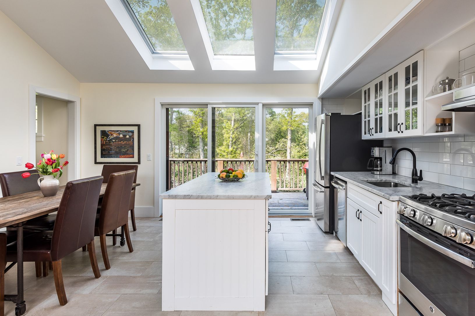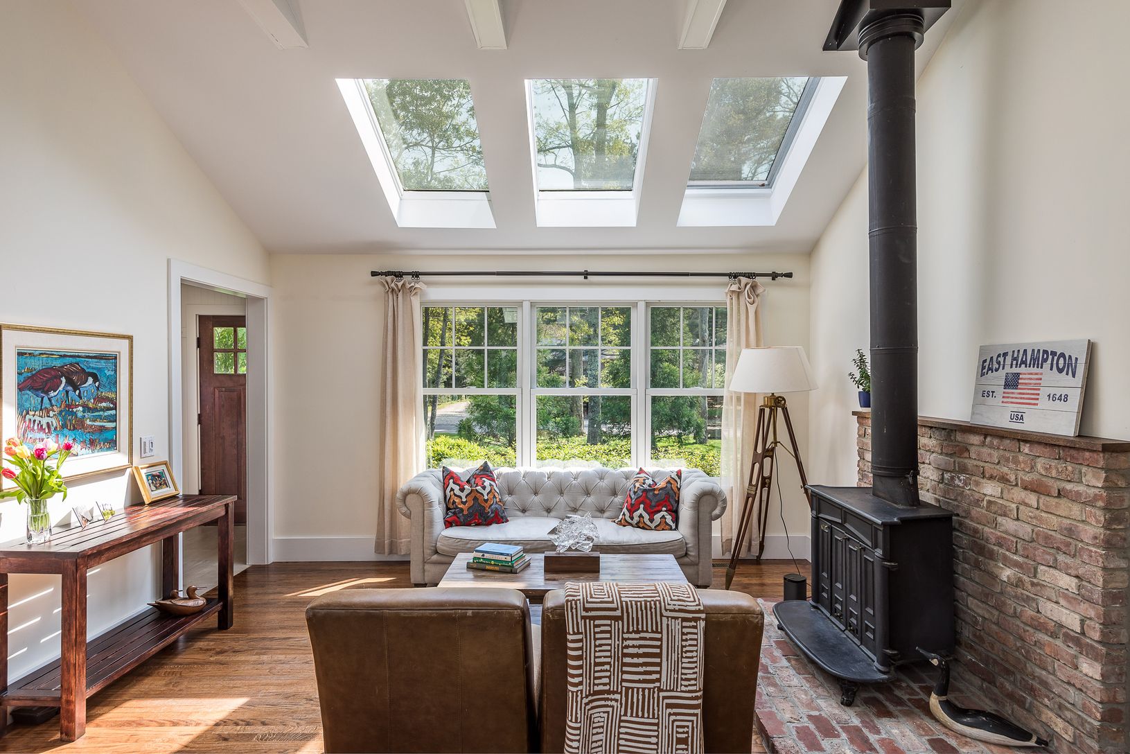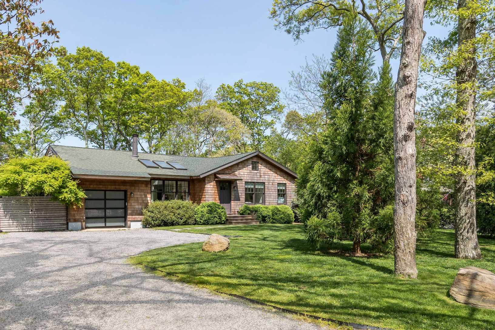 Fully renovated and meticulously designed, this charming chateau-style cottage on a shy half acre is everything you've been looking for. Located on a picturesque and lightly traveled street, this stylish cedar-shingled home is flooded with light that pours in from skylights and perfectly complements the airy layout. The open living and kitchen space features cathedral ceilings with exposed beams, a wood burning fireplace, stainless steel appli