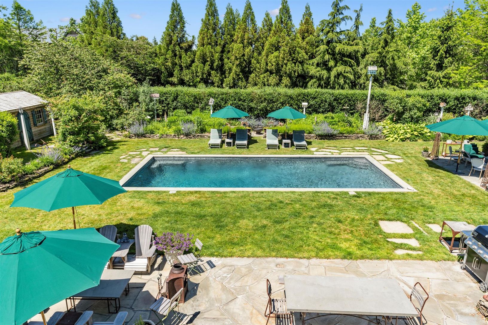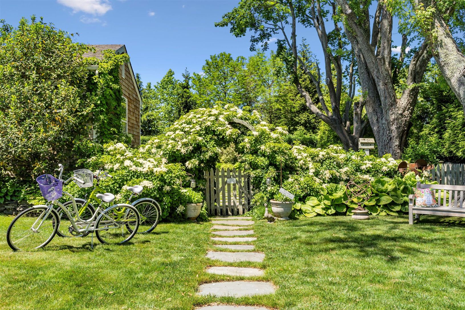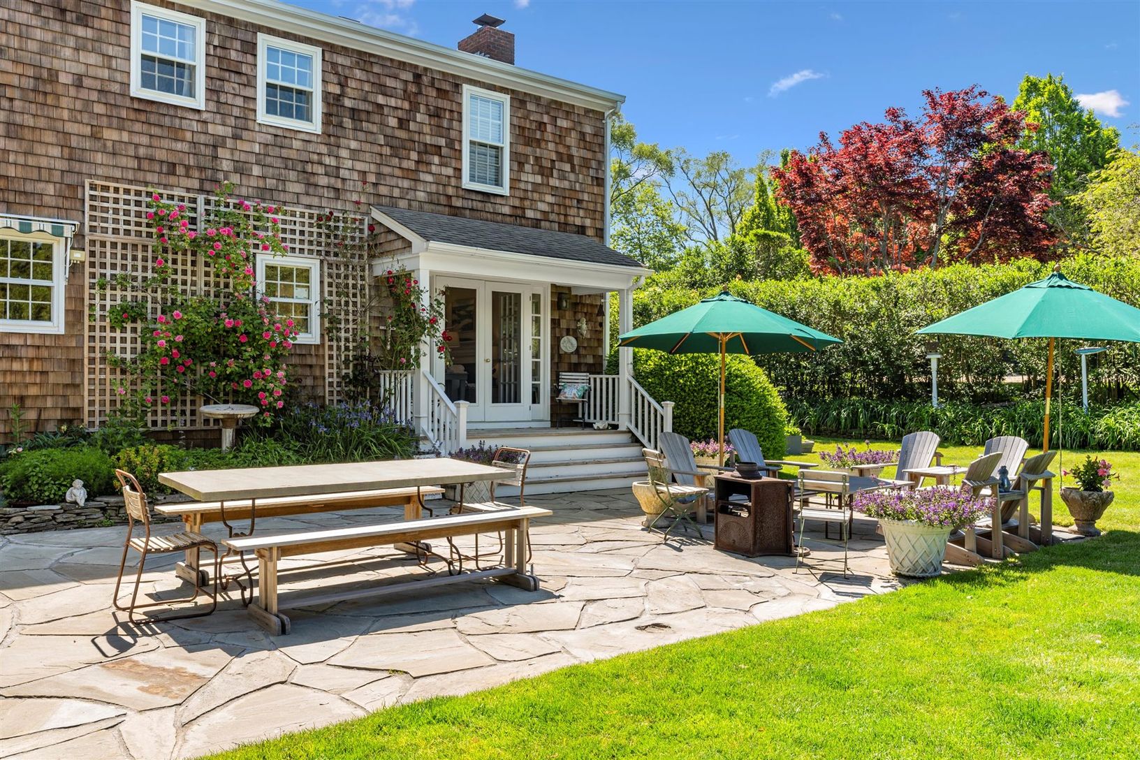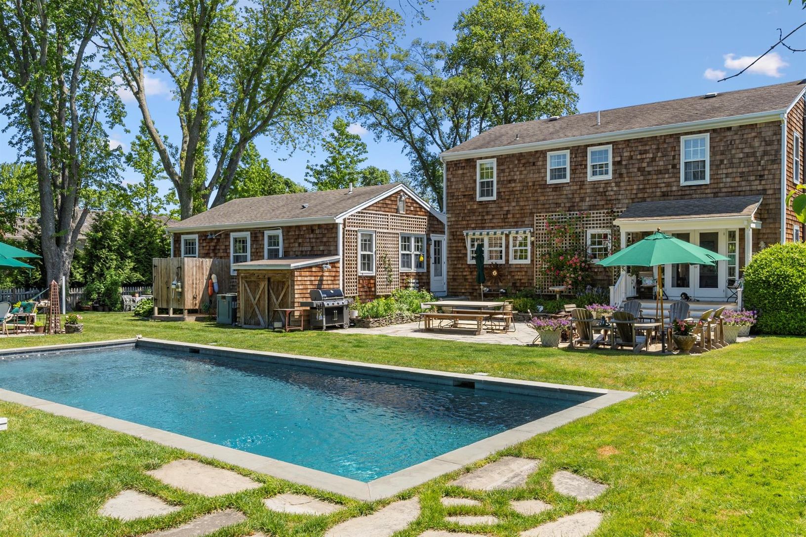 This south of the highway shingled traditional in Bridgehampton, NY. features 5 bedrooms, 3.5 baths, an updated stainless kitchen with gas double oven, butler's pantry, and a sunny eating area. Entertain in a warm separate dining room with seating for 10. There's plenty of seating in the living room where two chic sofas flank the wood burning fireplace. There is a first-floor primary suite with king bed, sitting area, large shower, and claw fo