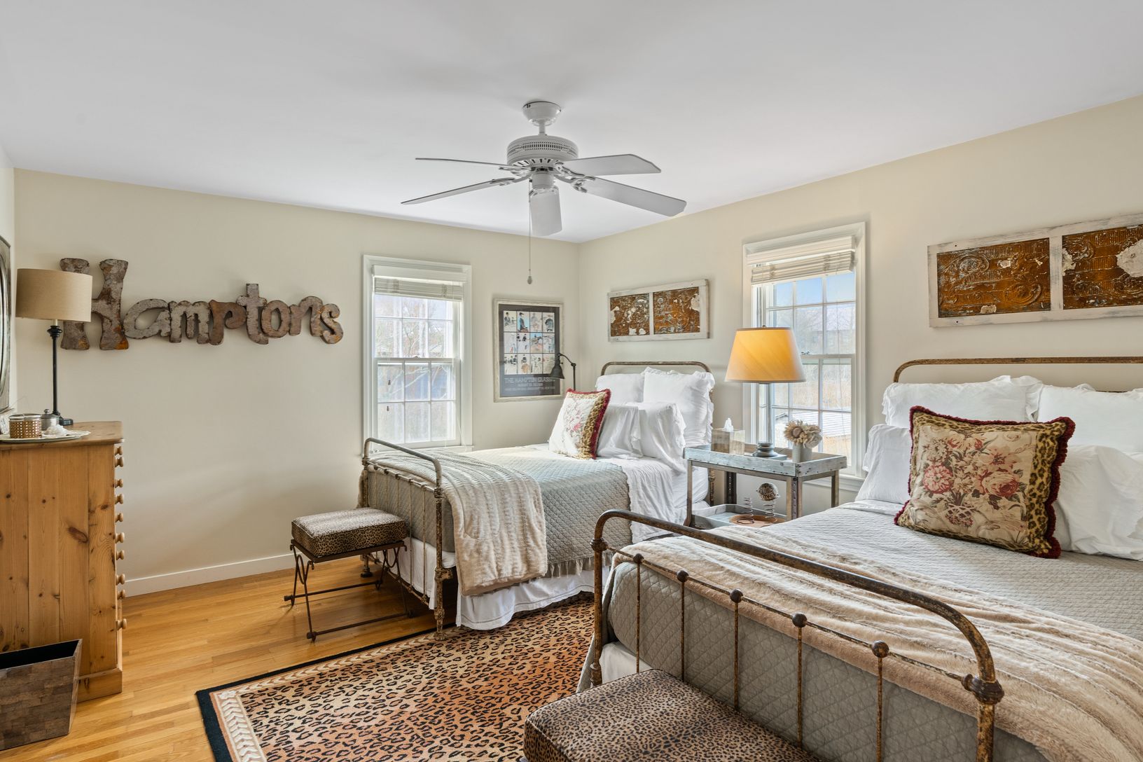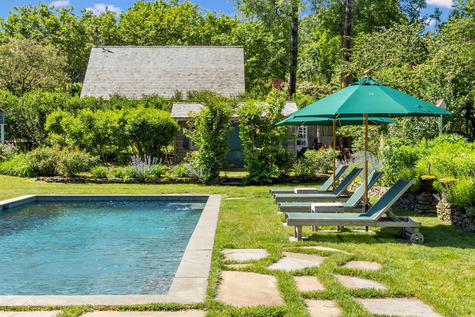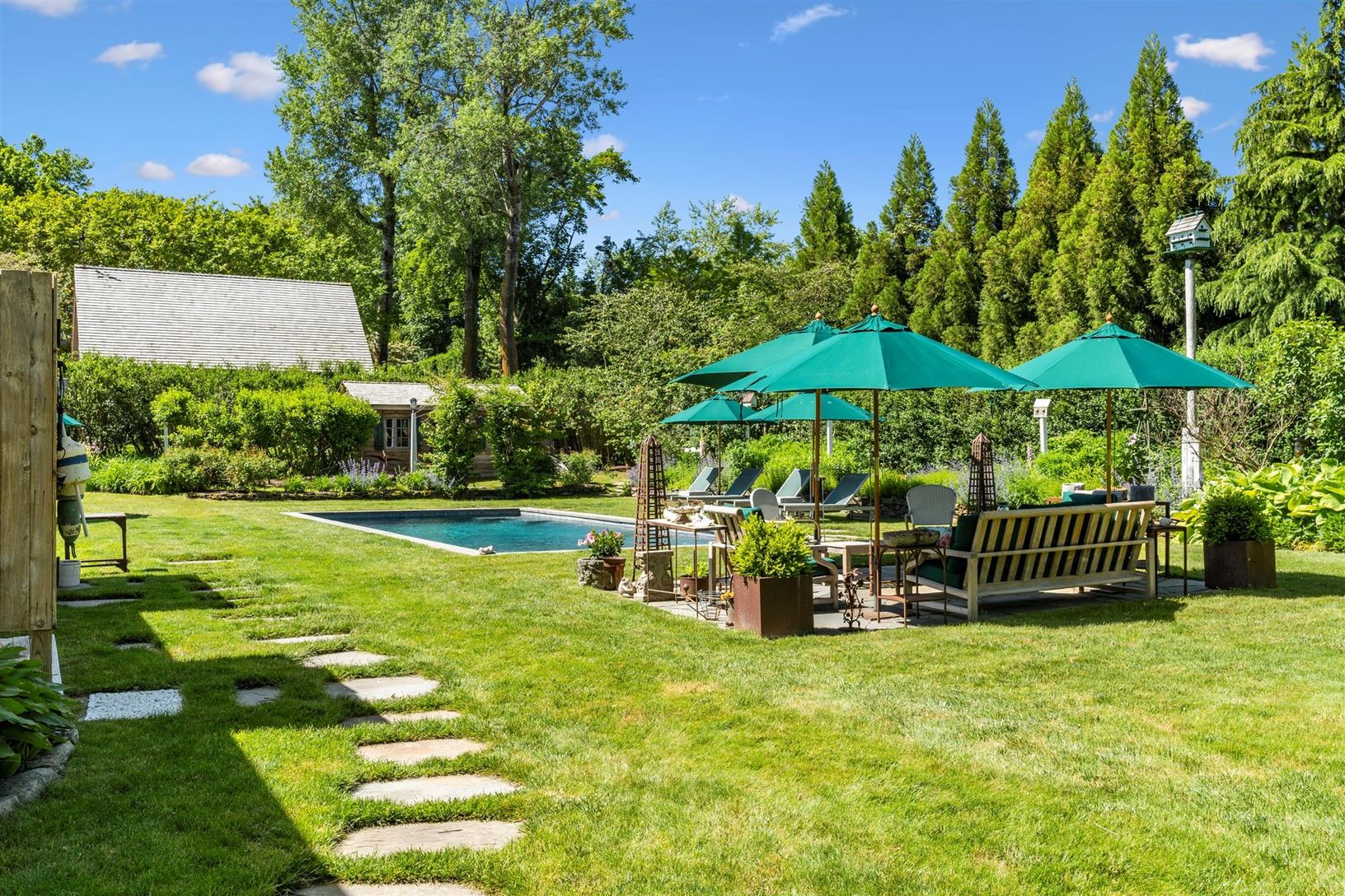 This south of the highway shingled traditional in Bridgehampton, NY. features 5 bedrooms, 3.5 baths, an updated stainless kitchen with gas double oven, butler's pantry, and a sunny eating area. Entertain in a warm separate dining room with seating for 10. There's plenty of seating in the living room where two chic sofas flank the wood burning fireplace. There is a first-floor primary suite with king bed, sitting area, large shower, and claw fo