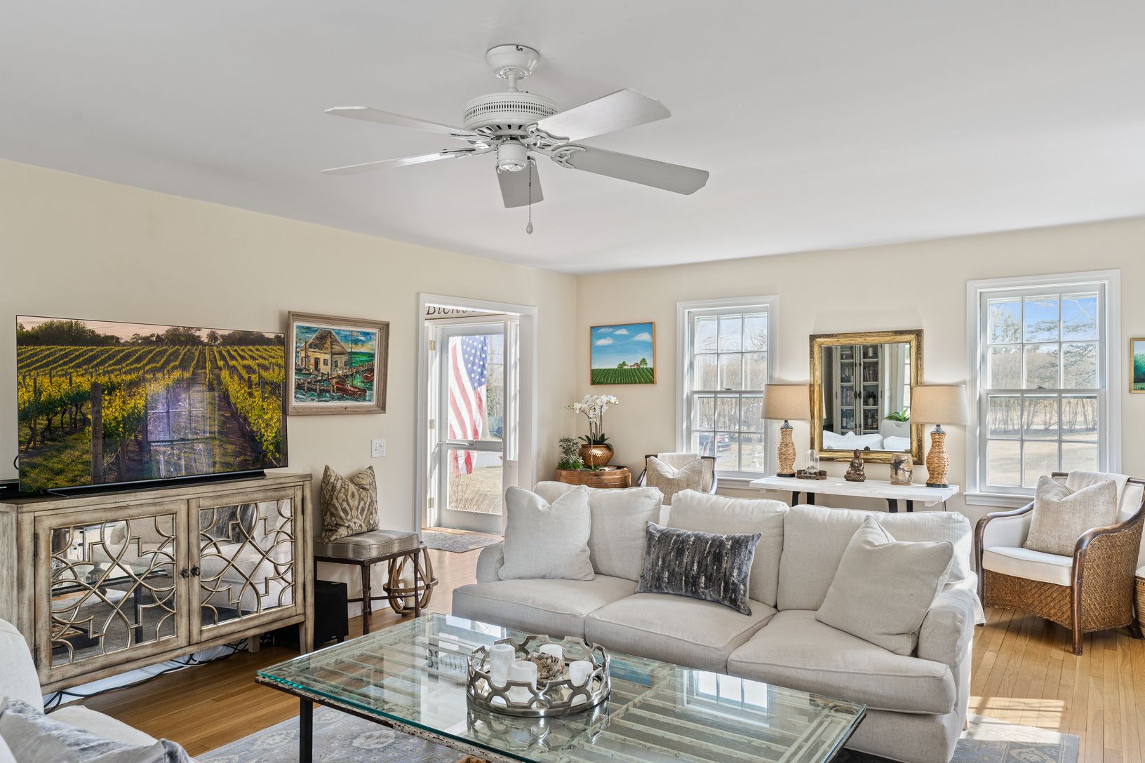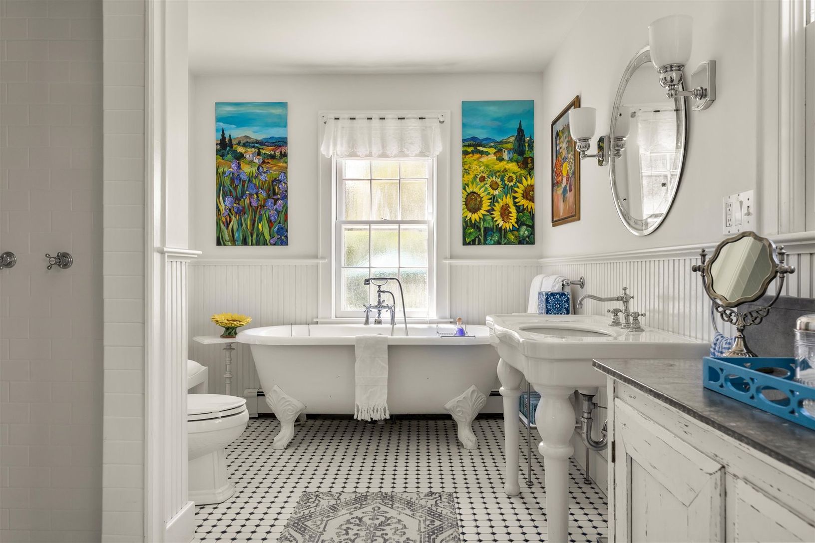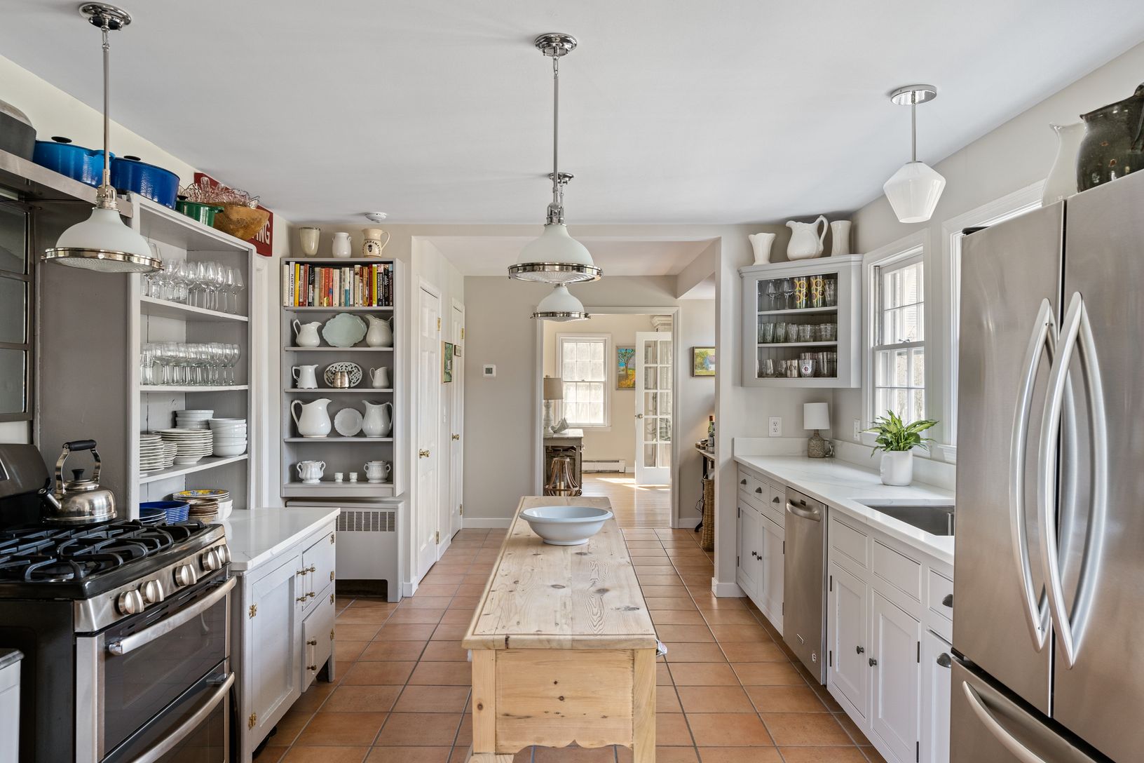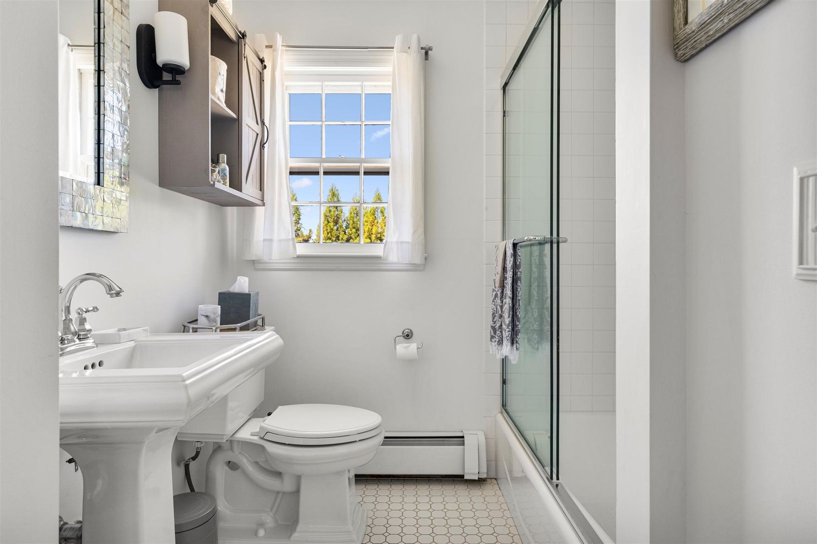 This south of the highway shingled traditional in Bridgehampton, NY. features 5 bedrooms, 3.5 baths, an updated stainless kitchen with gas double oven, butler's pantry, and a sunny eating area. Entertain in a warm separate dining room with seating for 10. There's plenty of seating in the living room where two chic sofas flank the wood burning fireplace. There is a first-floor primary suite with king bed, sitting area, large shower, and claw fo