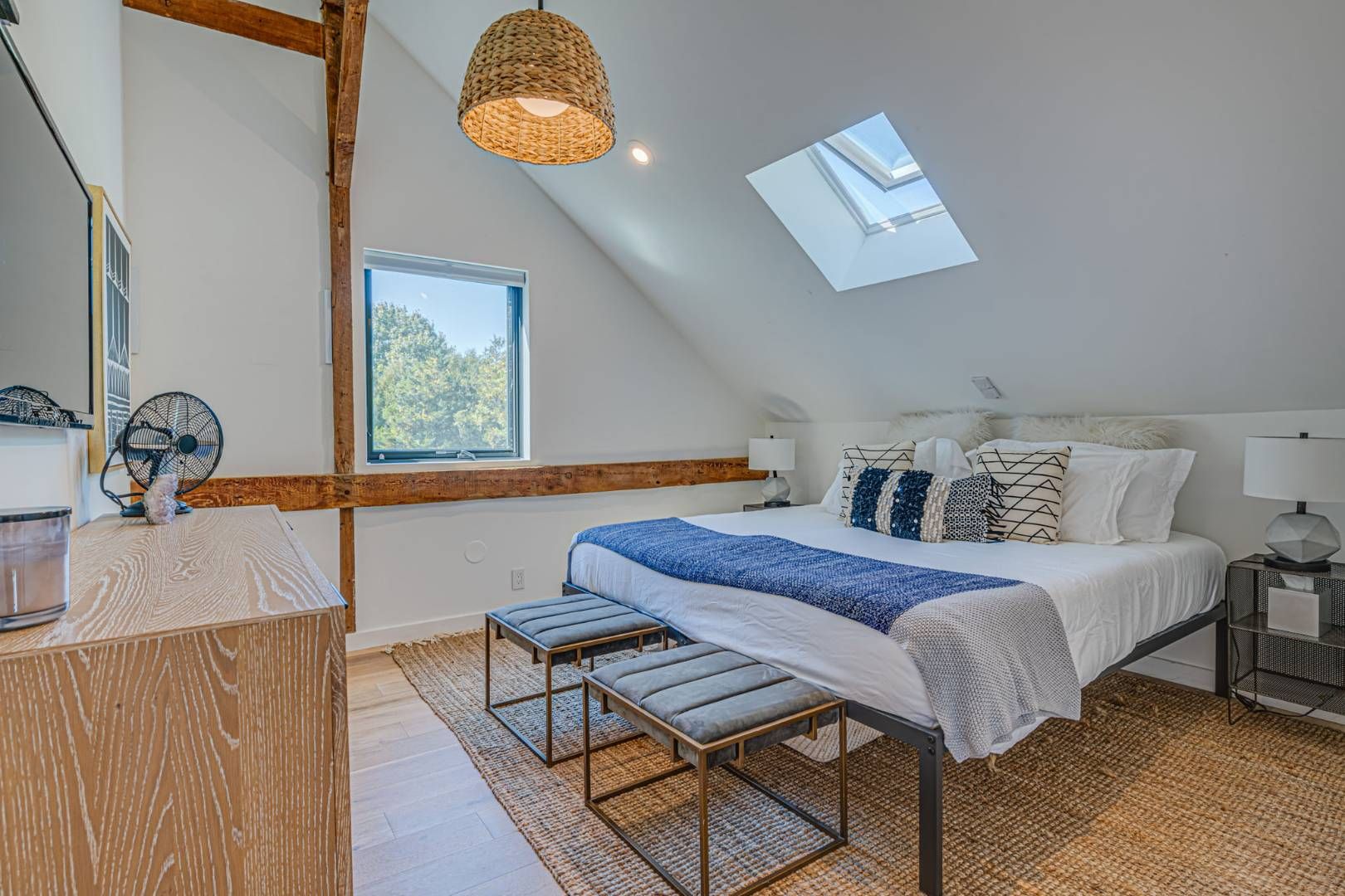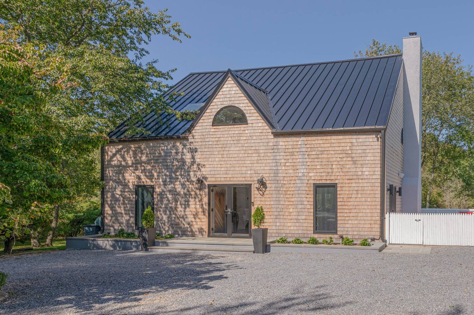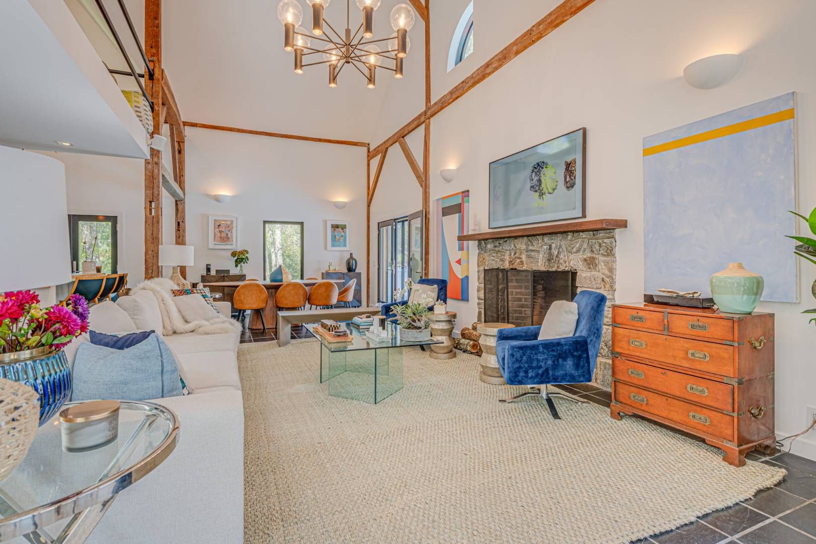 Perfectly located just 2.5 miles from exquisite ocean beaches, this South of the Highway gem is the most compelling opportunity on the market. Offering a unique blend of history and modernity, the original barn structure was converted by designer George Dandridge into a chic retreat in 1980. Set down a long flag driveway and adjacent to acres of open farm fields, the authentic post and beam structure creates an expansive, open and airy feel. T