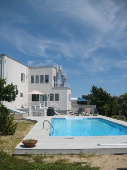 Cool Contemporary in north Amagansett with 3 bedrooms, 2.5 baths, roof deck with water views, lots of decking, and a gorgeous pool in a perfect bayside location. Bright two story living room with lots of glass, open kitchen and large dining area providing for easy entertaining both indoors and out. Upstairs sitting room is open to main living space and has spectacular waterviews, too. Spacious Master Bedroom suite with waterview balcony. A tru