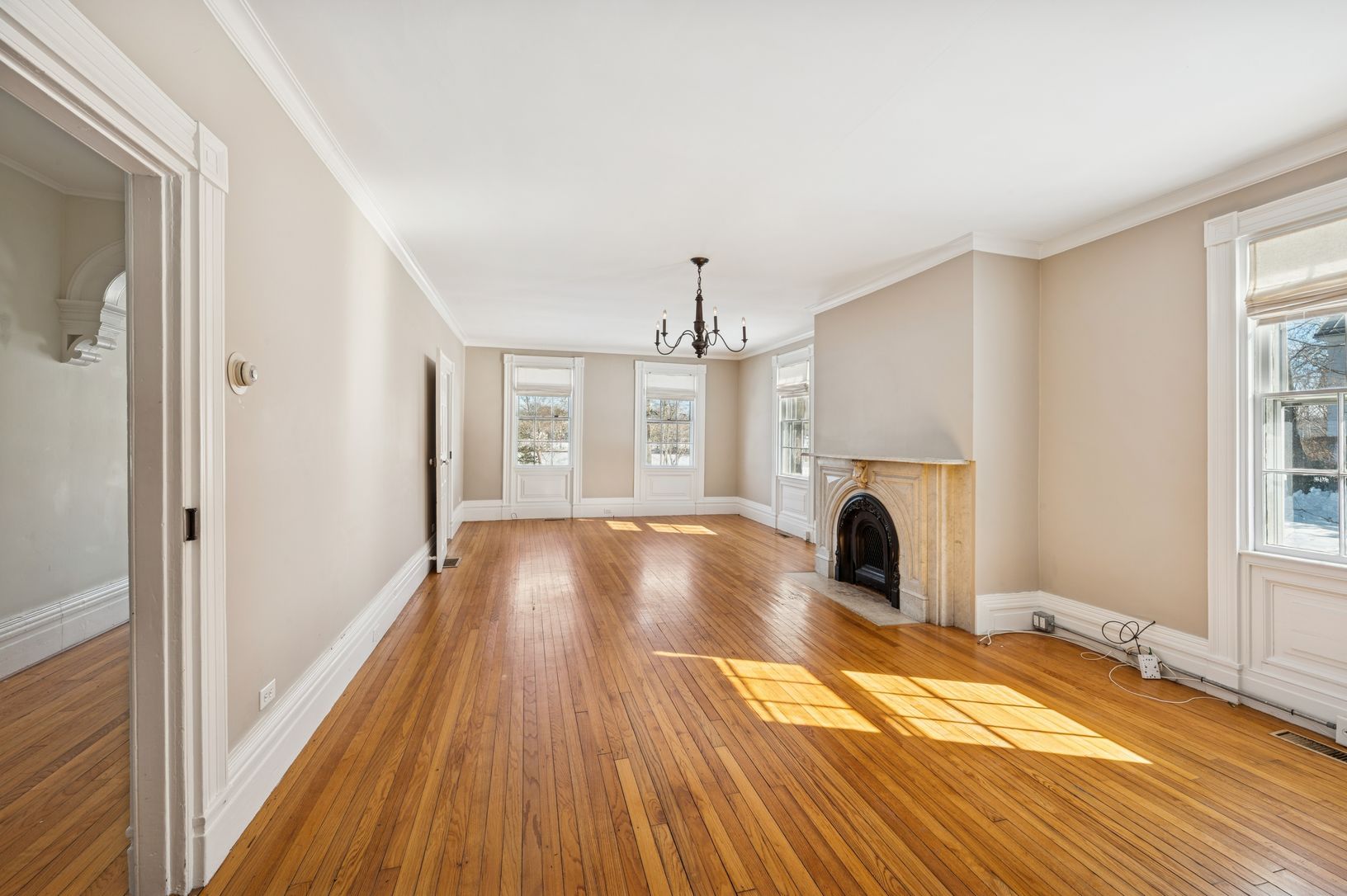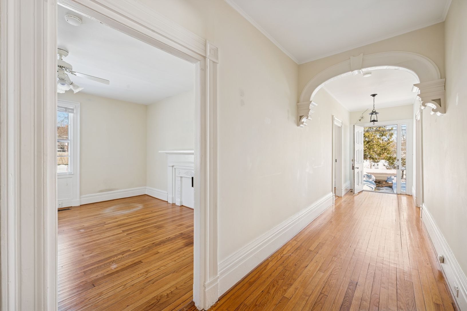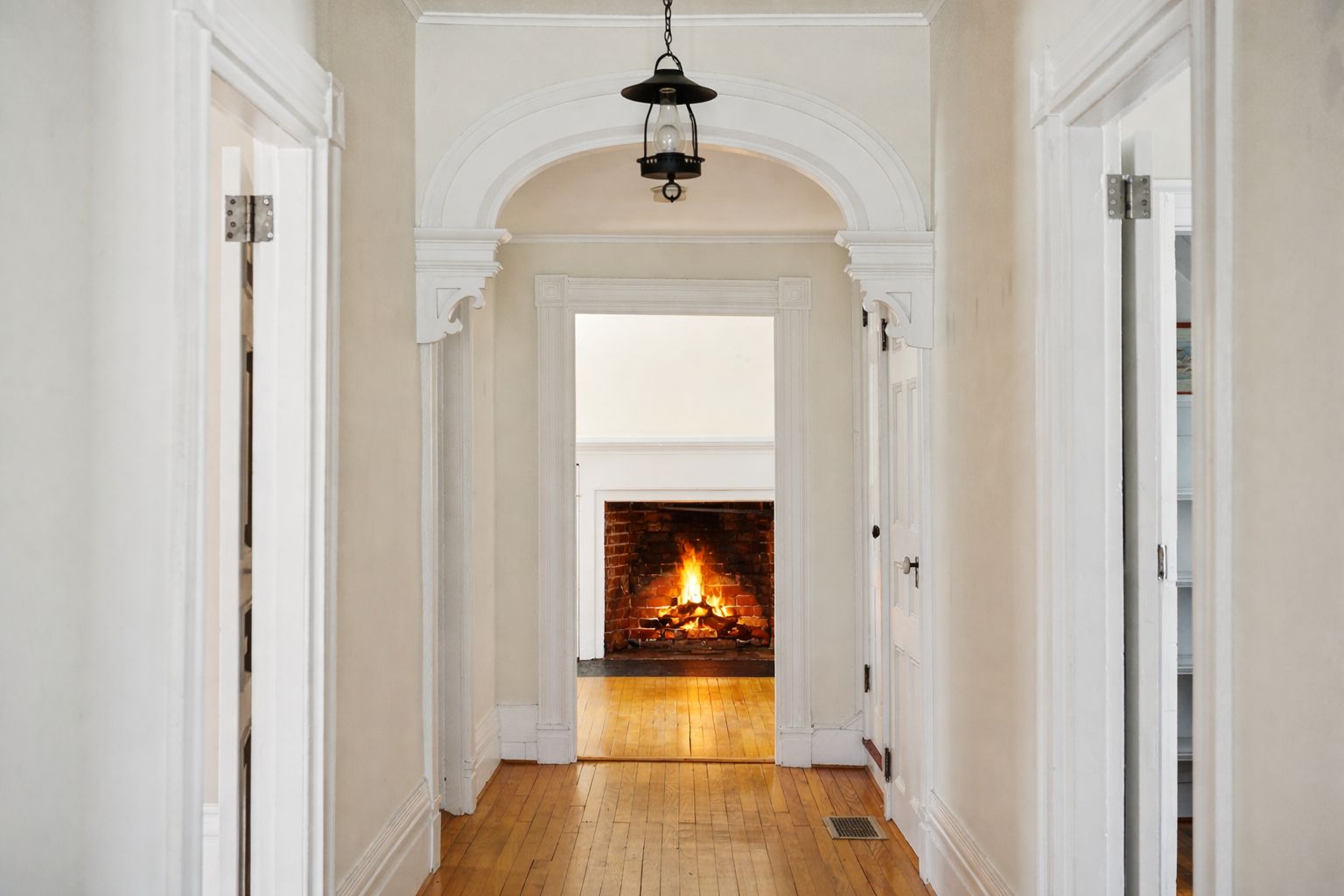 Set on an oversized 0.62-acre parcel, formed from the merger of two original lots, 338 Main Street occupies a distinguished position along Sag Harbor Village's coveted Captain's Row, directly across from Otter Pond with serene water views and private access via John Street. Upon entry, gracious Greek Revival and Italianate archways create a sense of arrival, guiding a central axis through the home toward an impressive fireplace. The interiors