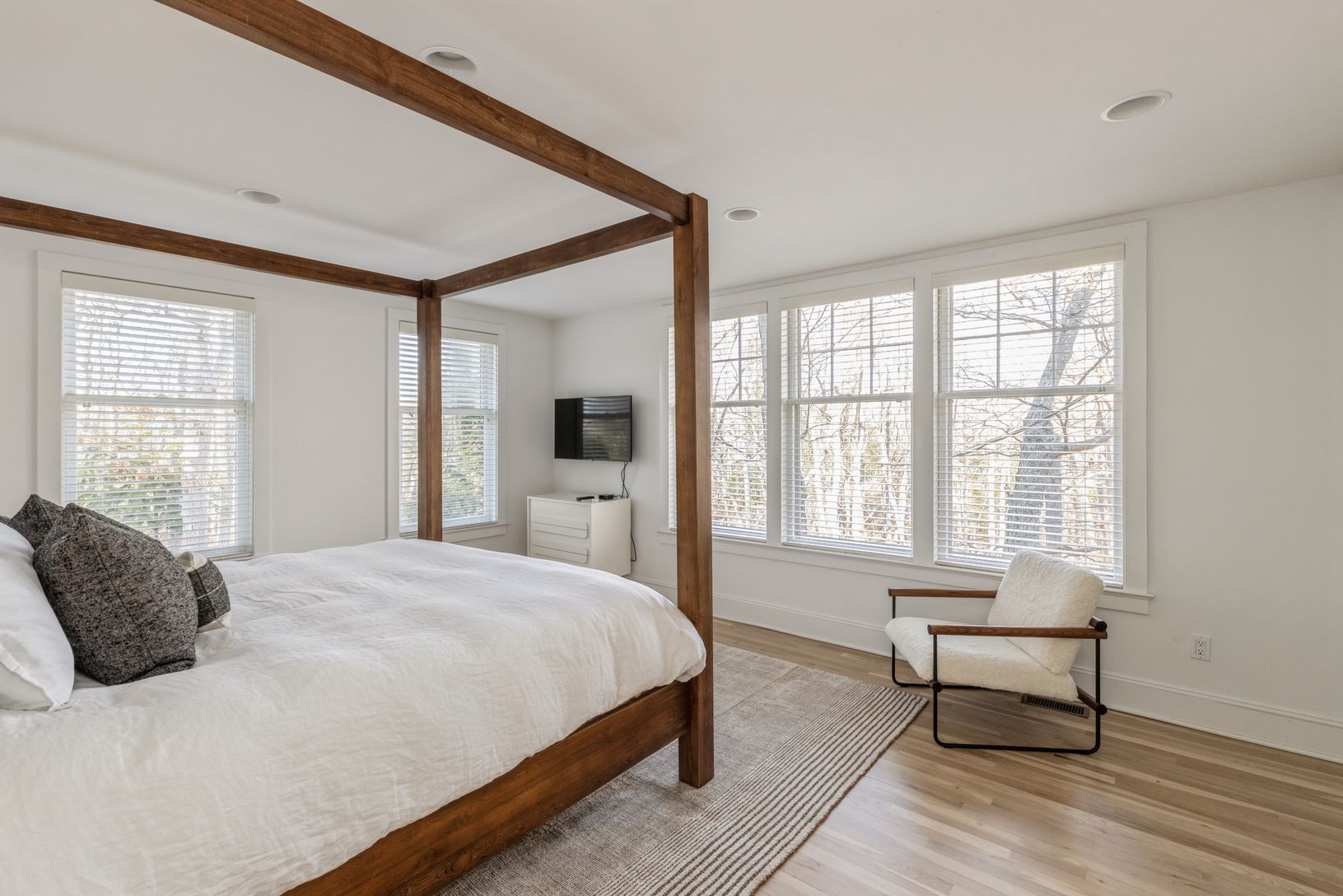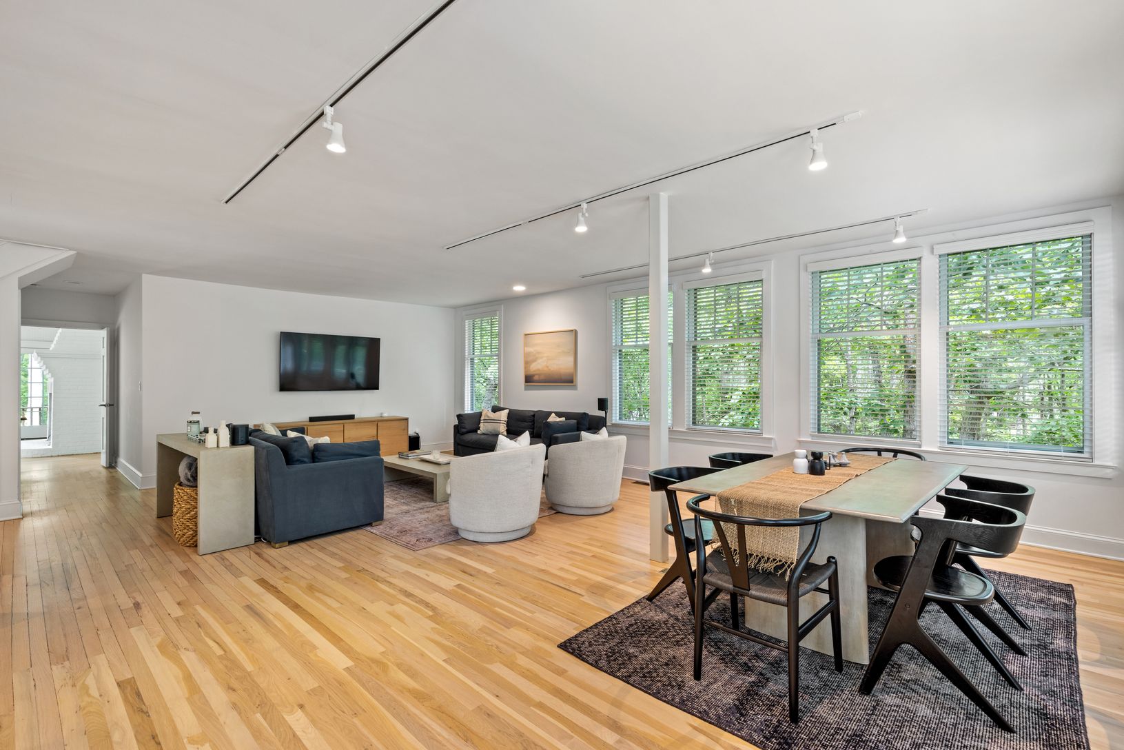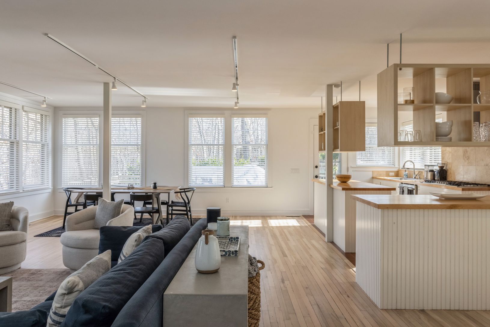 Arrive via a long private drive to this completely private country residence, minutes to the charming Village of Sag Harbor and blocks to local markets and stunning beach. An open, light-filled floor plan that includes the kitchen (5-burner Bosch stovetop and oven, ice maker, wine cooler), dining area and spacious sitting area as well as a first floor en suite primary bedroom, office, full bath and huge great room with cathedral ceiling and fi