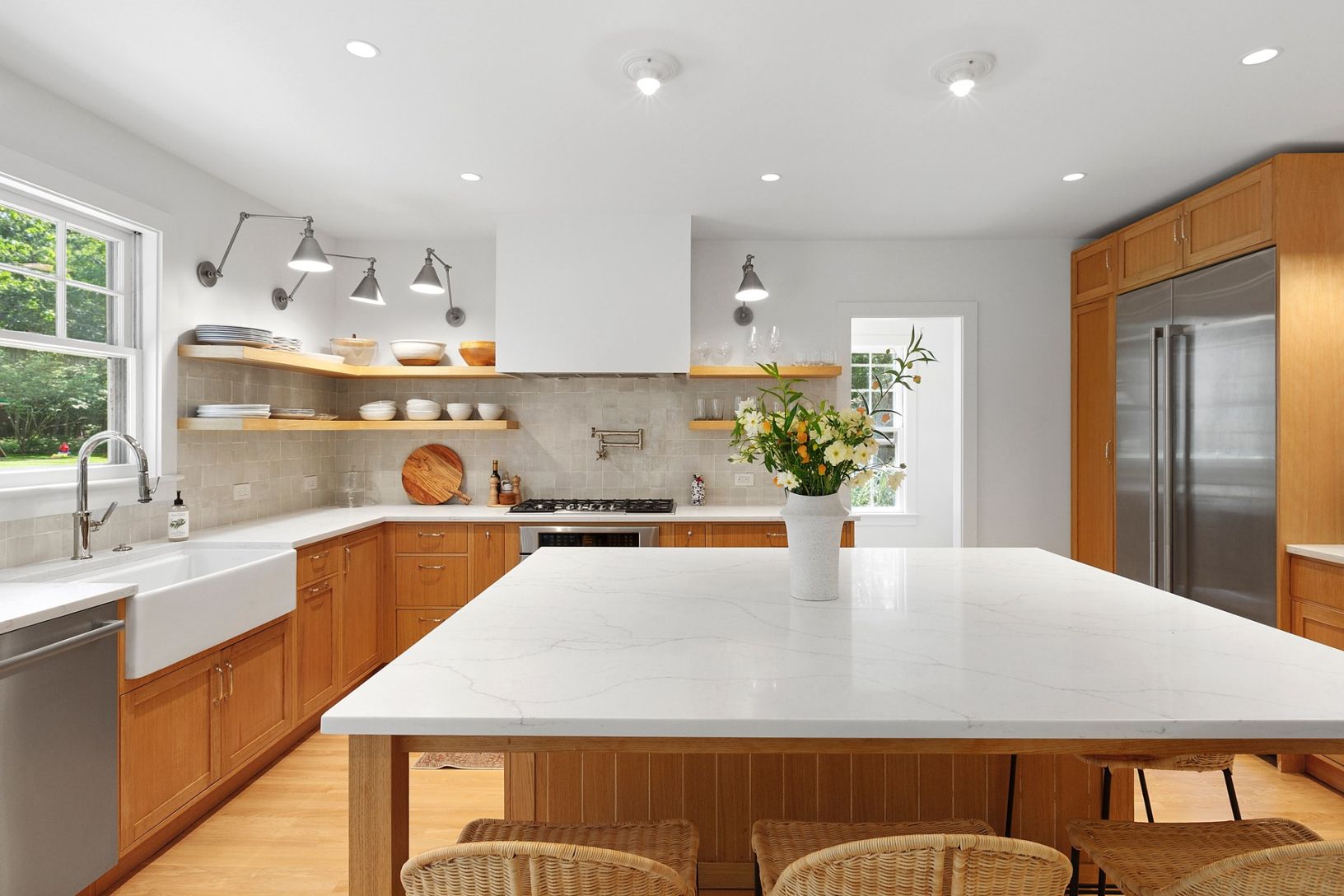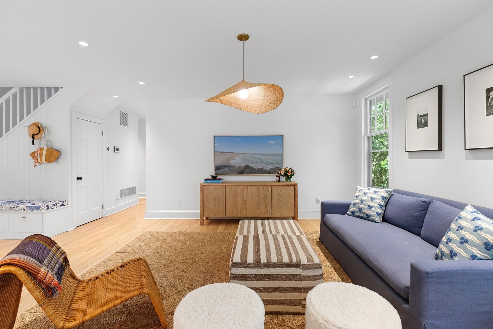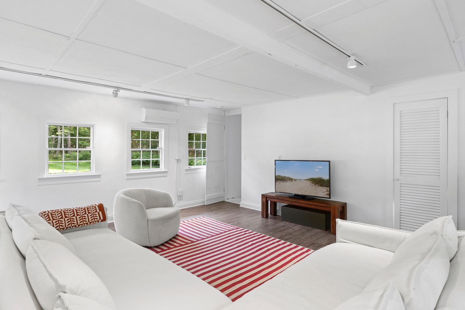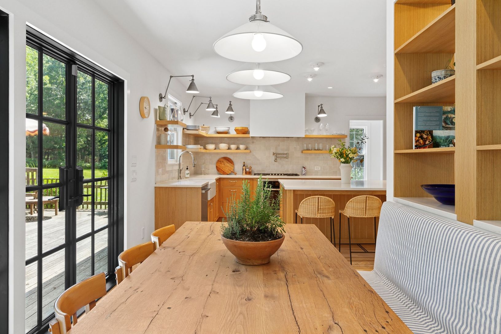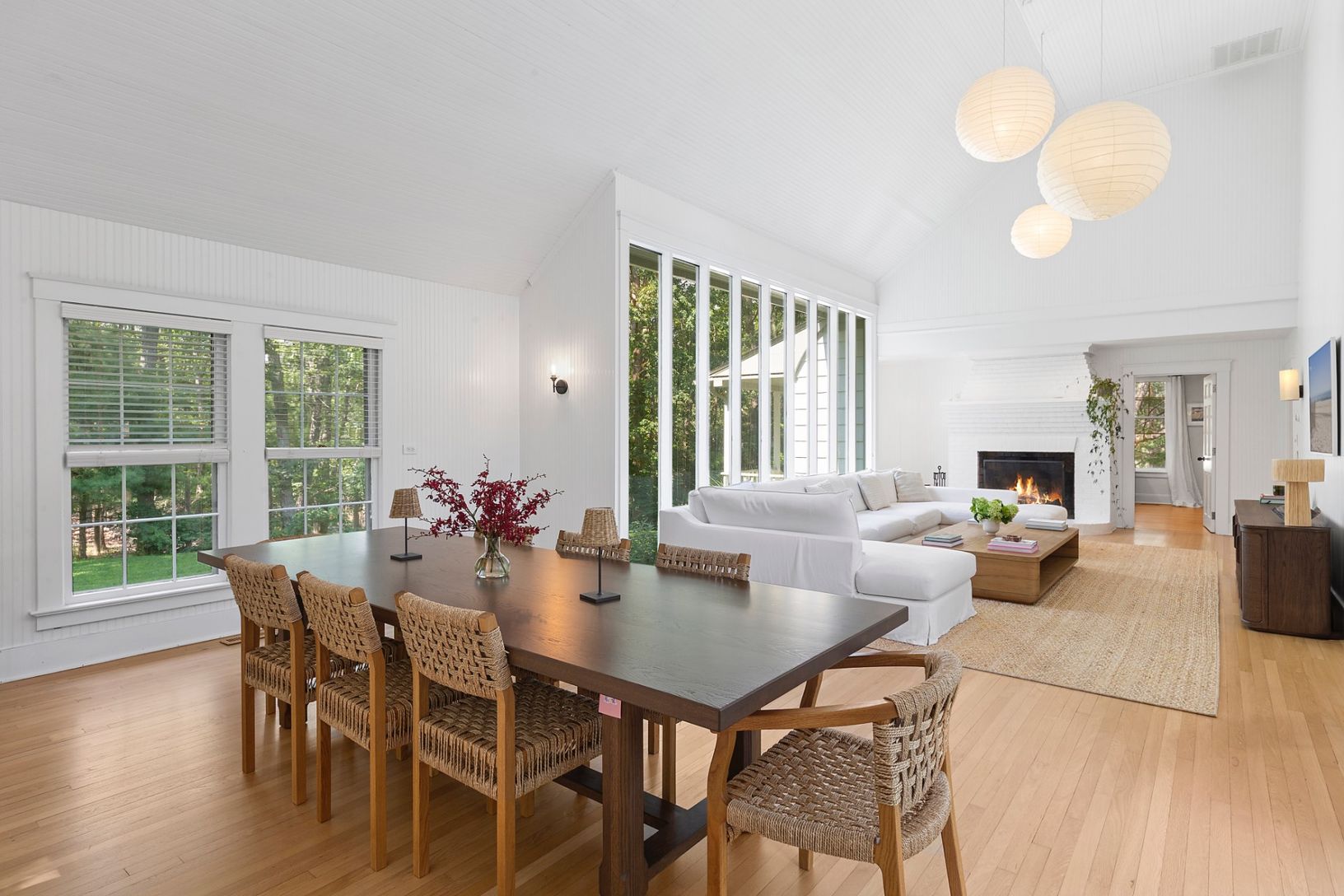 Welcome to the epitome of coastal contemporary living in Sag Harbor. Nestled on 4.2 private acres just minutes from Long Beach, this turnkey estate offers refined tranquility with timeless Hamptons elegance. The beautifully landscaped approach down a long, secluded driveway immediately sets the tone for this exceptional property. Boasting approximately 3,000 +/- sq. ft. across two spacious levels, the main residence features 4 bedrooms, 4 full