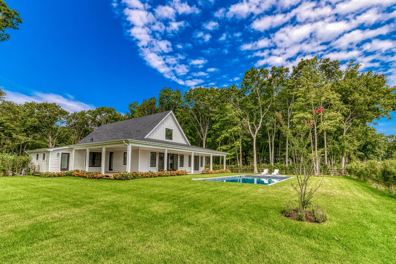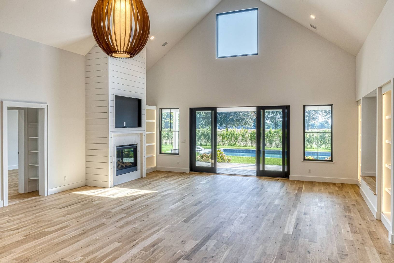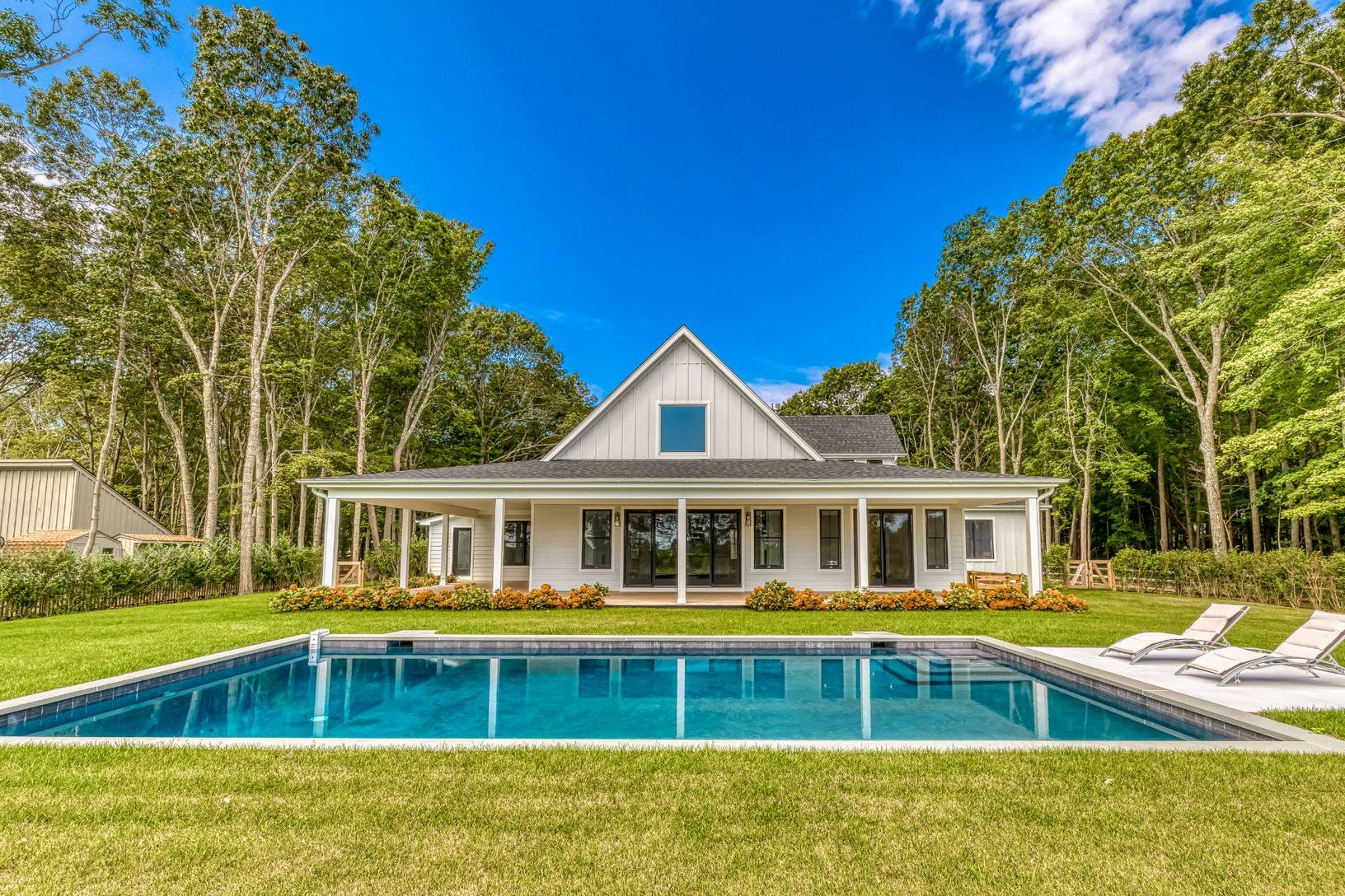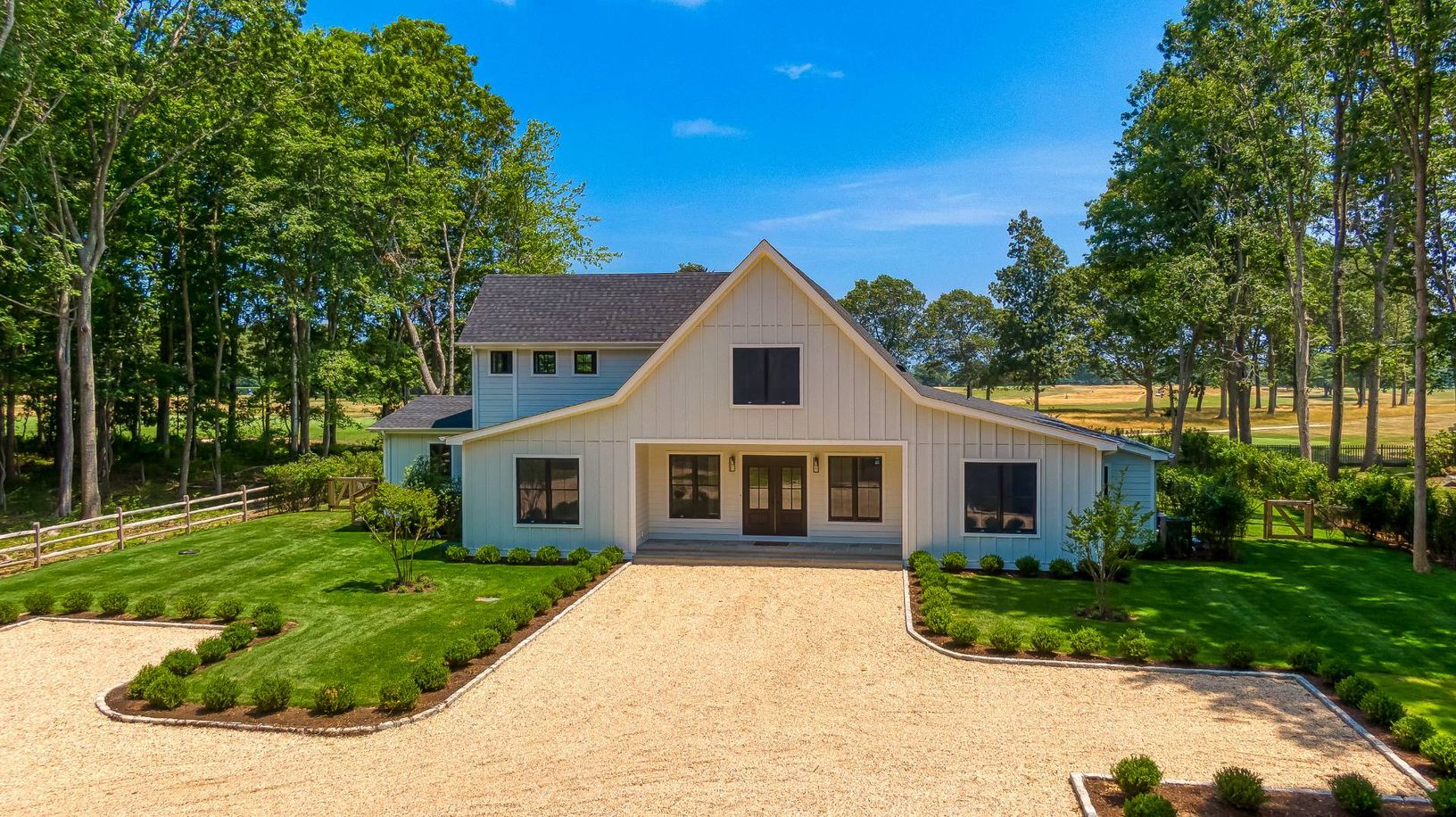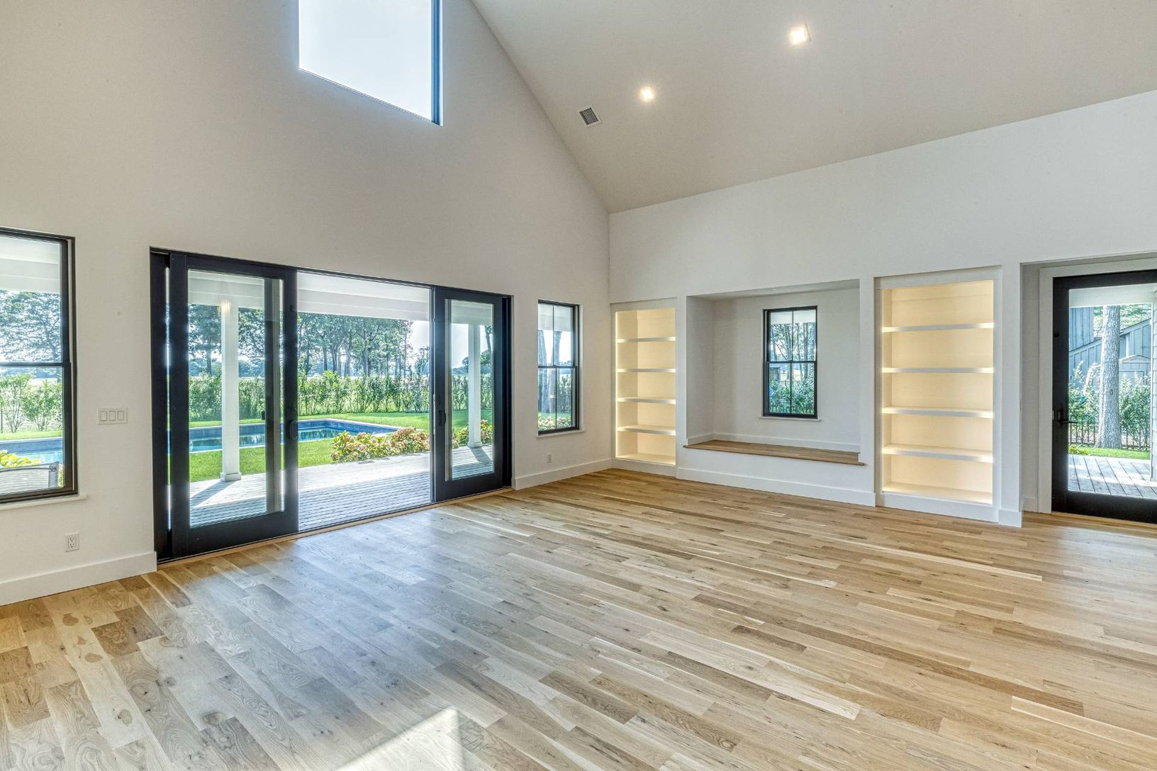 With completion by first week of May 2022, this new estate home on a shy acre bordering Gardiners Bay Country Club has highly appealing modernist nuances. Sited on the highest point of the property to capture glimpses of blue saltwater at Gardiners Bay, the entry offers a foyer with a gallery style wall and built-in cabinetry to display artwork. Just beyond the entry is an open concept with double height ceilings, teardrop shaped mid-century m