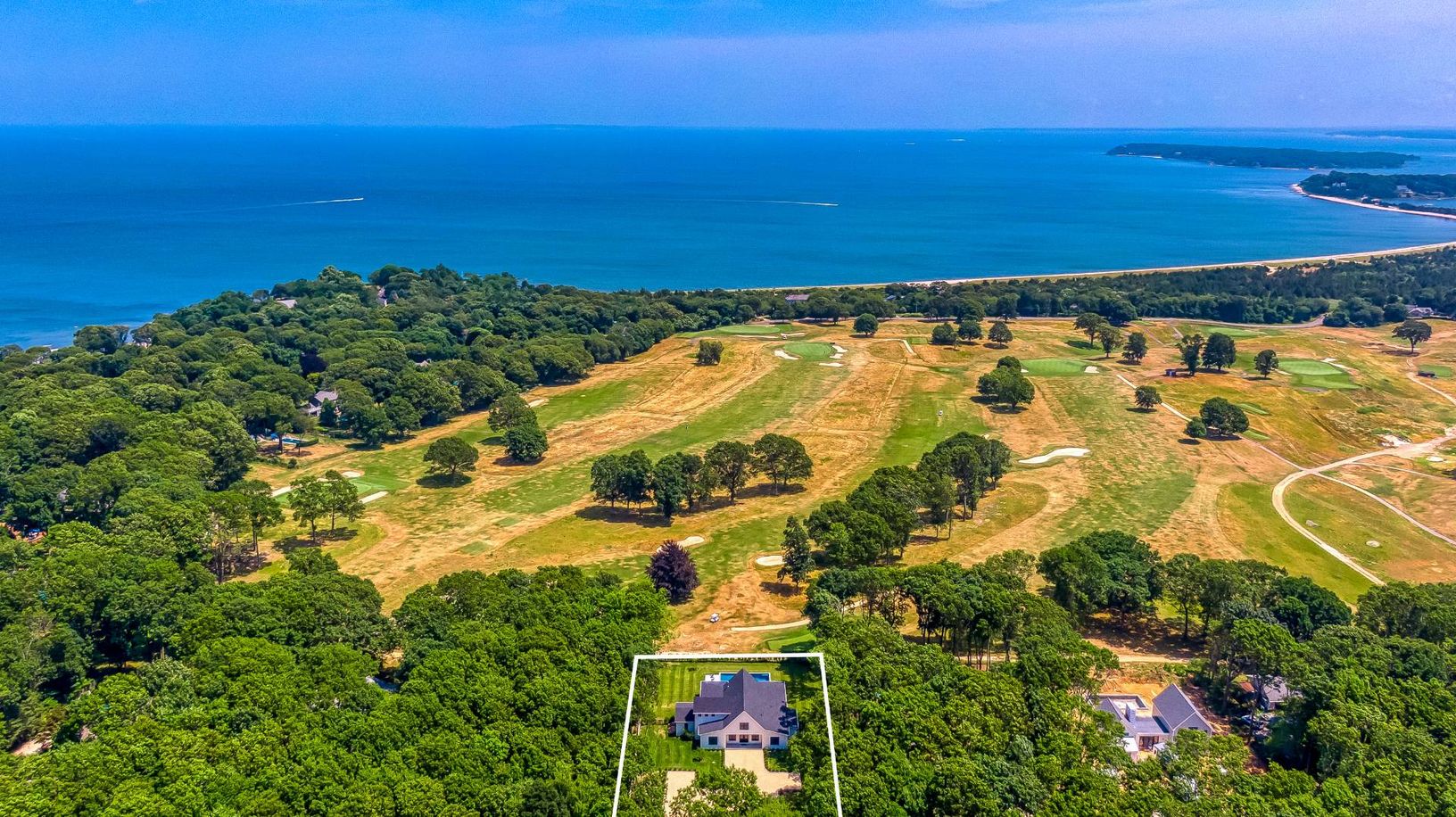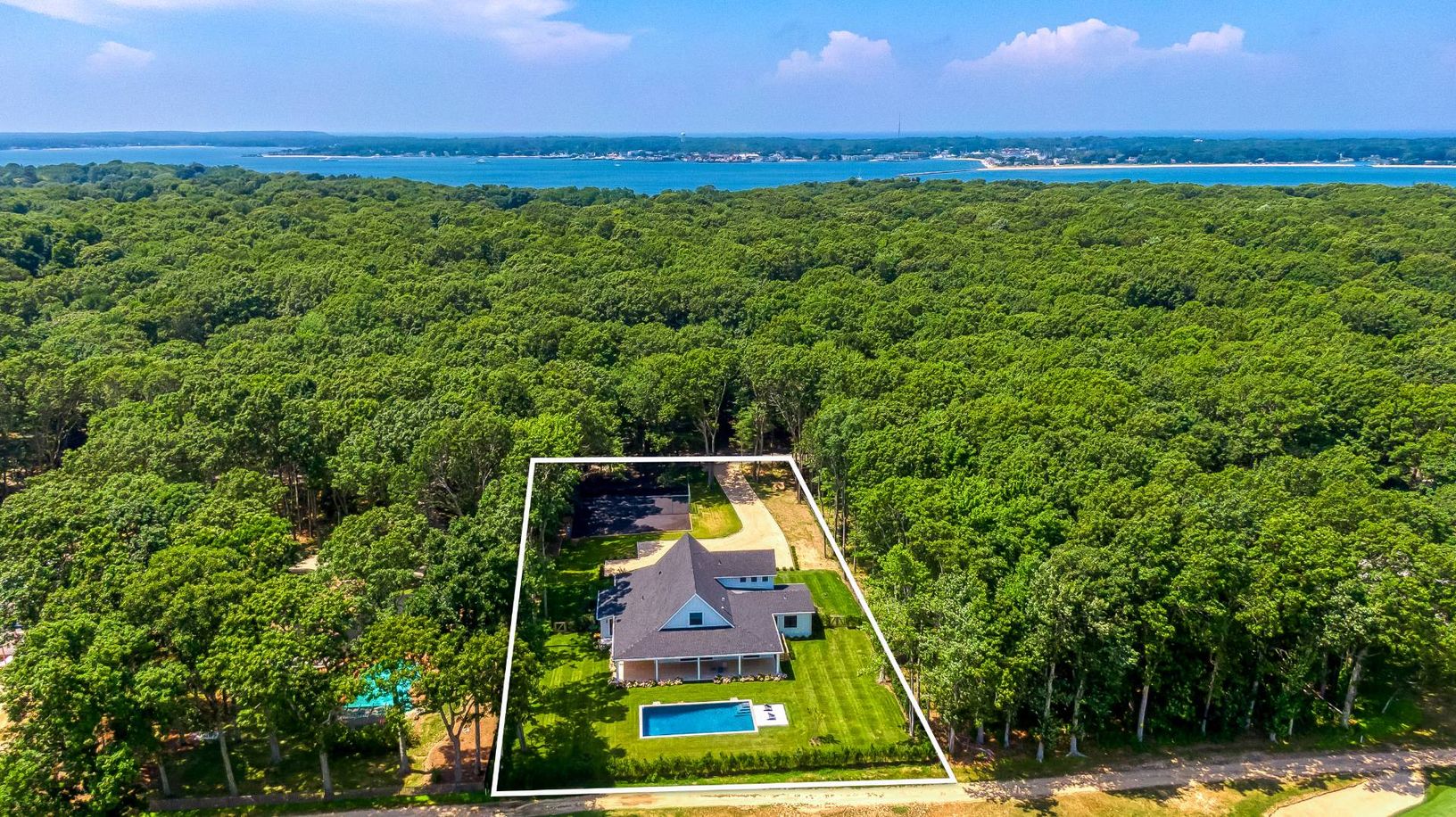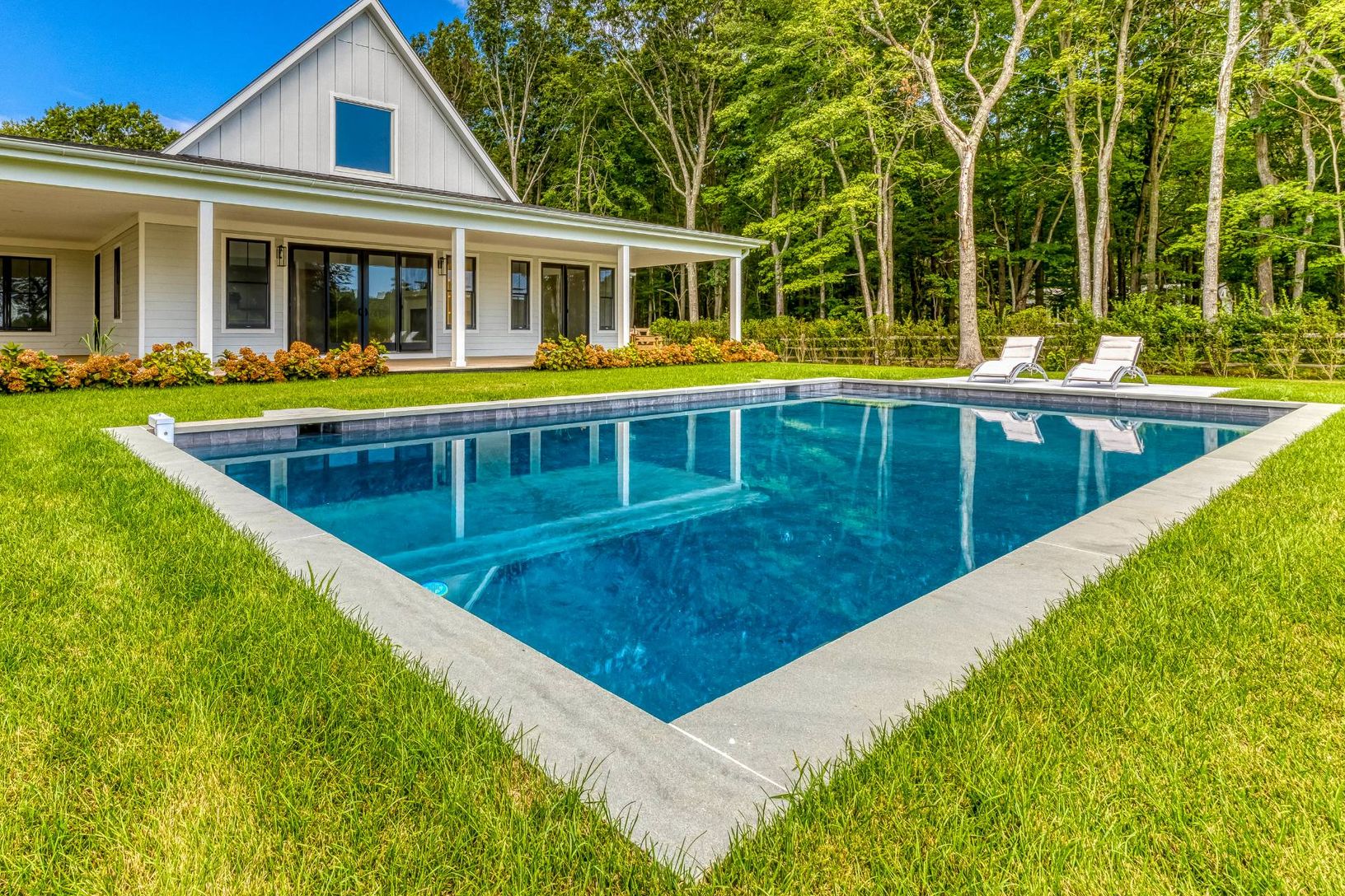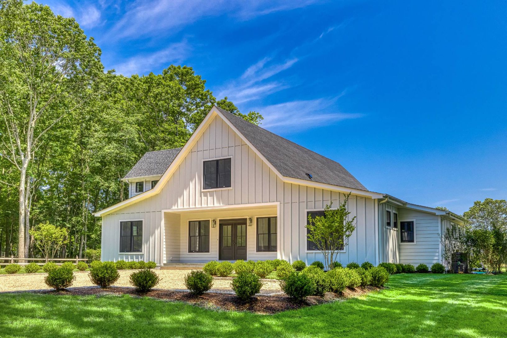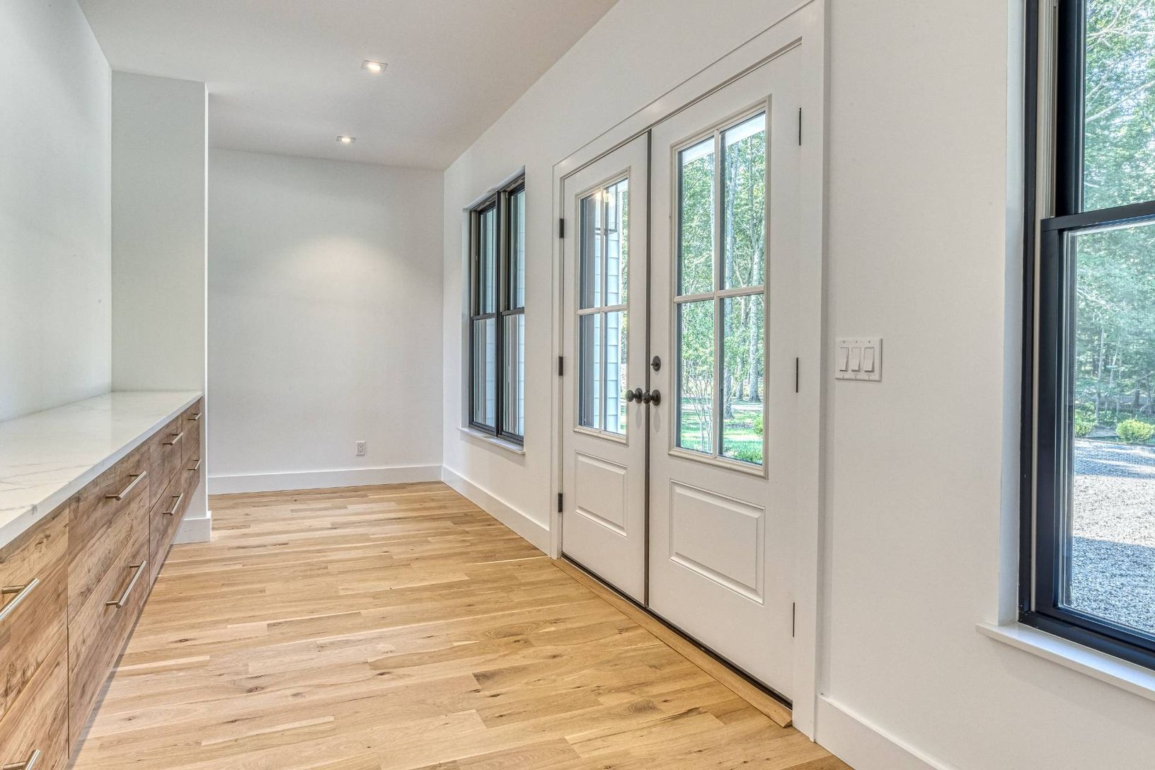 With completion by first week of May 2022, this new estate home on a shy acre bordering Gardiners Bay Country Club has highly appealing modernist nuances. Sited on the highest point of the property to capture glimpses of blue saltwater at Gardiners Bay, the entry offers a foyer with a gallery style wall and built-in cabinetry to display artwork. Just beyond the entry is an open concept with double height ceilings, teardrop shaped mid-century m