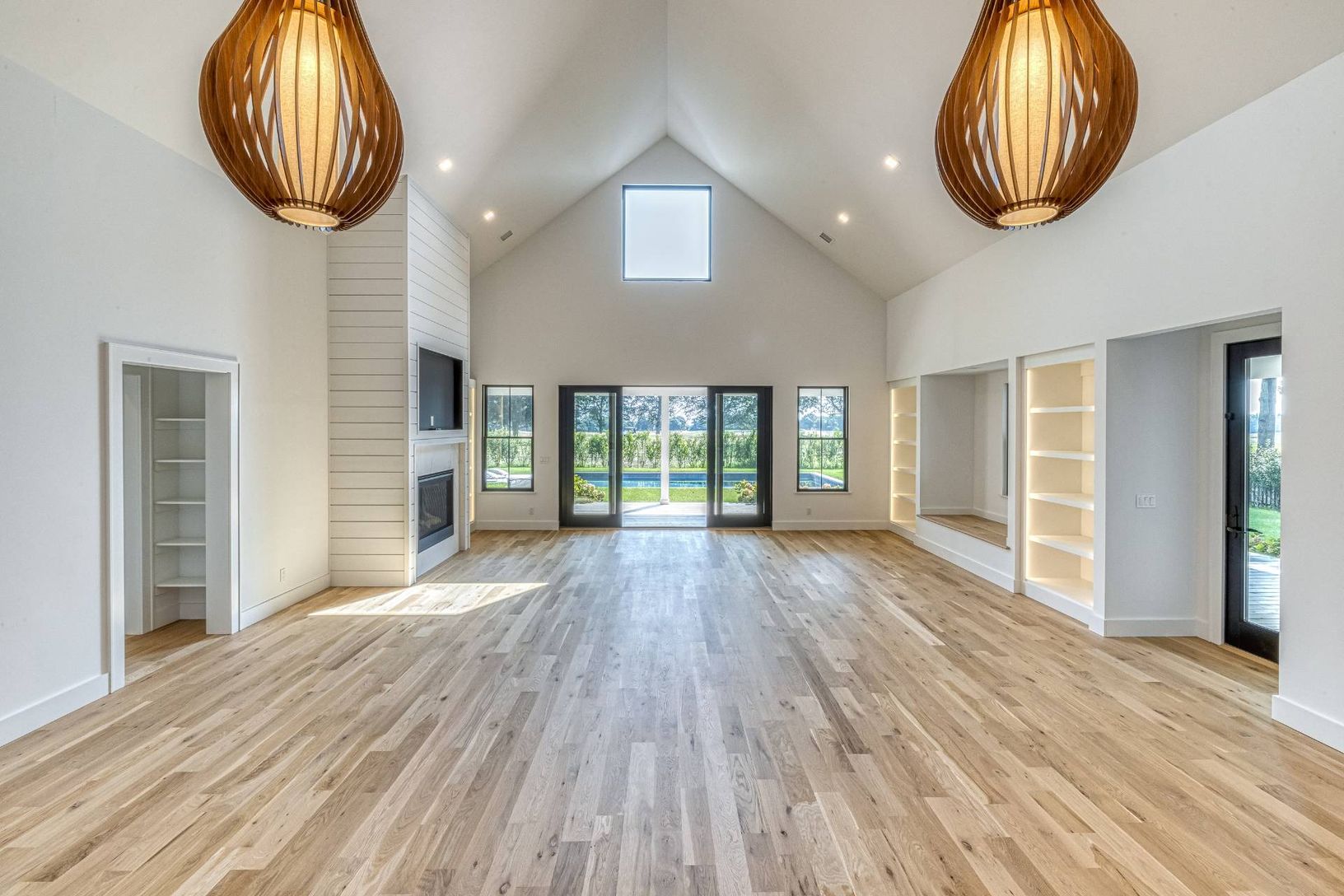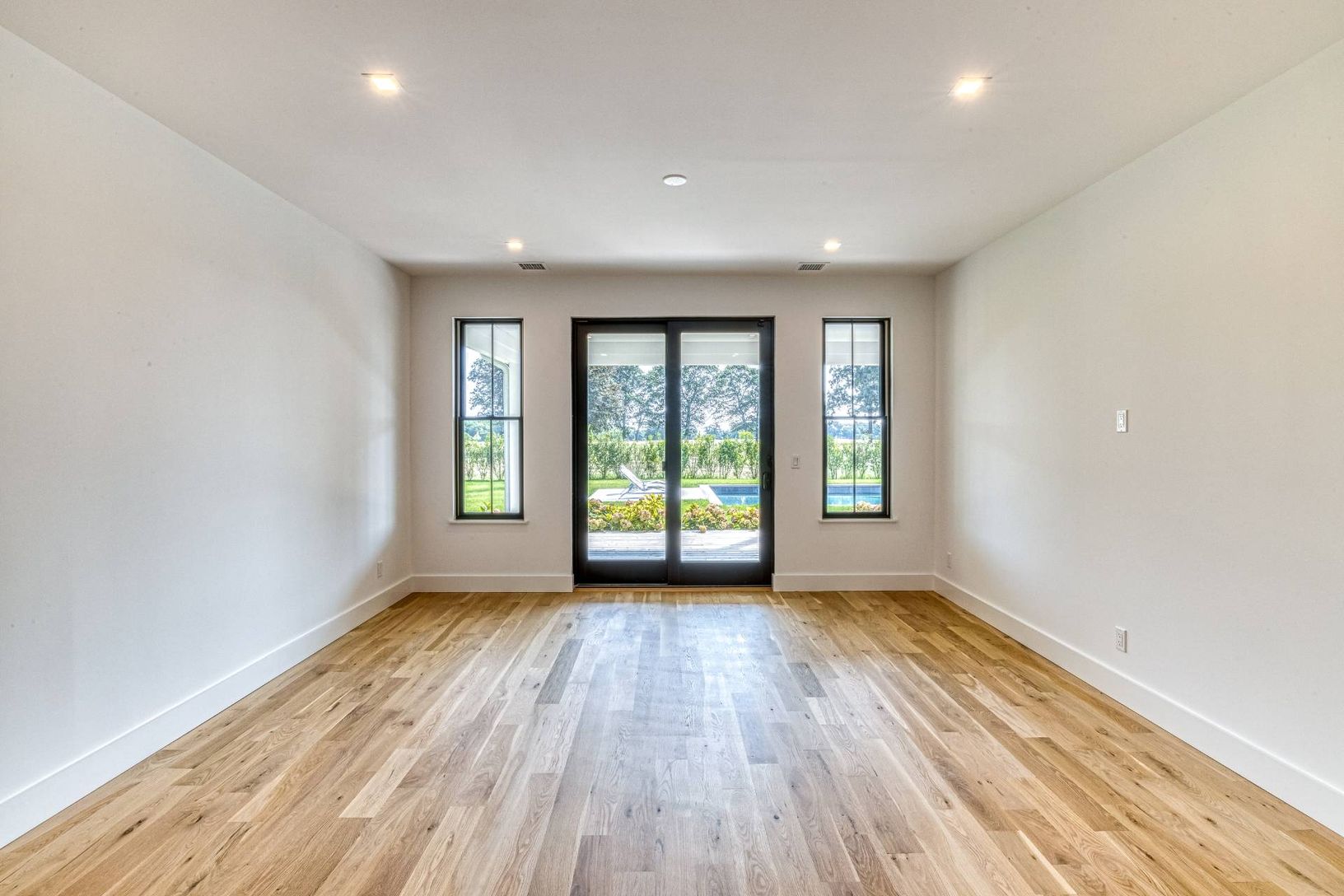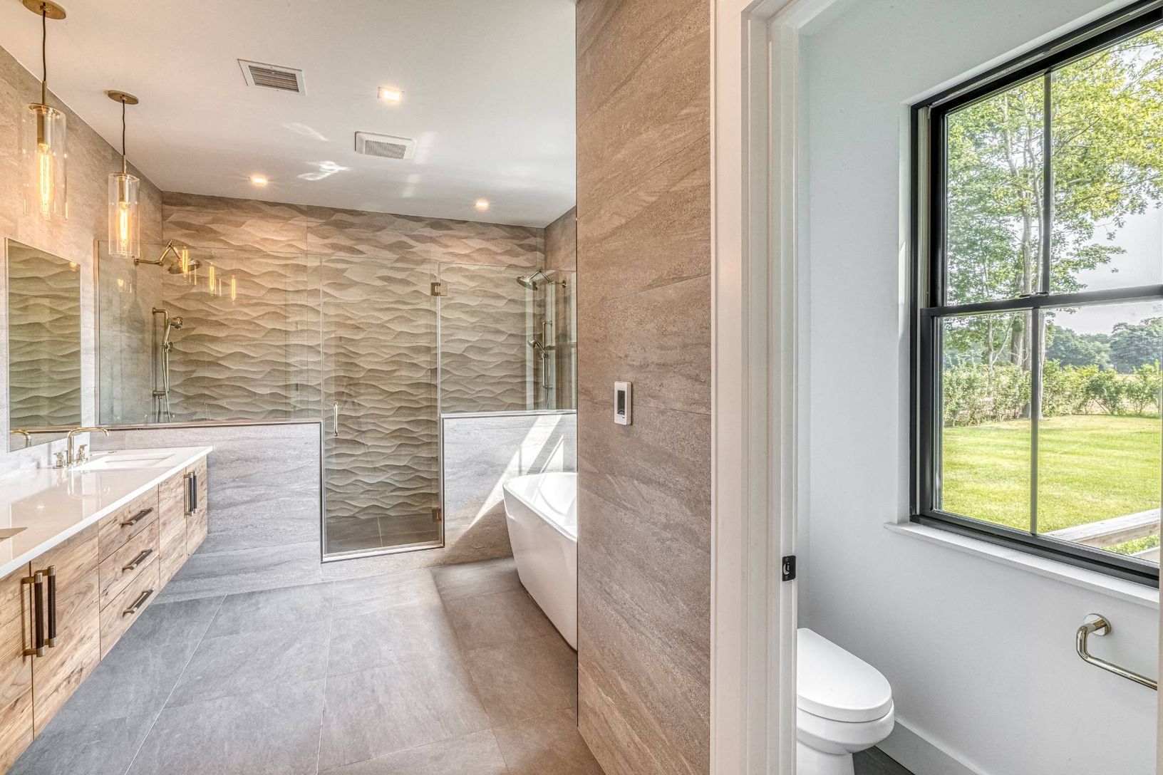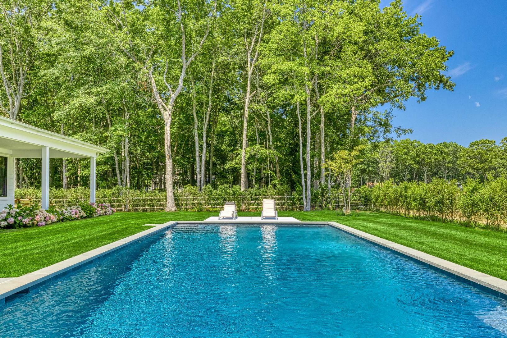 With completion by first week of May 2022, this new estate home on a shy acre bordering Gardiners Bay Country Club has highly appealing modernist nuances. Sited on the highest point of the property to capture glimpses of blue saltwater at Gardiners Bay, the entry offers a foyer with a gallery style wall and built-in cabinetry to display artwork. Just beyond the entry is an open concept with double height ceilings, teardrop shaped mid-century m