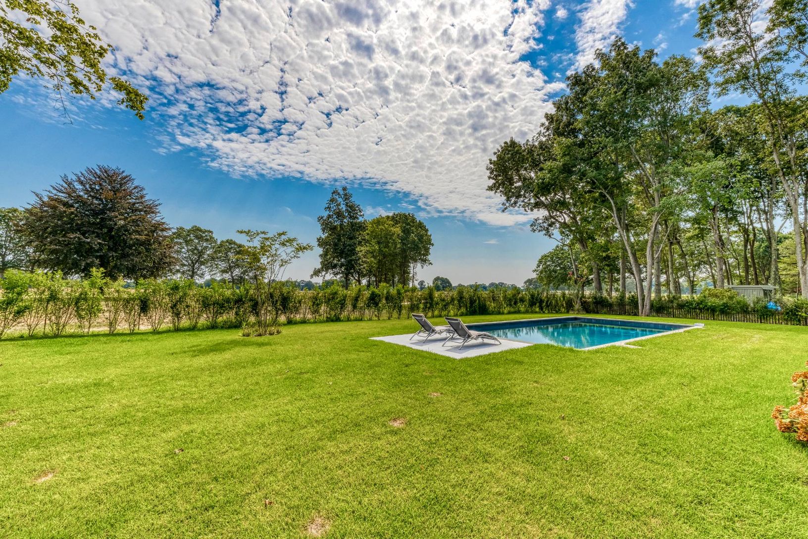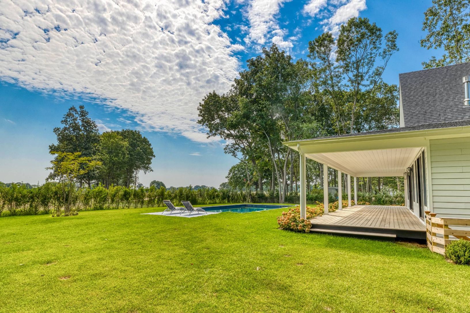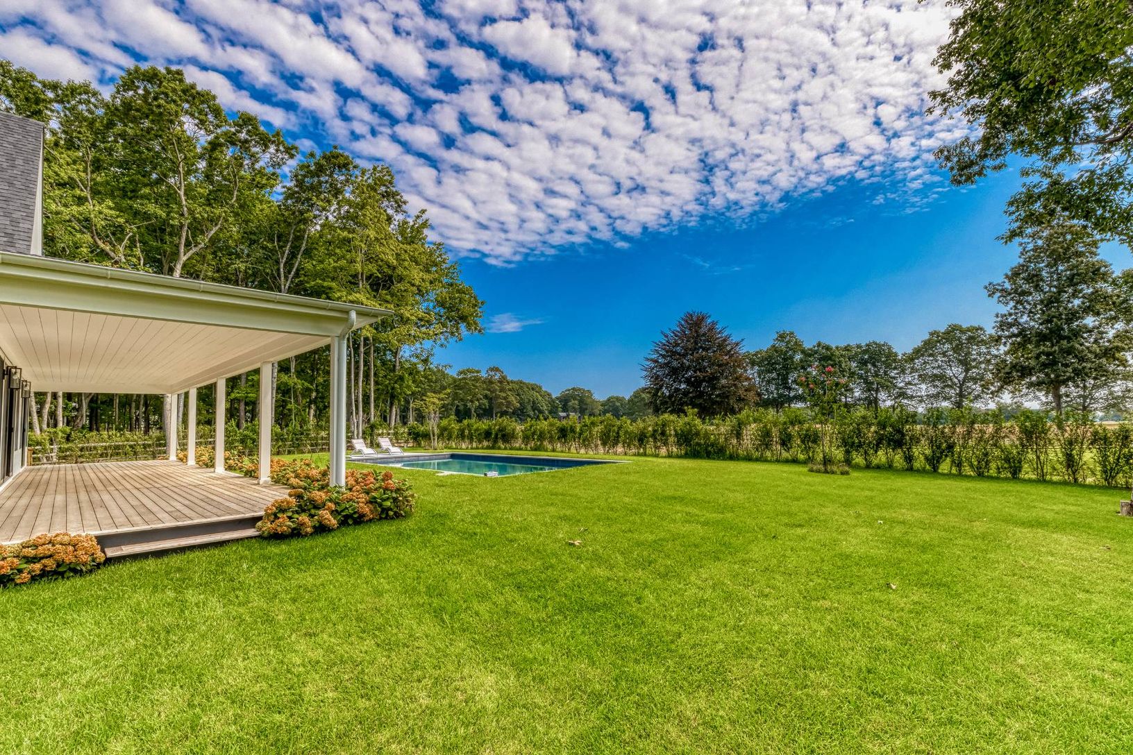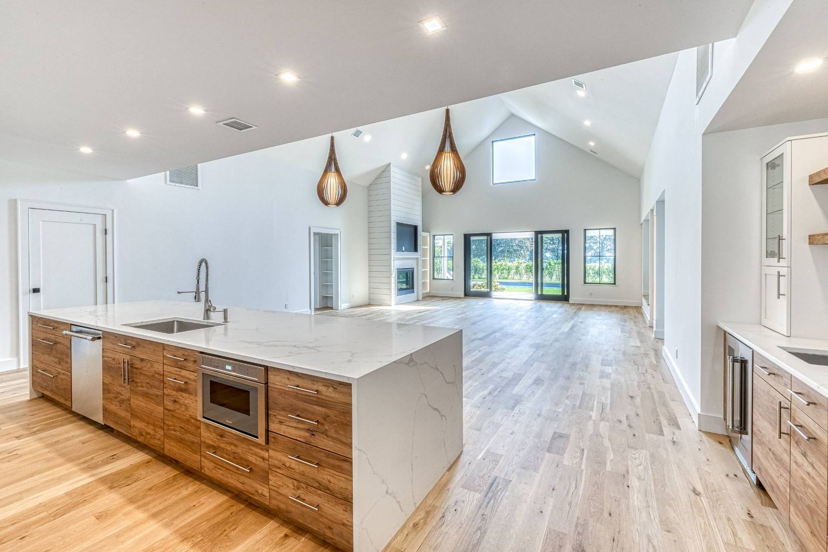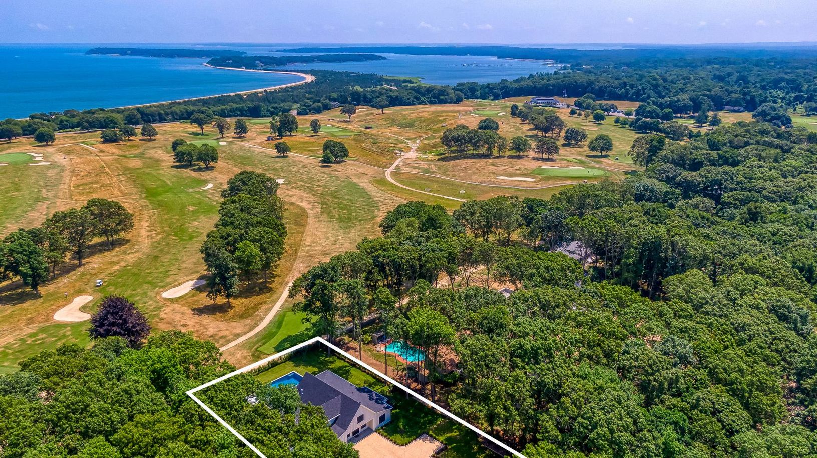 With completion by first week of May 2022, this new estate home on a shy acre bordering Gardiners Bay Country Club has highly appealing modernist nuances. Sited on the highest point of the property to capture glimpses of blue saltwater at Gardiners Bay, the entry offers a foyer with a gallery style wall and built-in cabinetry to display artwork. Just beyond the entry is an open concept with double height ceilings, teardrop shaped mid-century m