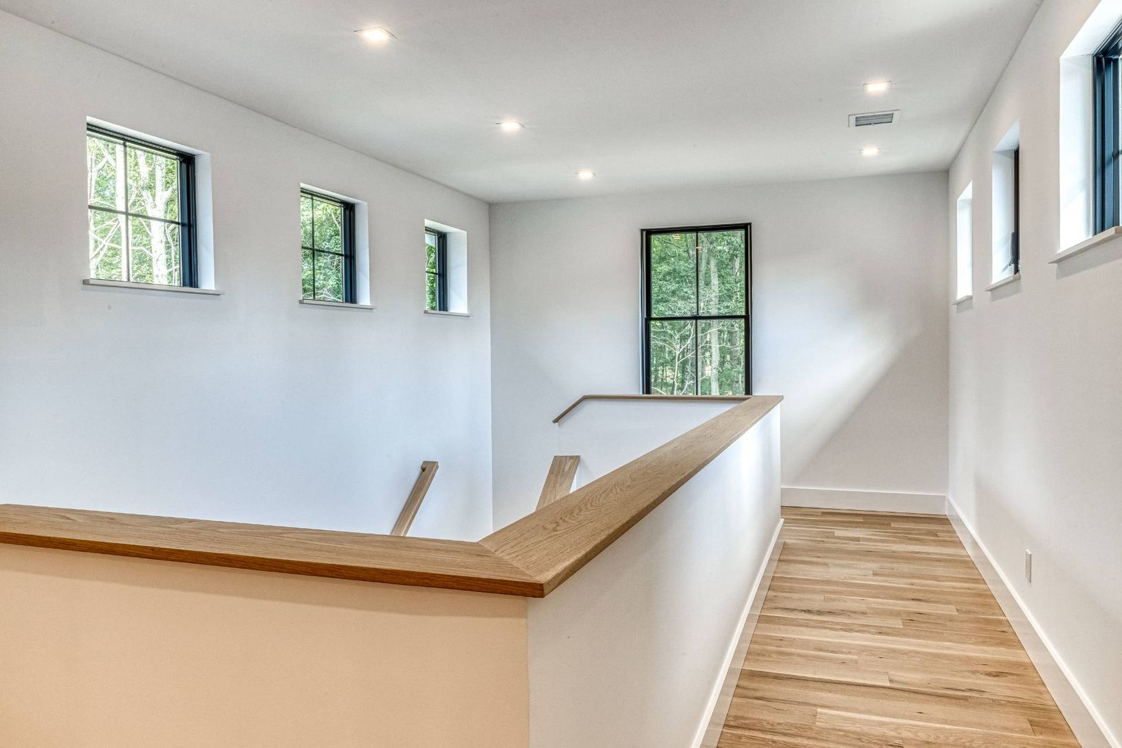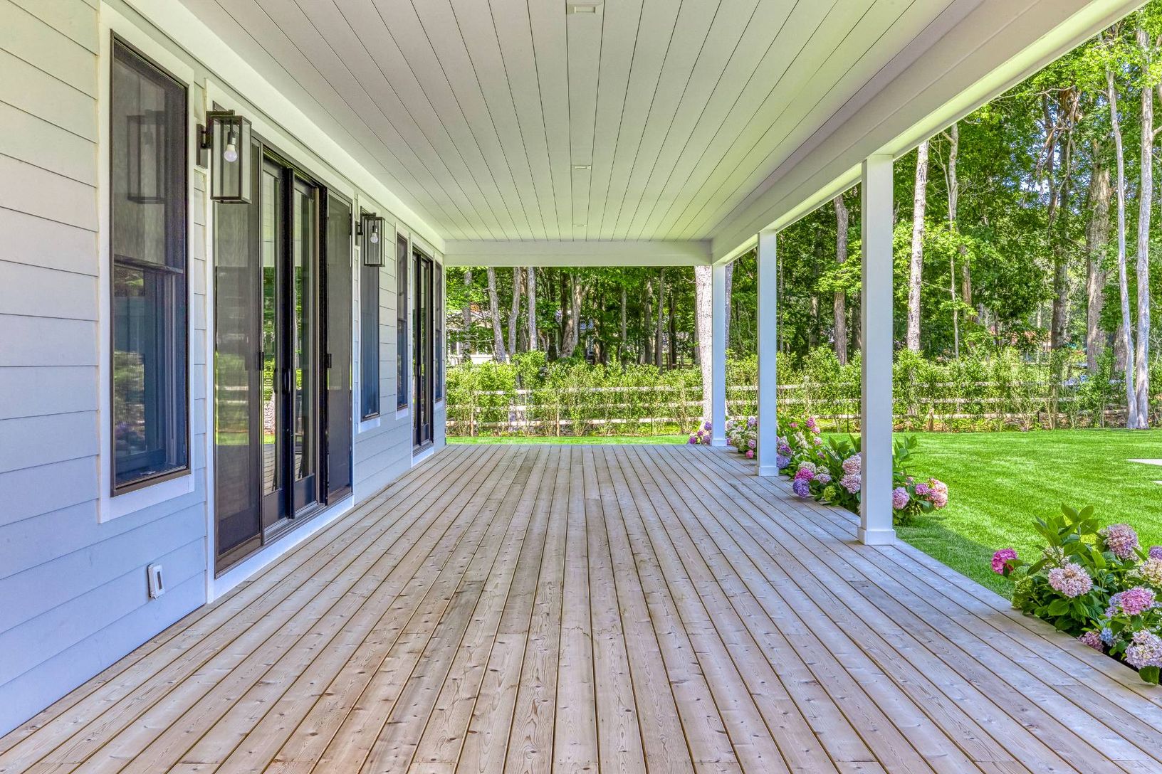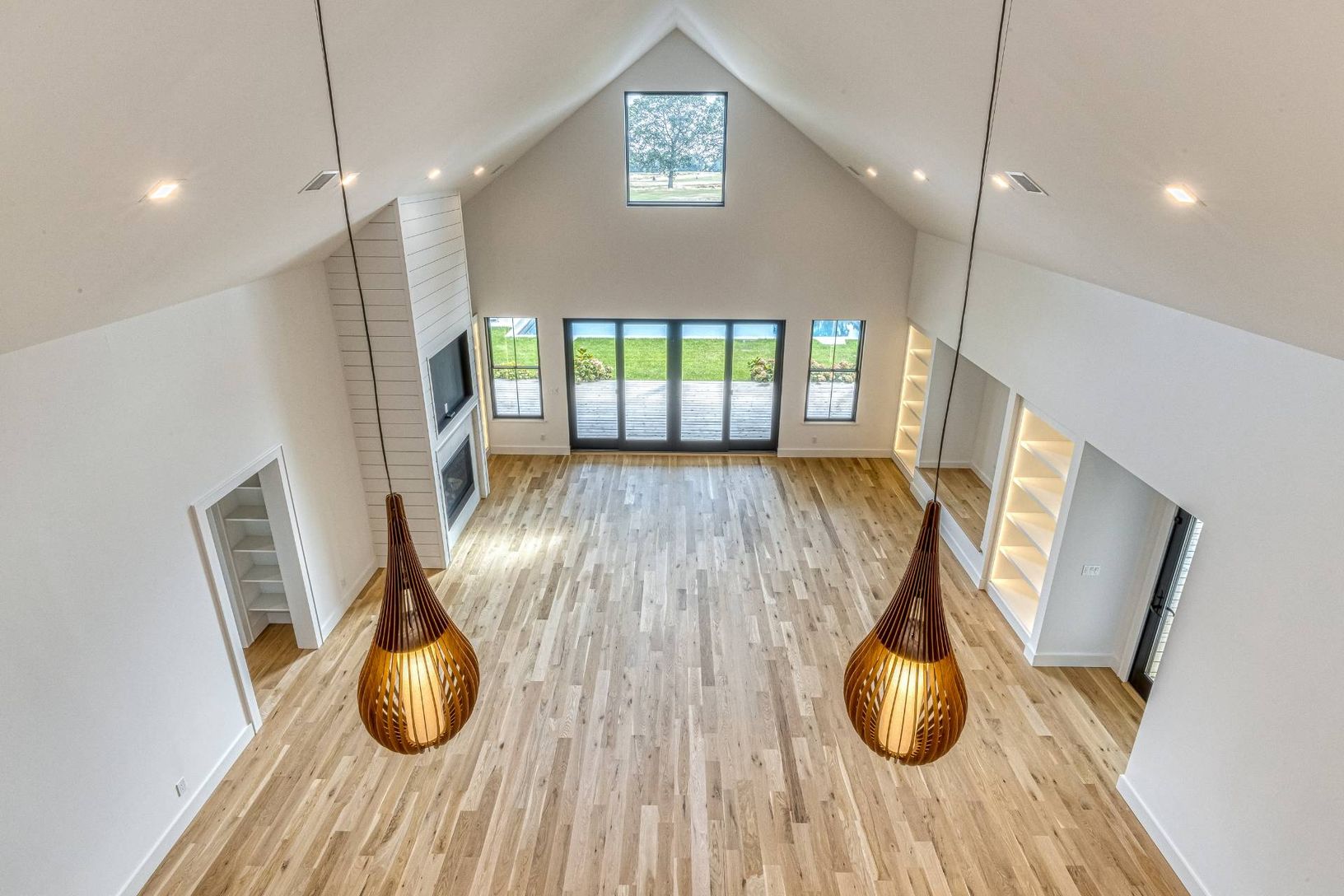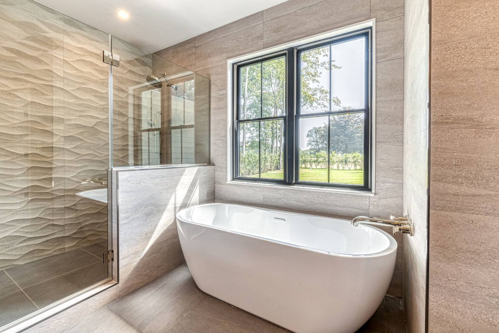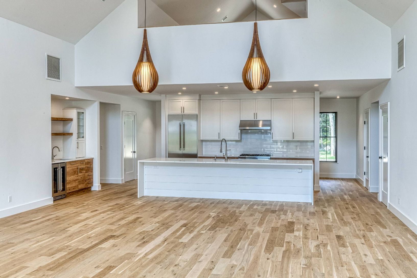 With completion by first week of May 2022, this new estate home on a shy acre bordering Gardiners Bay Country Club has highly appealing modernist nuances. Sited on the highest point of the property to capture glimpses of blue saltwater at Gardiners Bay, the entry offers a foyer with a gallery style wall and built-in cabinetry to display artwork. Just beyond the entry is an open concept with double height ceilings, teardrop shaped mid-century m