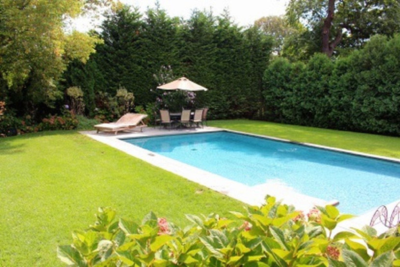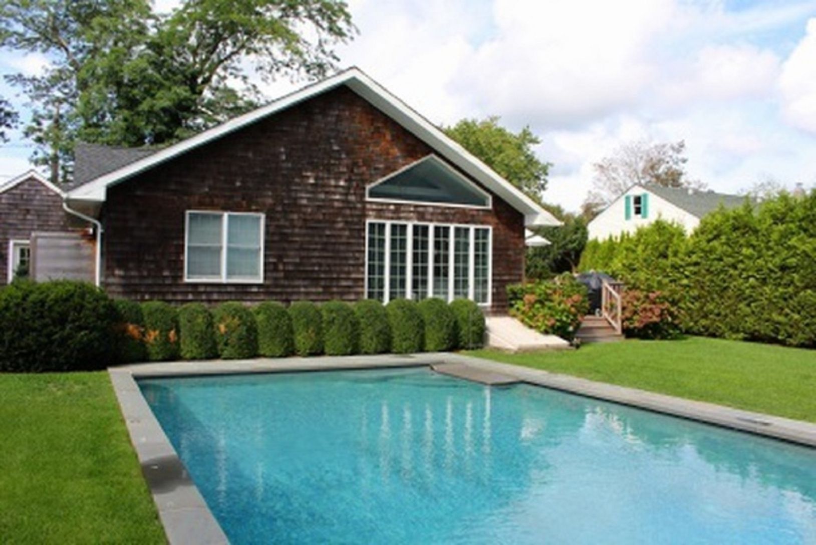 Bright, perfect for a summer getaway in the Hamptons. This one level ranch offers an open living area with fireplace, dining room and living room, plus updated kitchen. The Master Bedroom and one guest bedroom are En Suite. The third bedroom has bunk beds for the kids. Also, a heated Gunite pool (with safety fence if needed) and outdoor shower. Offering privacy and proximity to village shopping, dining, and fabulous beaches! available