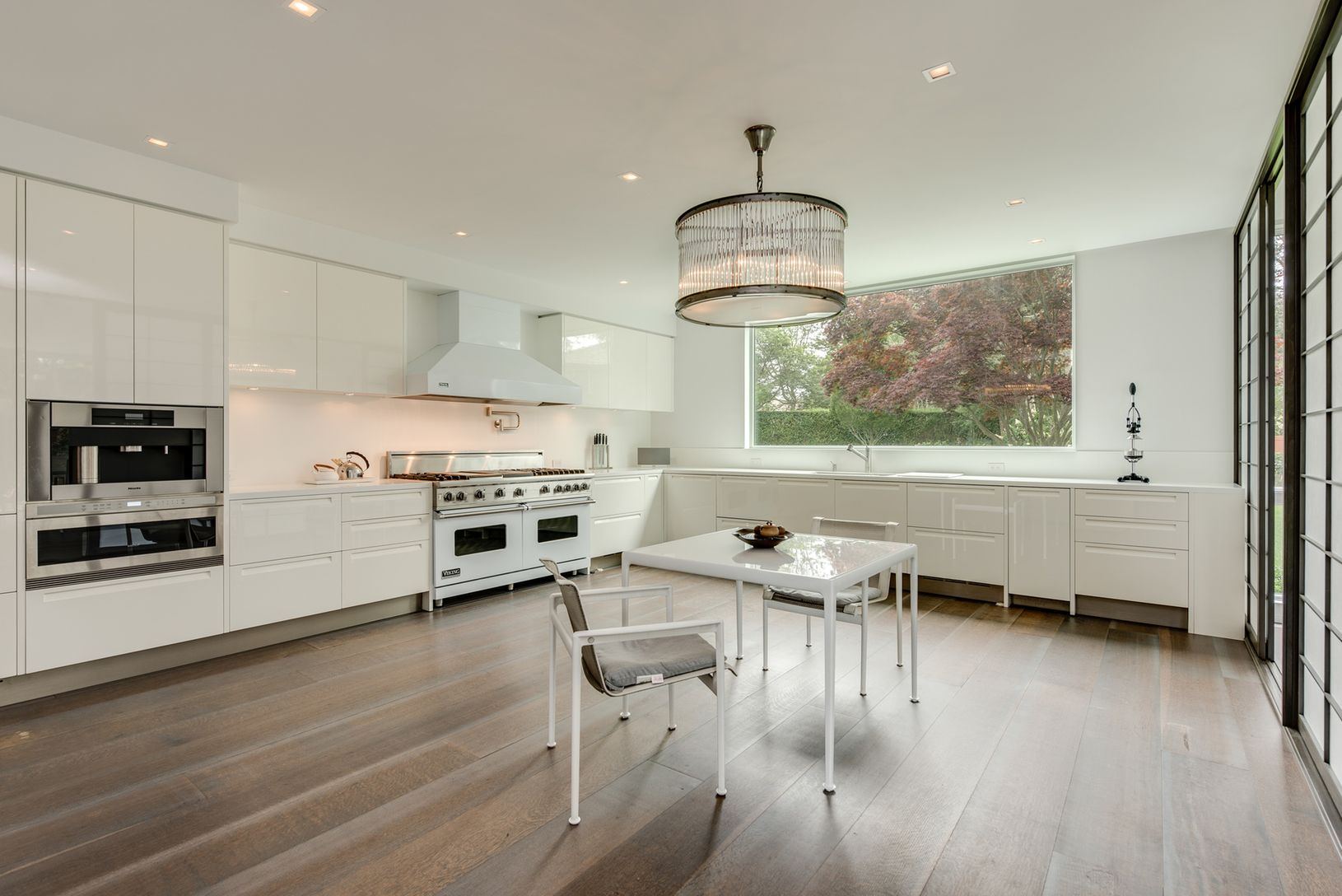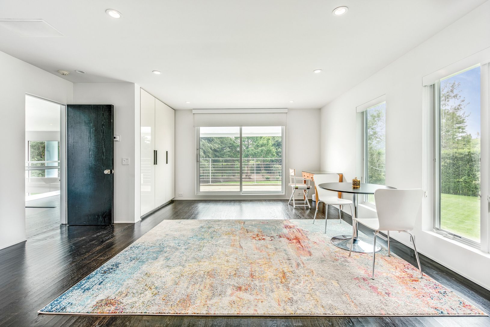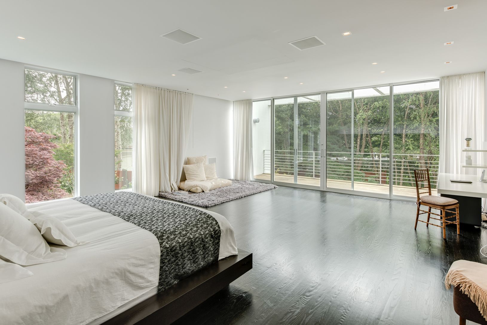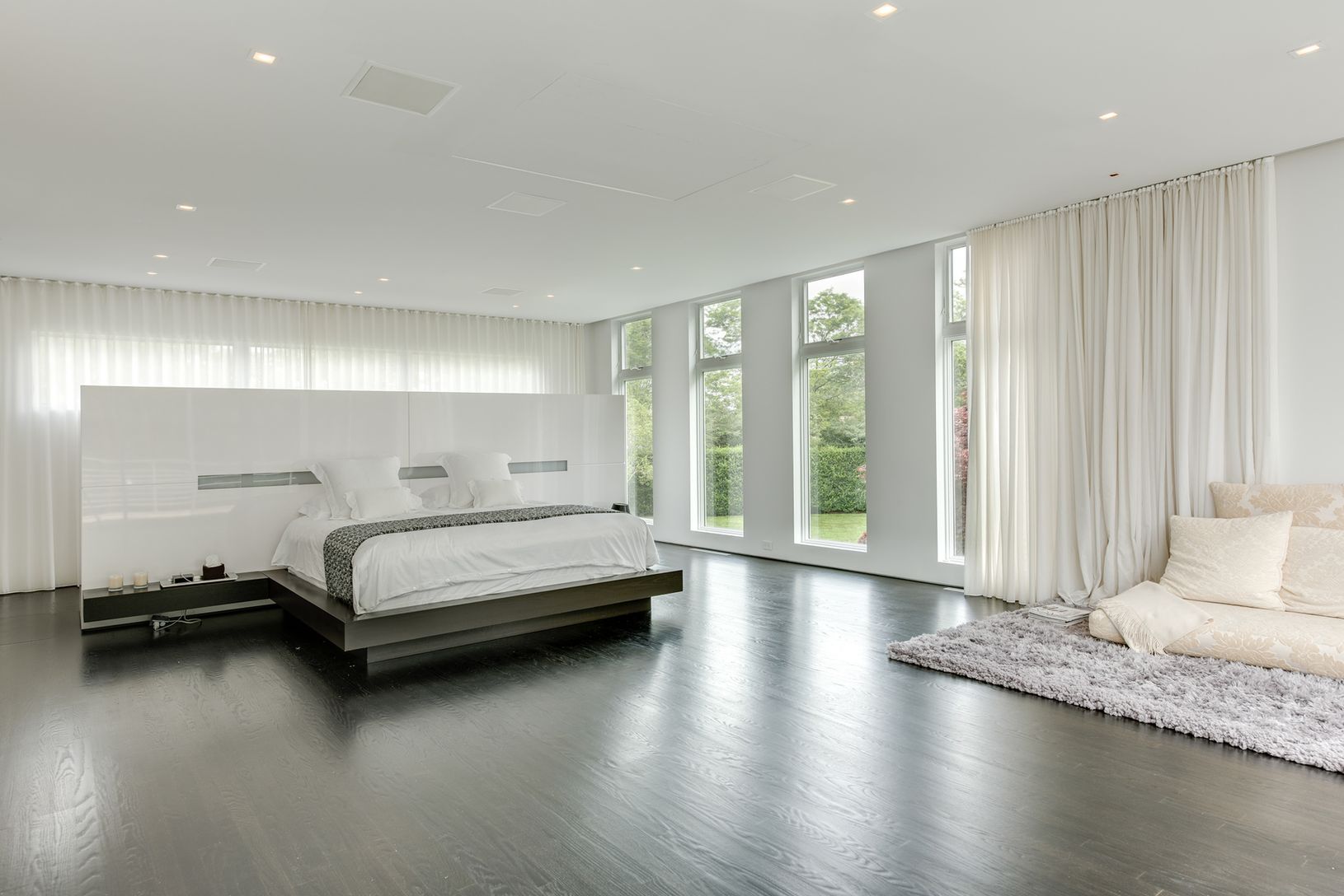 Far south in Sagaponack this recently renovated 6,500+/- sq. ft. modern home in a quiet, private setting on 1.4+/- acres is light, bright and comfortable. Expanses of glass doors and large windows across the rear of the home on both first and second floors flood the interiors with light and showcase the serene and verdant grounds. White walls, ceilings and finishings played against wide plank wood floors provide a pristine setting for entertai