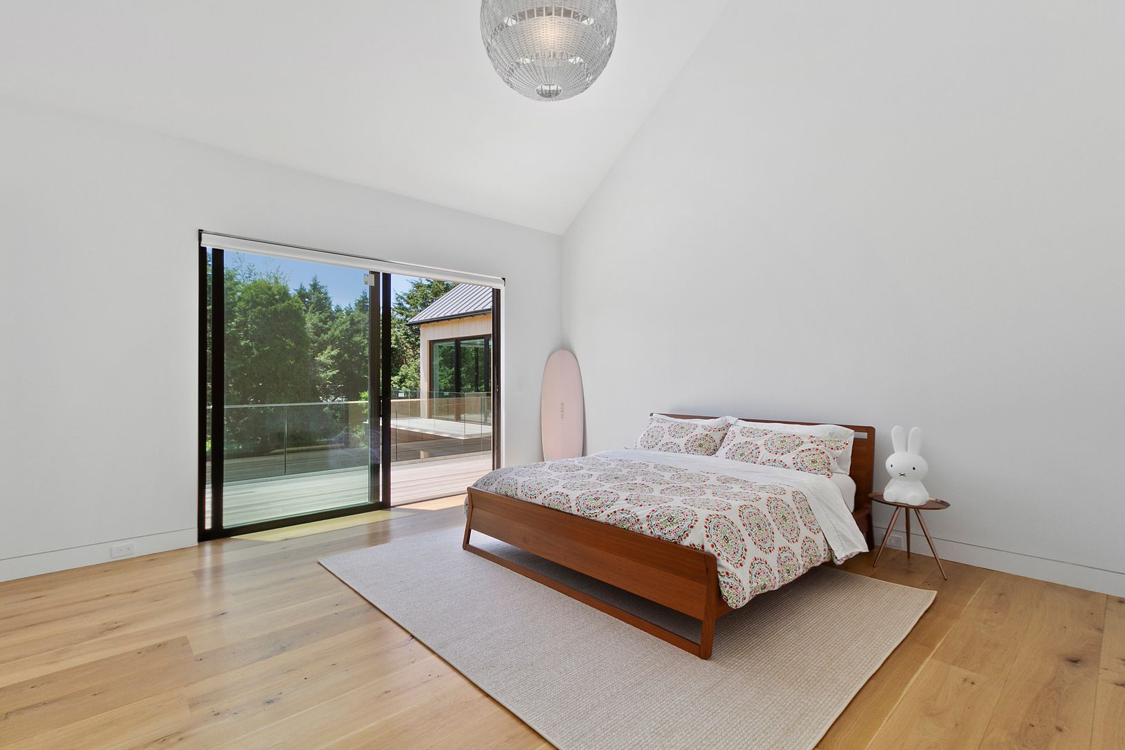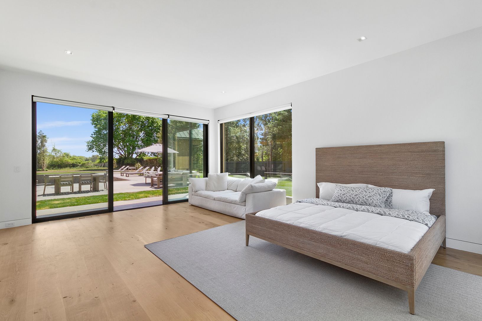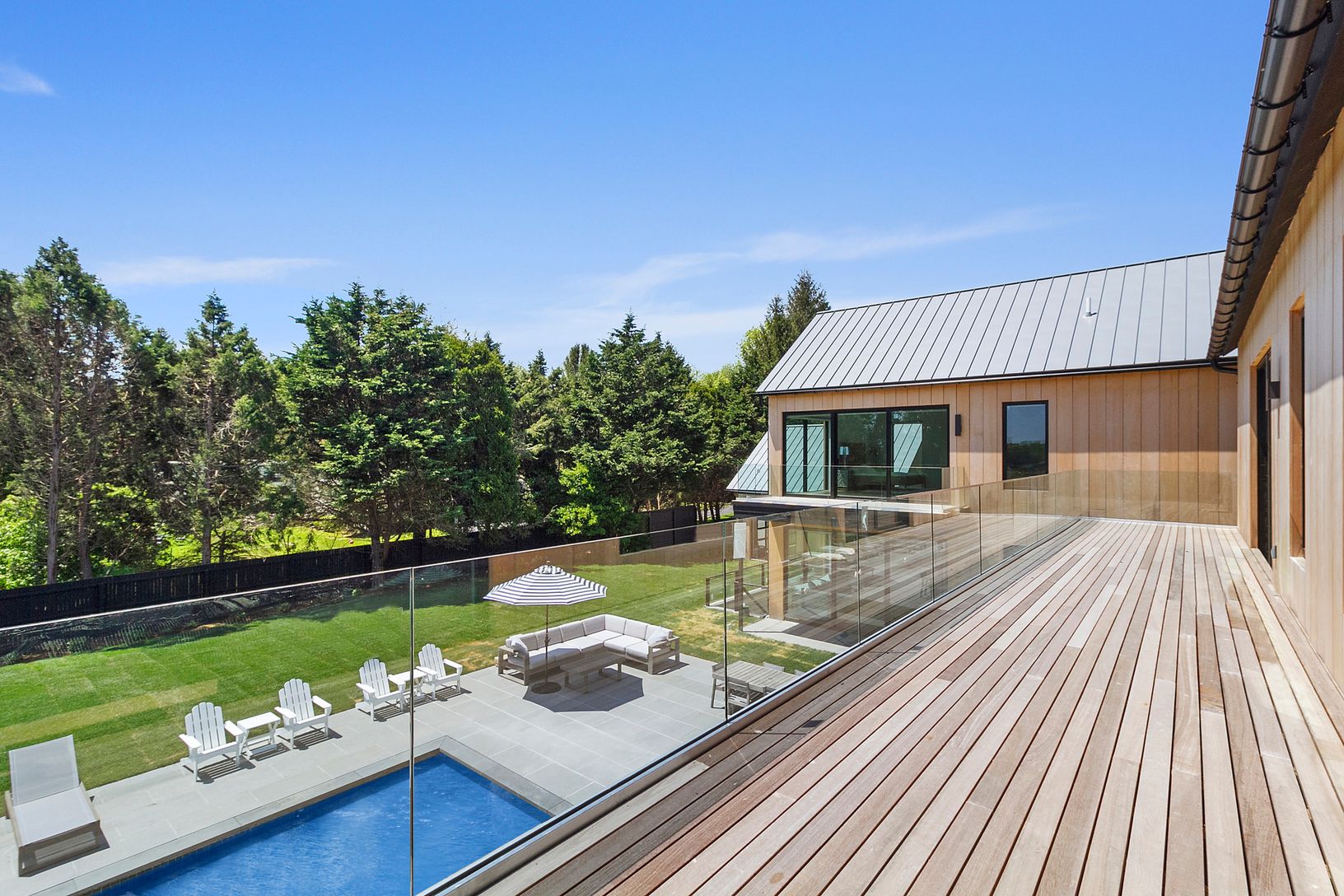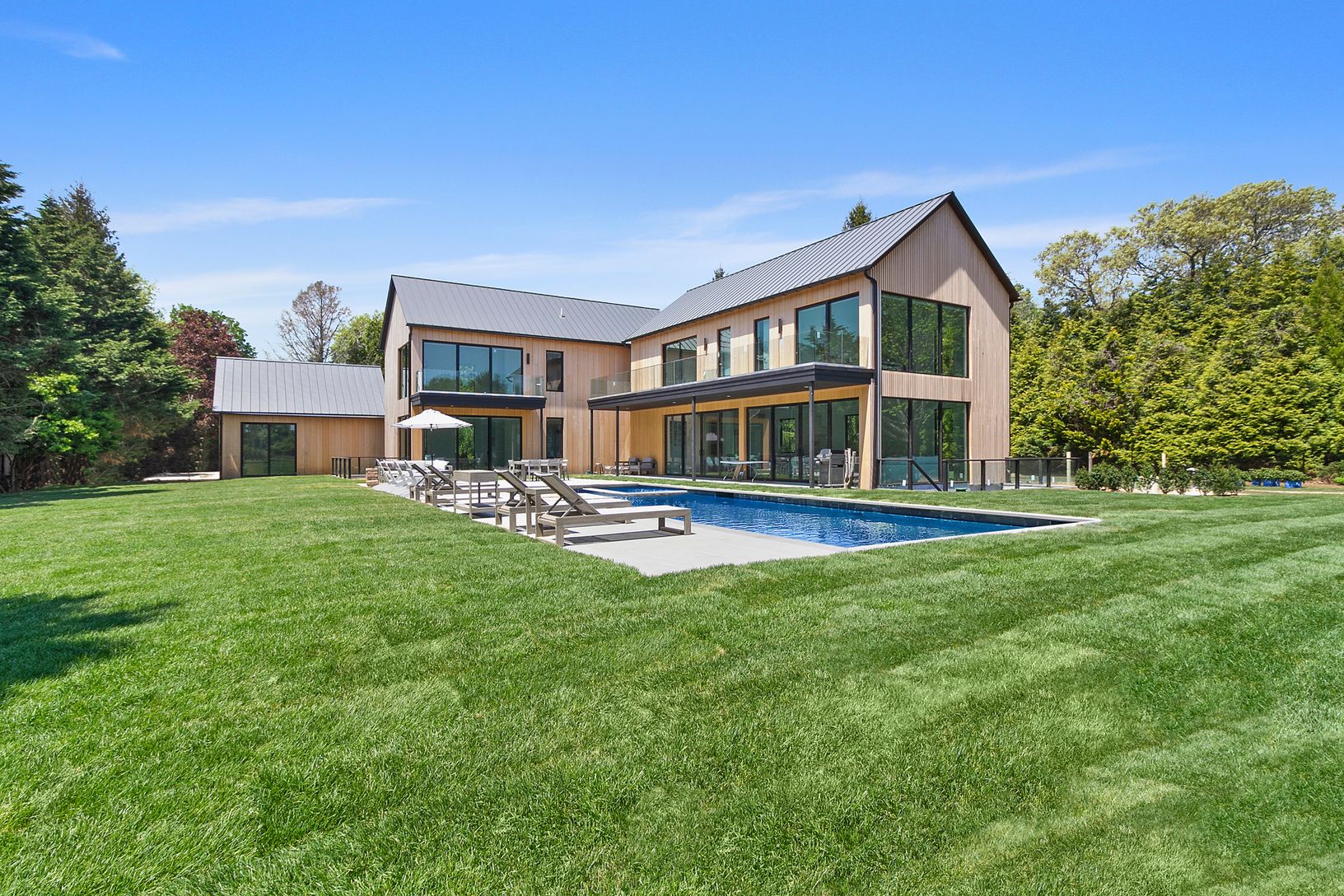 Stunning brand-new modern home on over an acre, and only 4 minutes to East Hampton village. The home features an open kitchen and living area that opens to the outside with oversized sliding doors that seamlessly connect the patio and pool area to the indoor space. The oversize pool (18 x 48) has a spa and beach area with extensive patios surrounding the pool. There is a primary bedroom on the first floor, and another primary bedroom on the se
