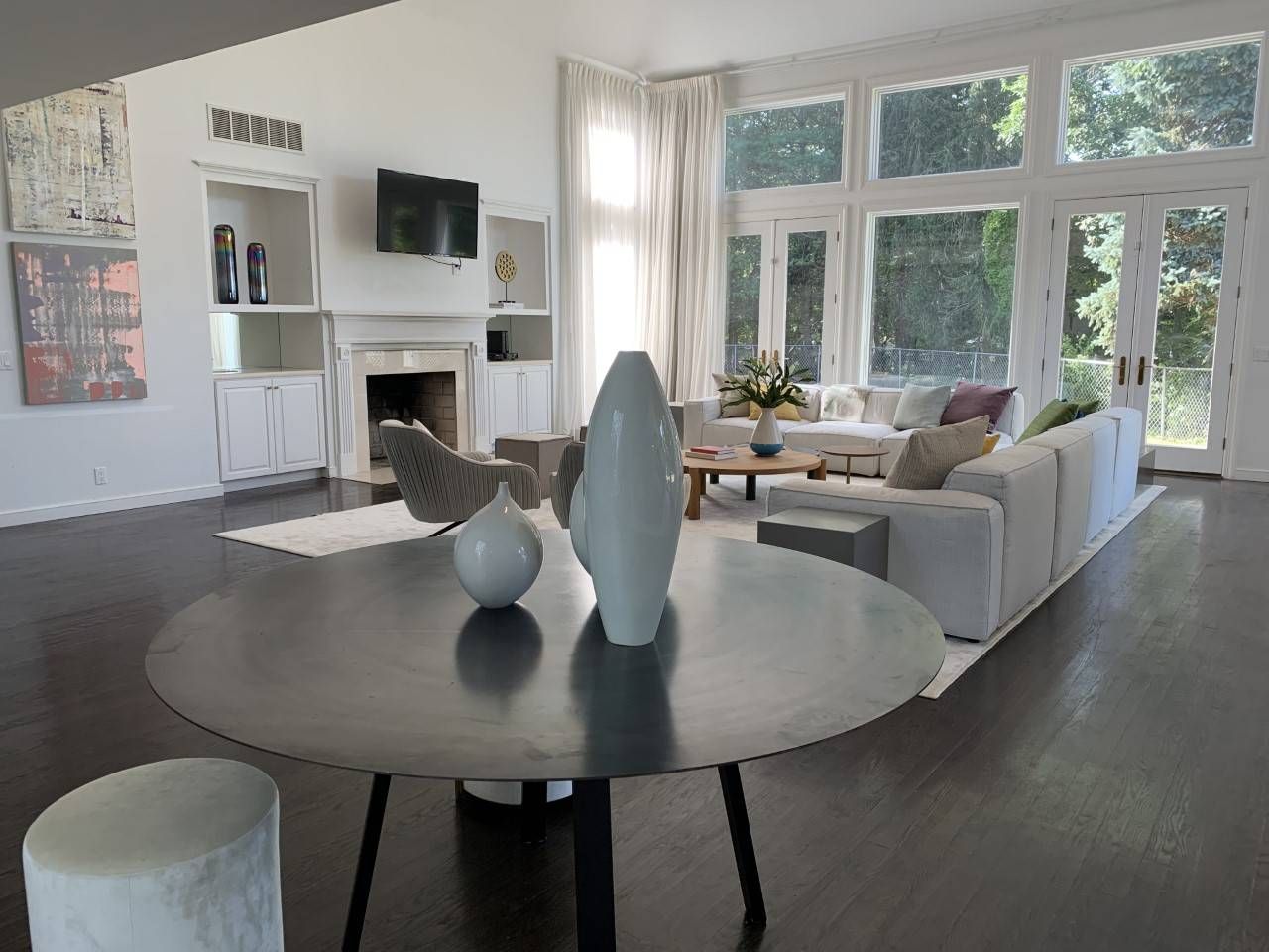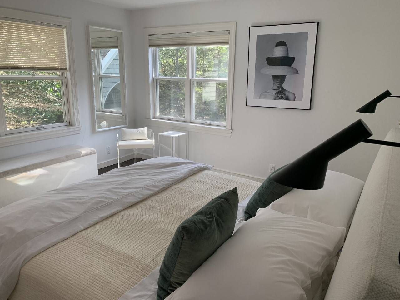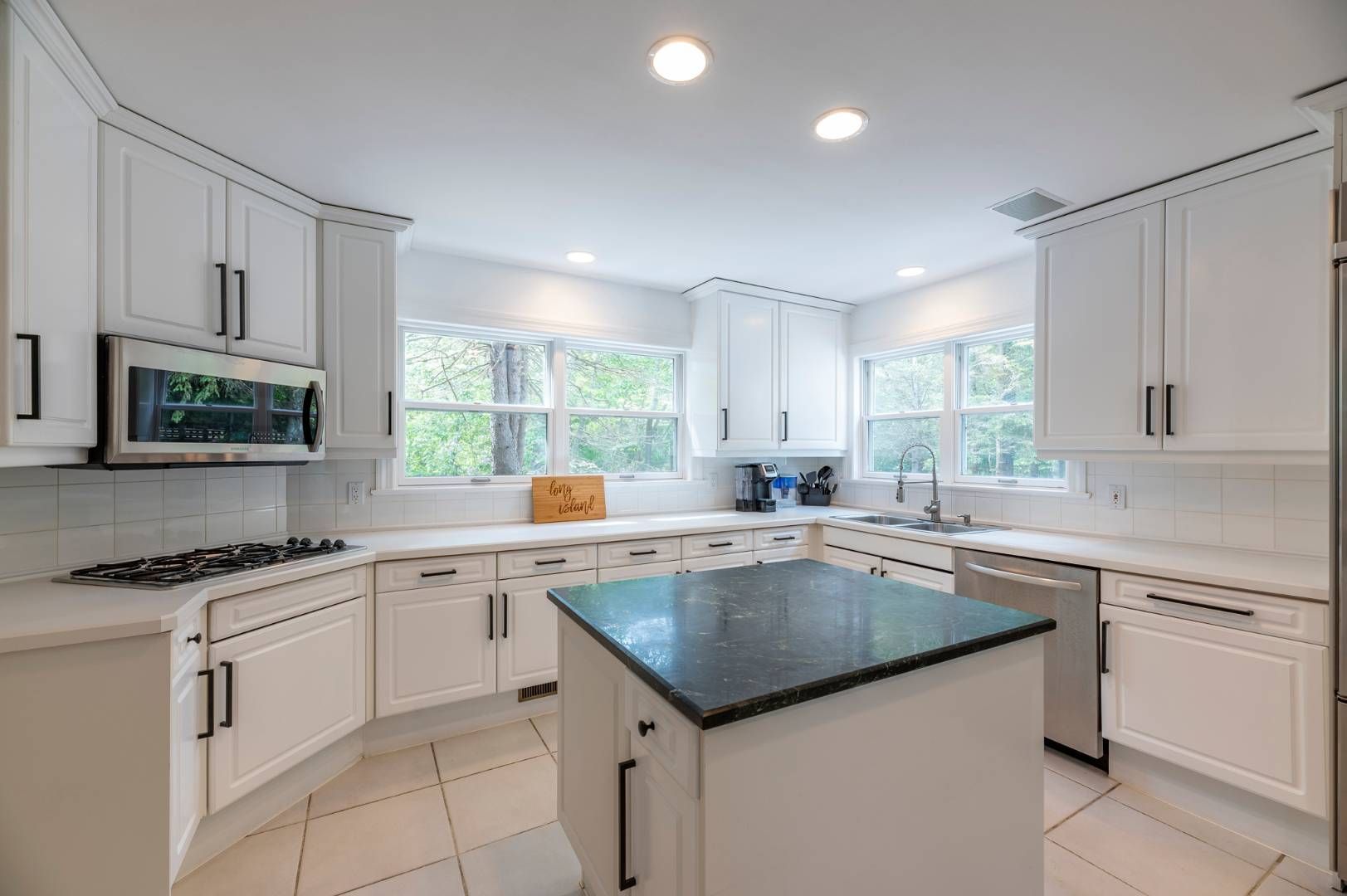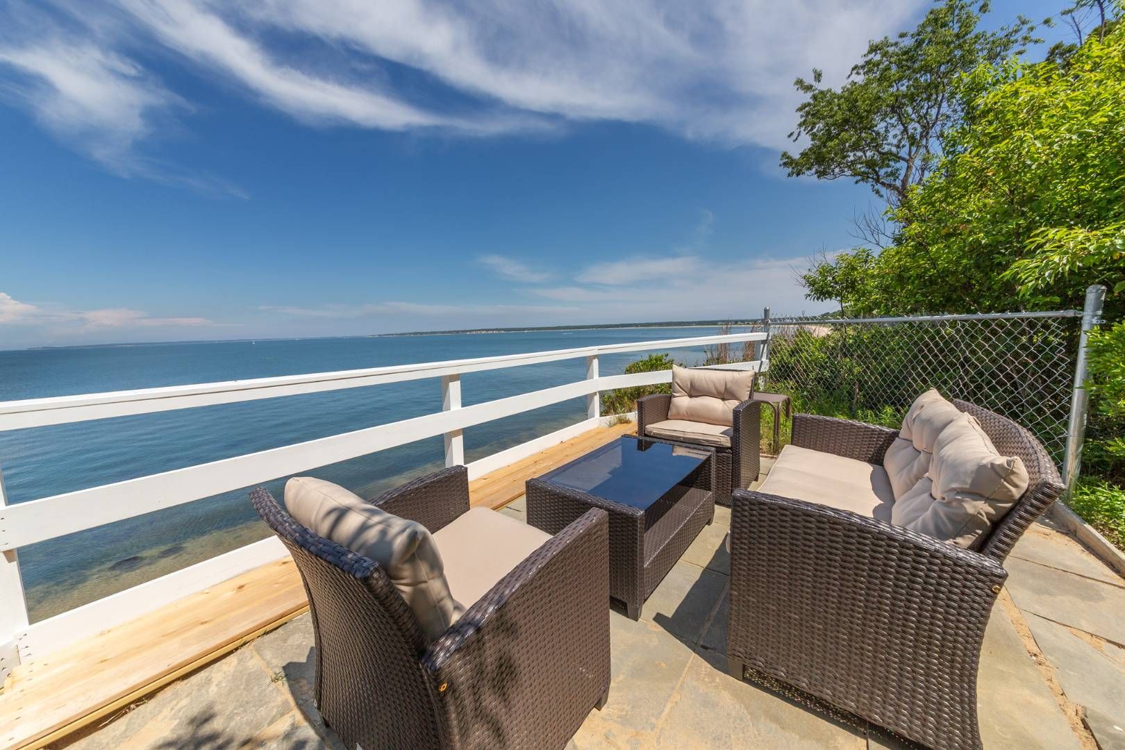 Set on a hill with dazzling panoramic views of the bay, this light-filled postmodern on 1.3 acres is a refreshing and tranquil summer escape. Its 4,428+/- sq. ft. of space provide five bedrooms and 4.5 baths, and all the amenities for fine living. Light-filled open living areas feature a bright two-story living room with French doors to a terrace, formal dining with French door, and a sparkling white kitchen with stainless steel appliances, co