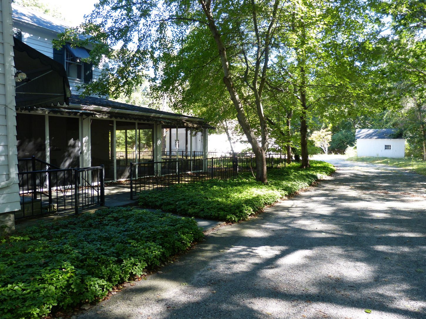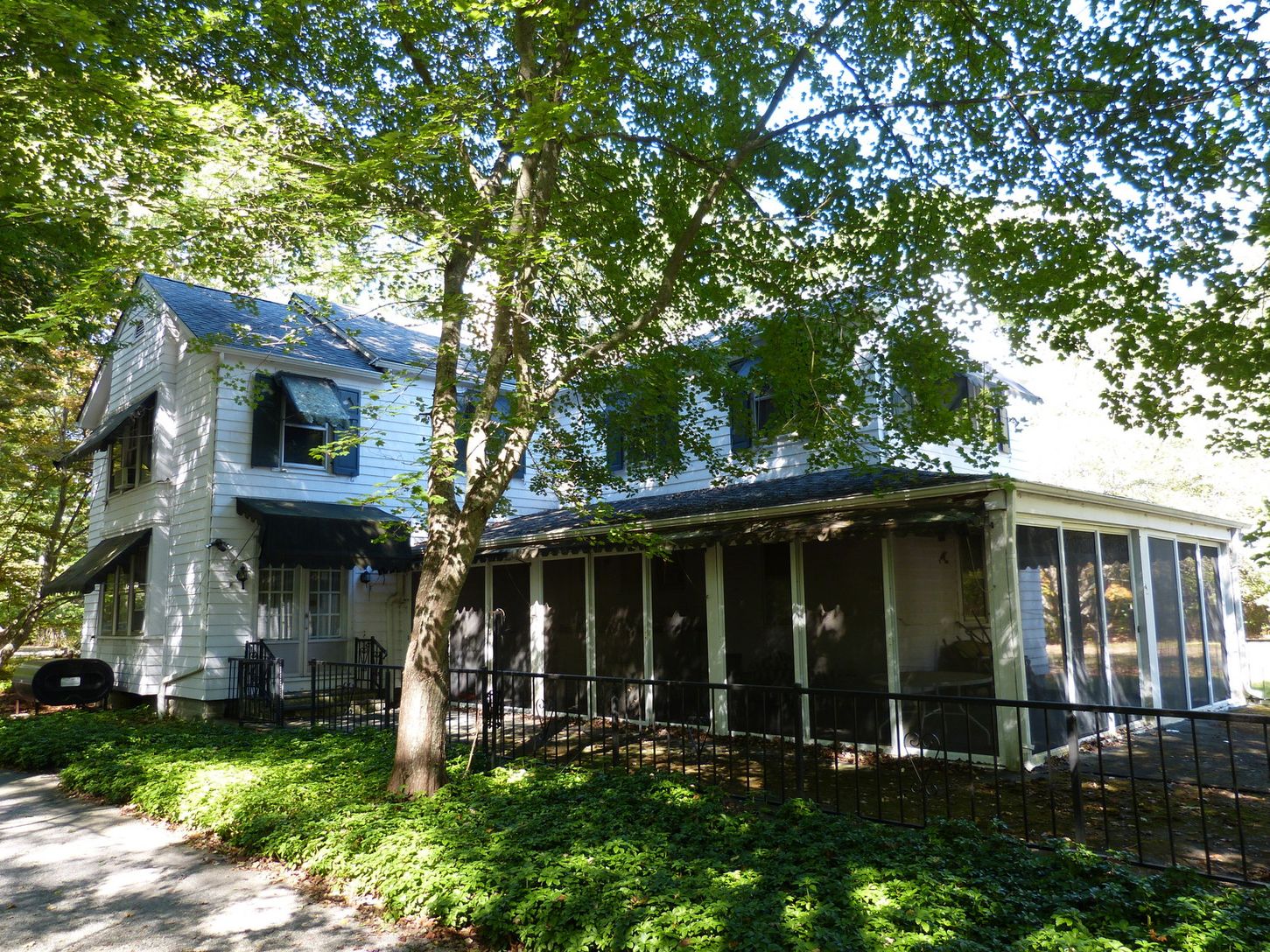 This gracious dowager sits back from a quiet road on nearly two acres. The detached 3 car garage also contains the old horse barn. Room for a pool and, perhaps, tennis.