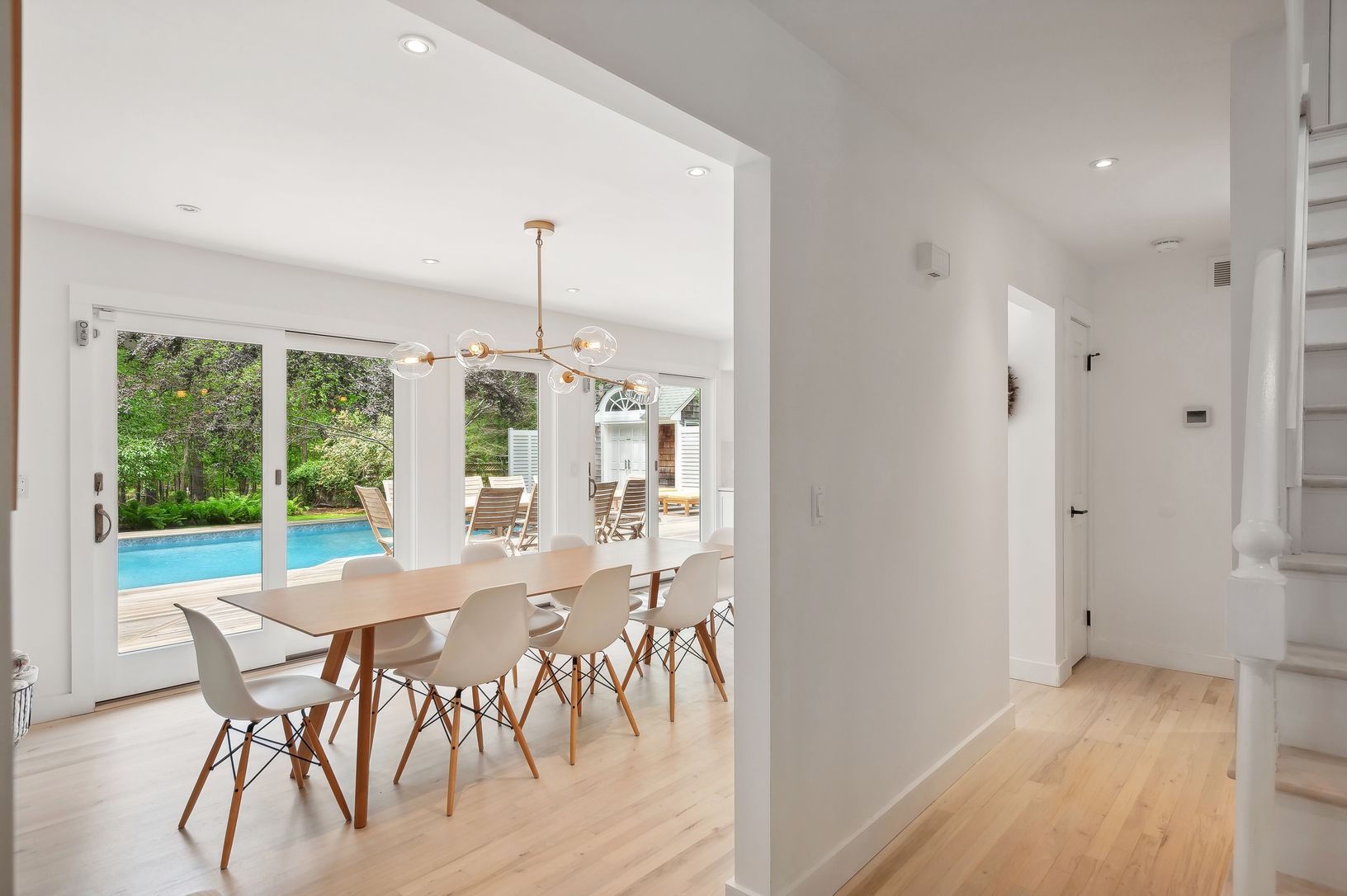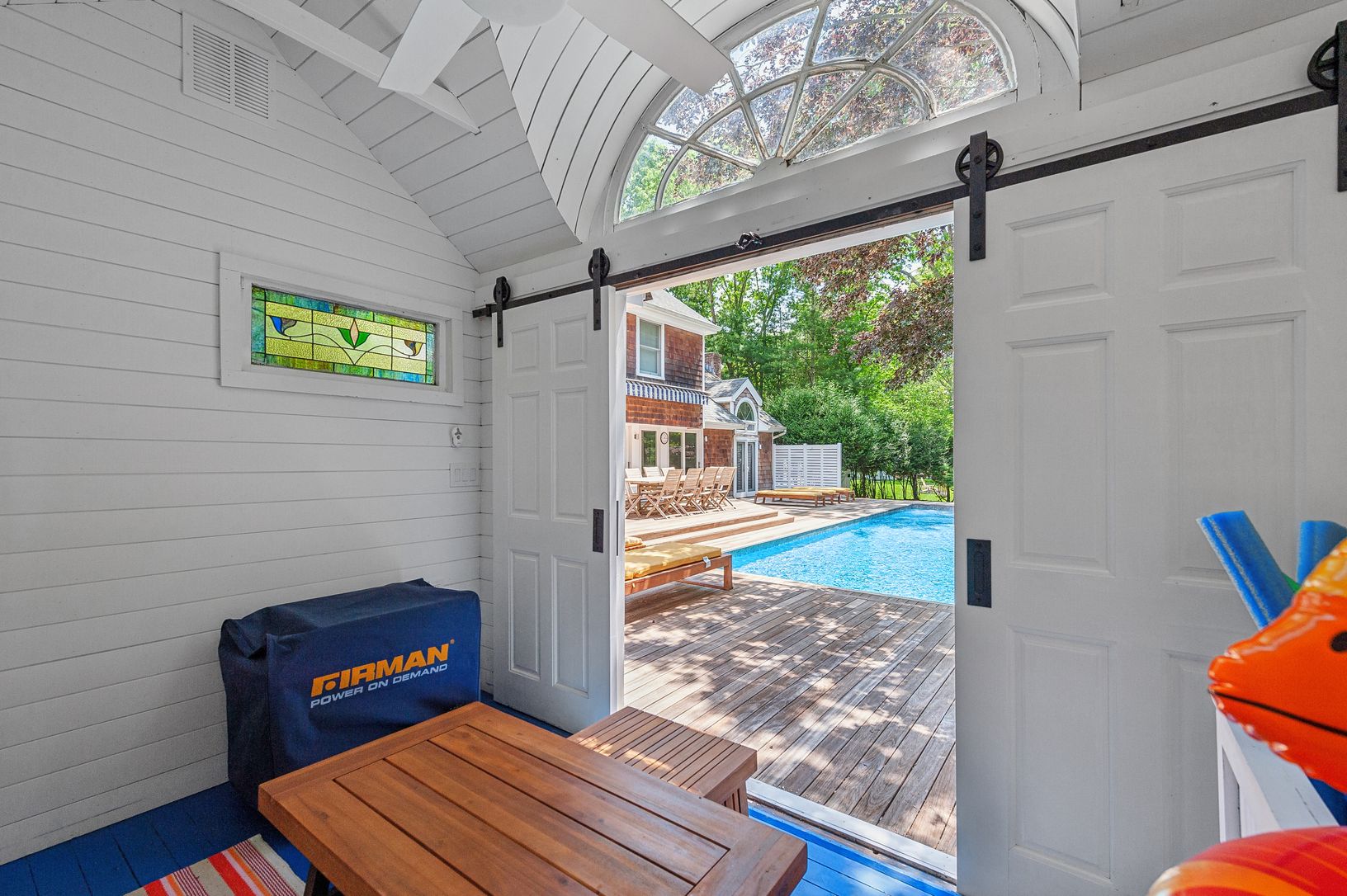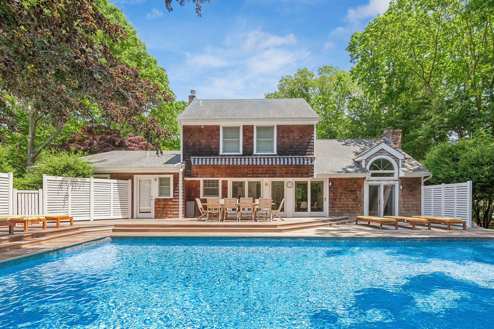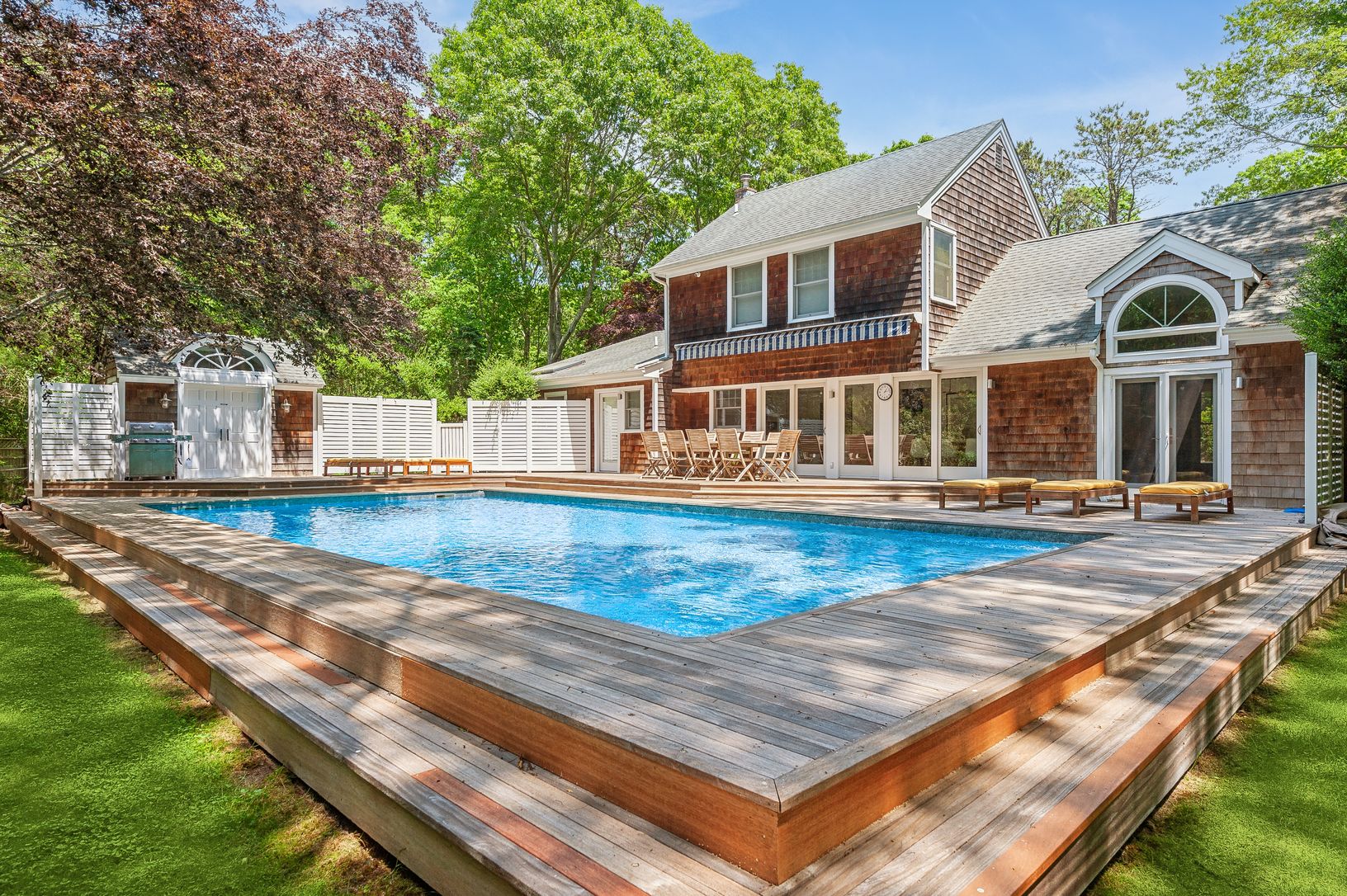 The chef’s kitchen opens directly to a mahogany deck surrounding a heated saltwater pool and pool cabana—perfect for al fresco dining or relaxing under the remot