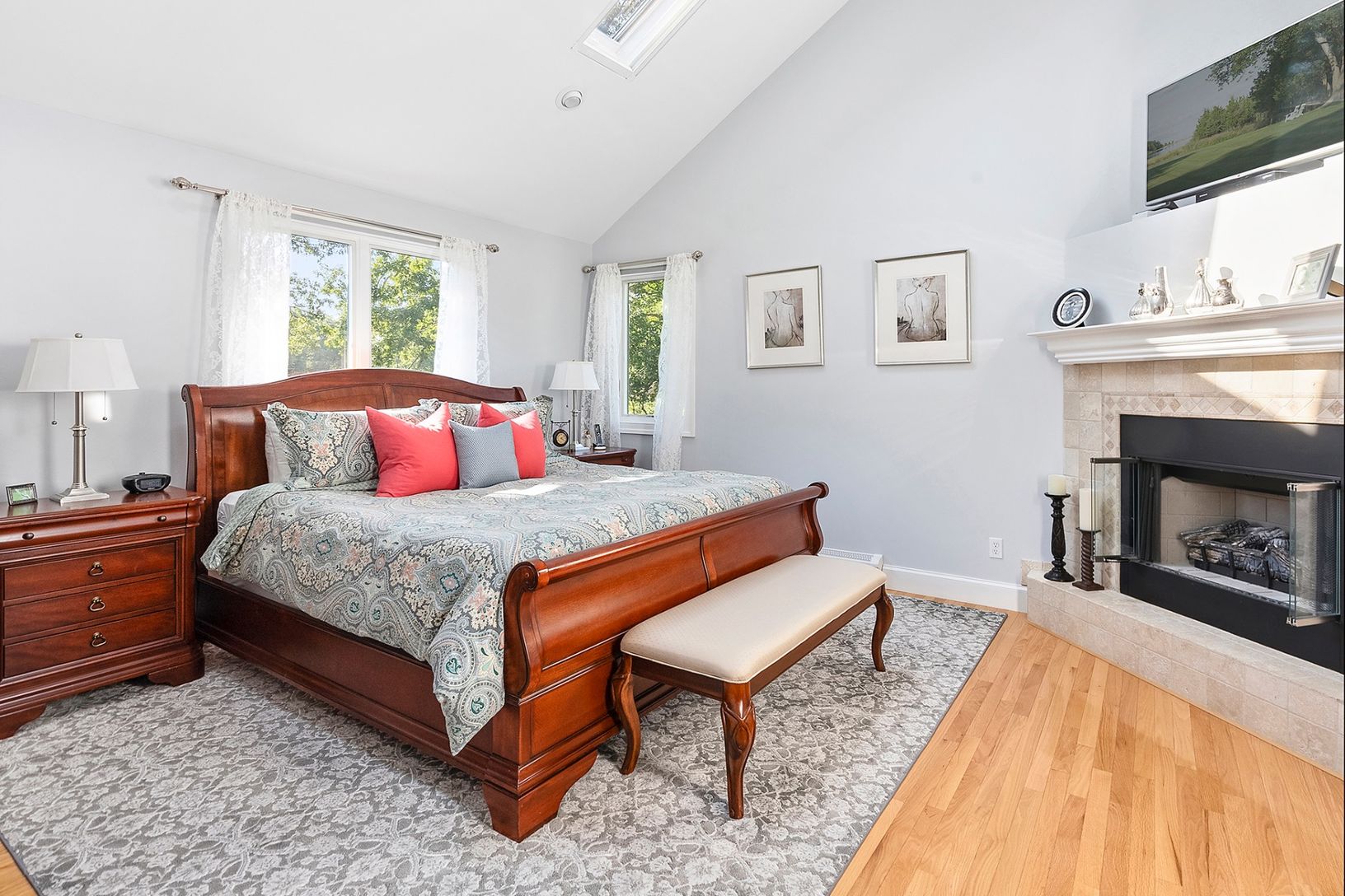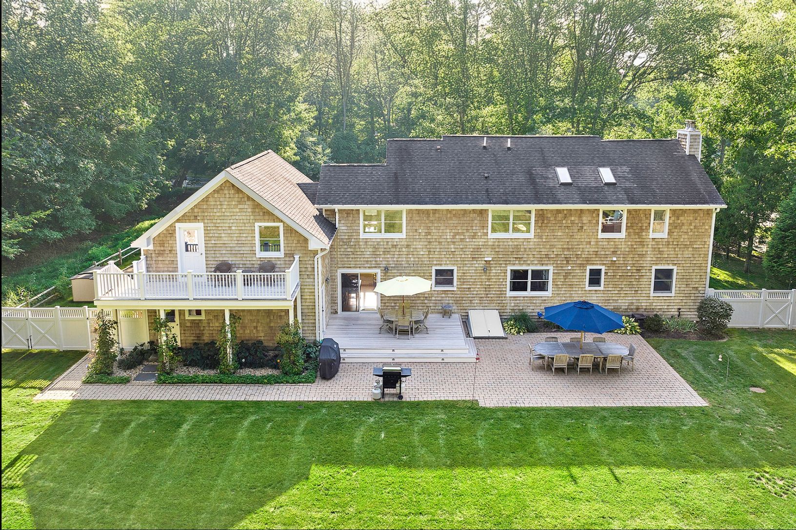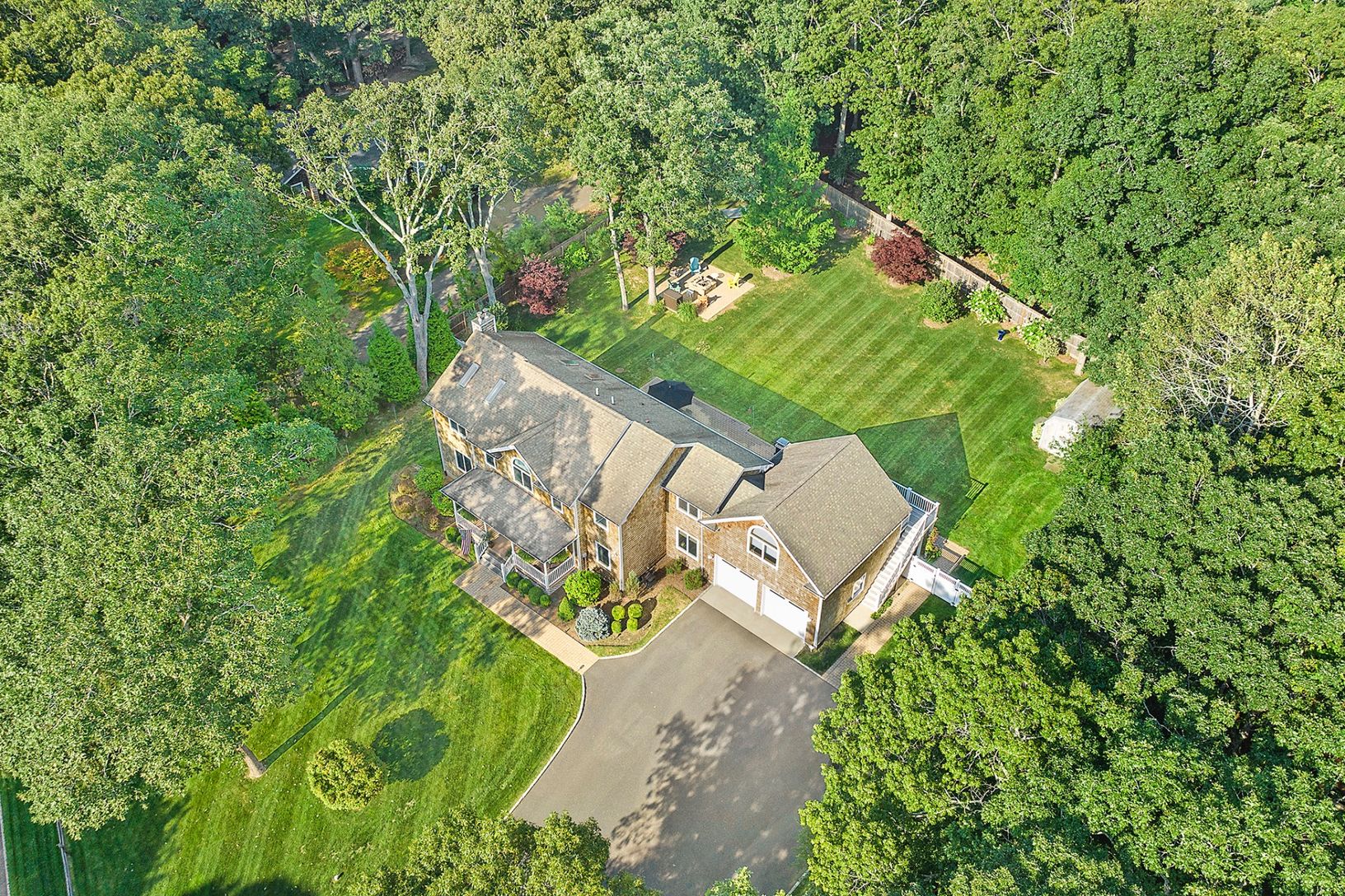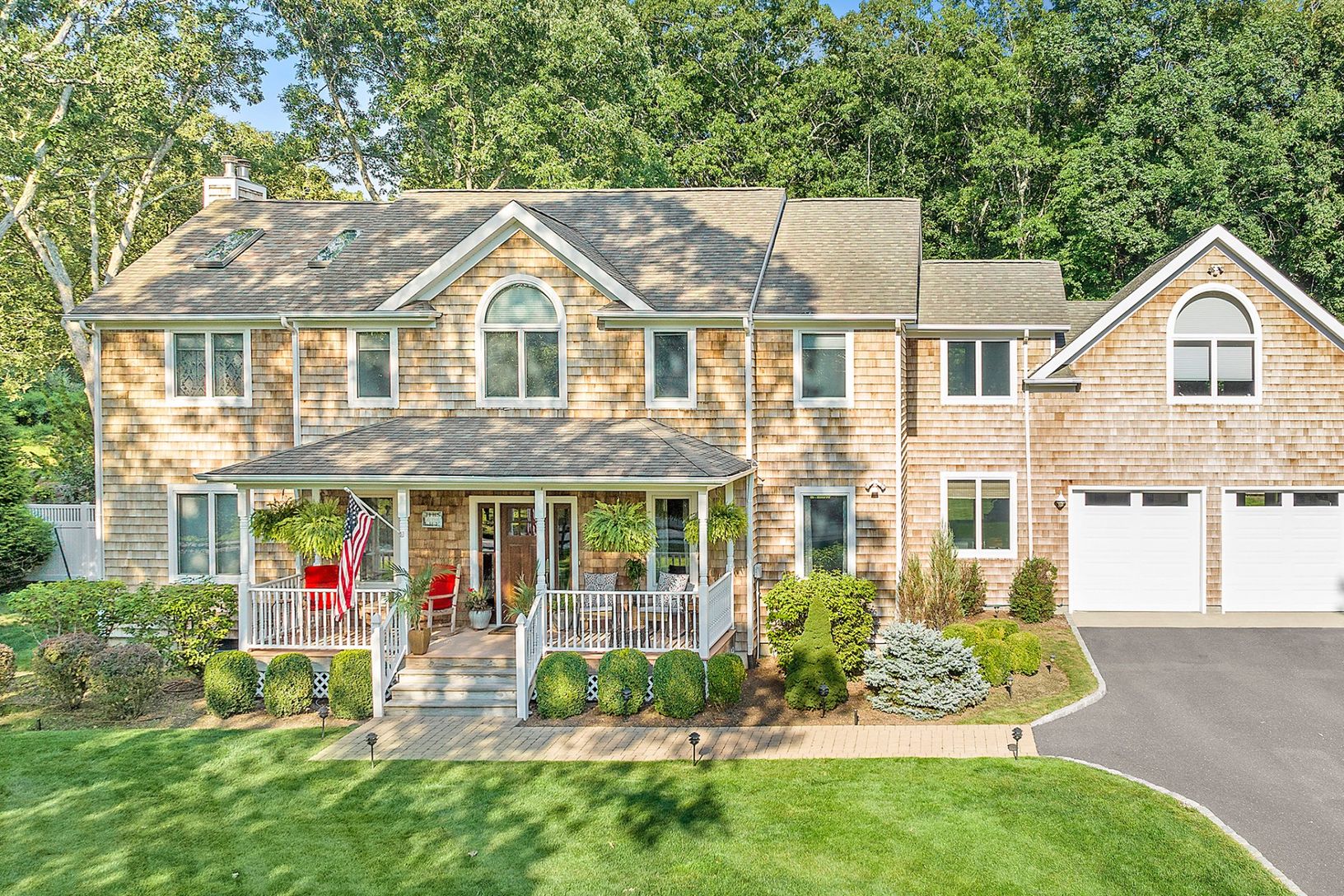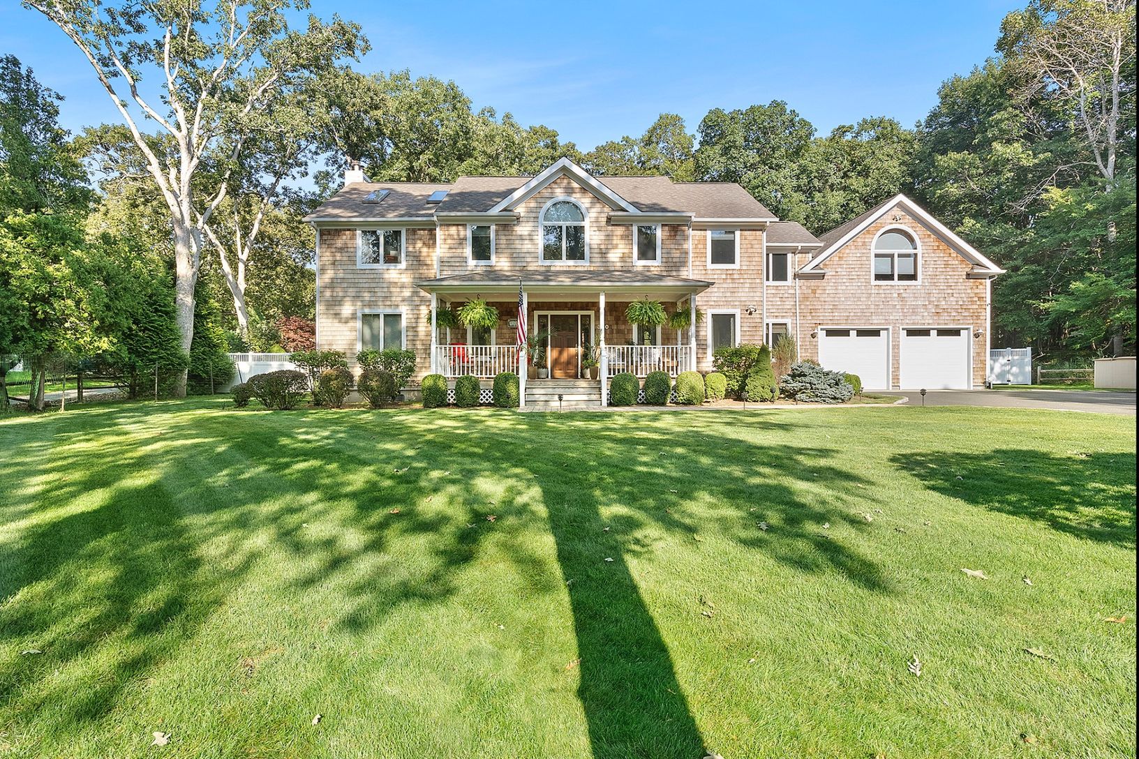 Located on a .69-acre lot, this five-bedroom, four-bath home in Southampton was renovated in 2009 and offers a mix of traditional design and modern updates. Features include custom cabinetry, granite countertops, hardwood floors, and an open floor plan. The main level includes a living area, formal dining room, eat-in kitchen, two guest suites, and two full bathrooms. Upstairs, the primary suite has vaulted ceilings, skylights, a gas fireplace