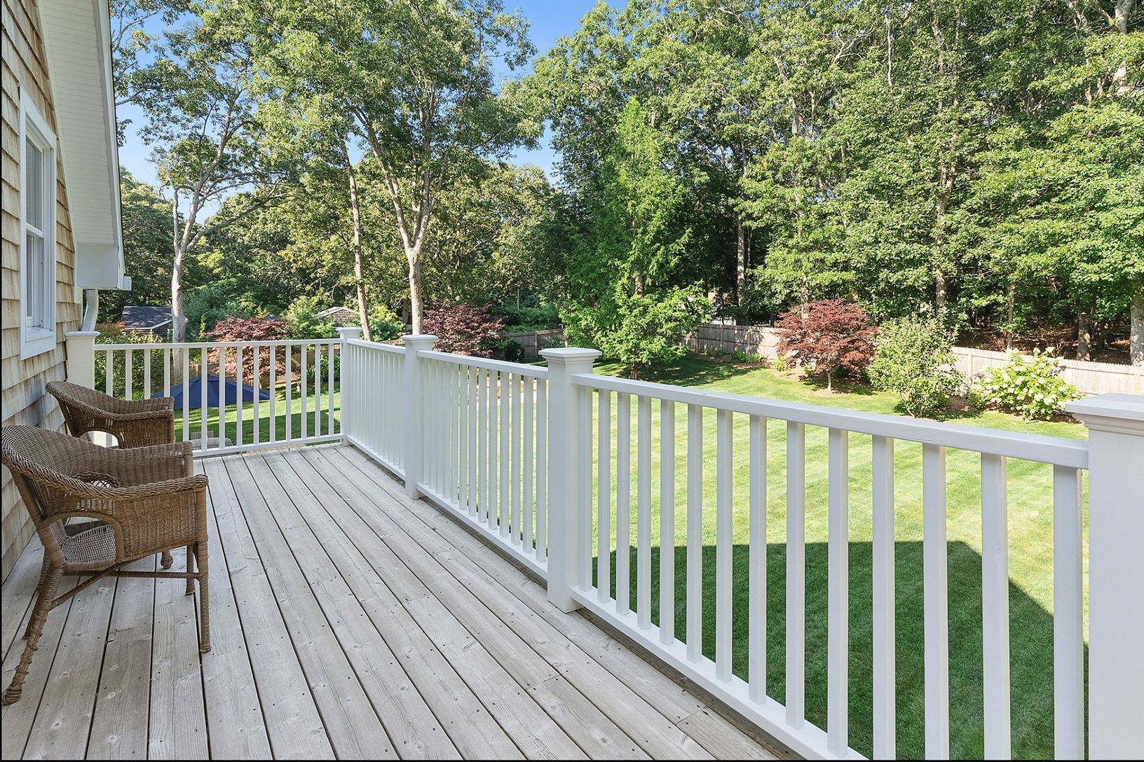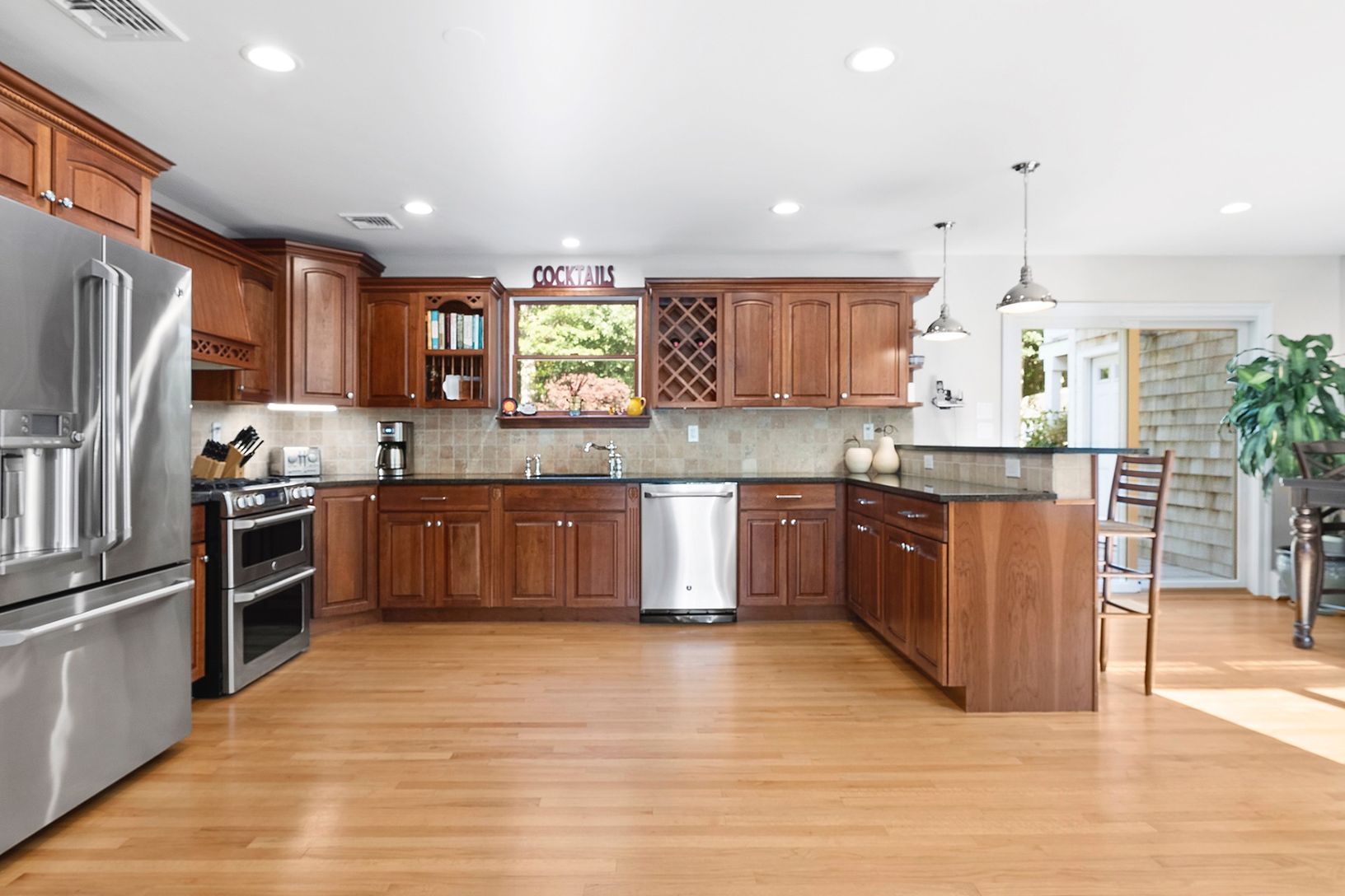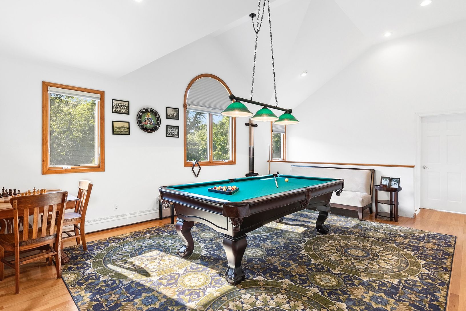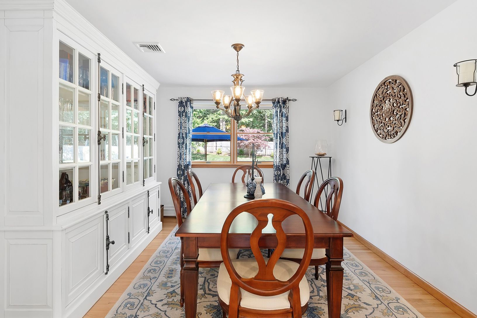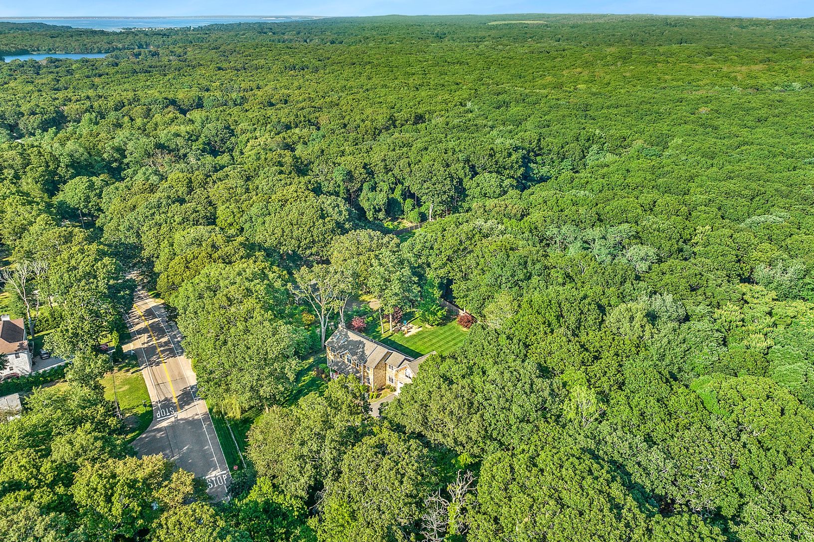 Located on a .69-acre lot, this five-bedroom, four-bath home in Southampton was renovated in 2009 and offers a mix of traditional design and modern updates. Features include custom cabinetry, granite countertops, hardwood floors, and an open floor plan. The main level includes a living area, formal dining room, eat-in kitchen, two guest suites, and two full bathrooms. Upstairs, the primary suite has vaulted ceilings, skylights, a gas fireplace