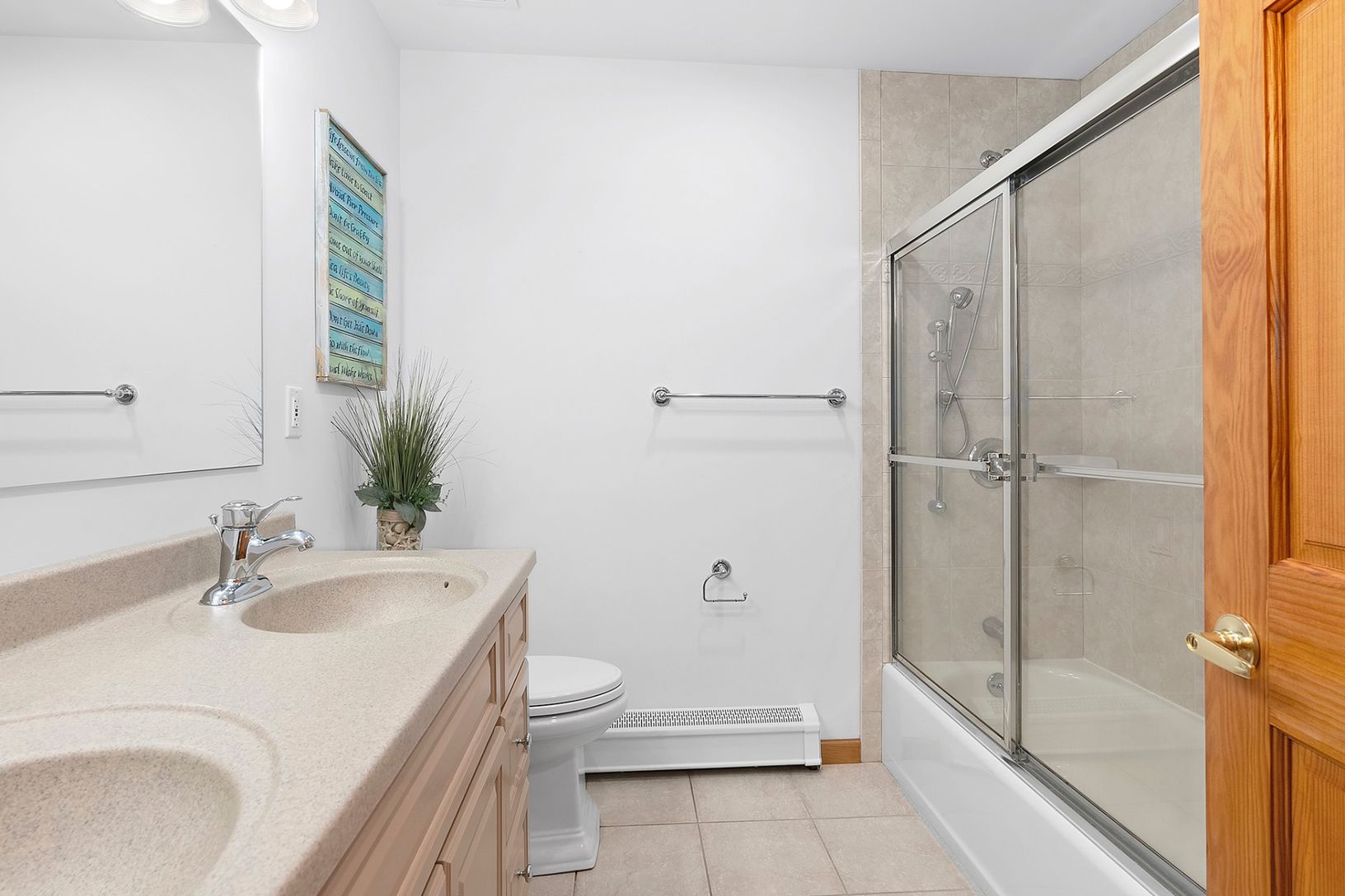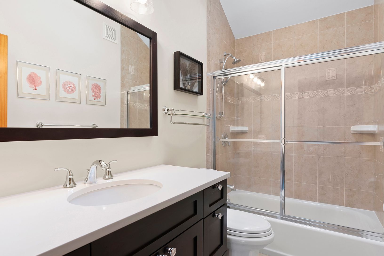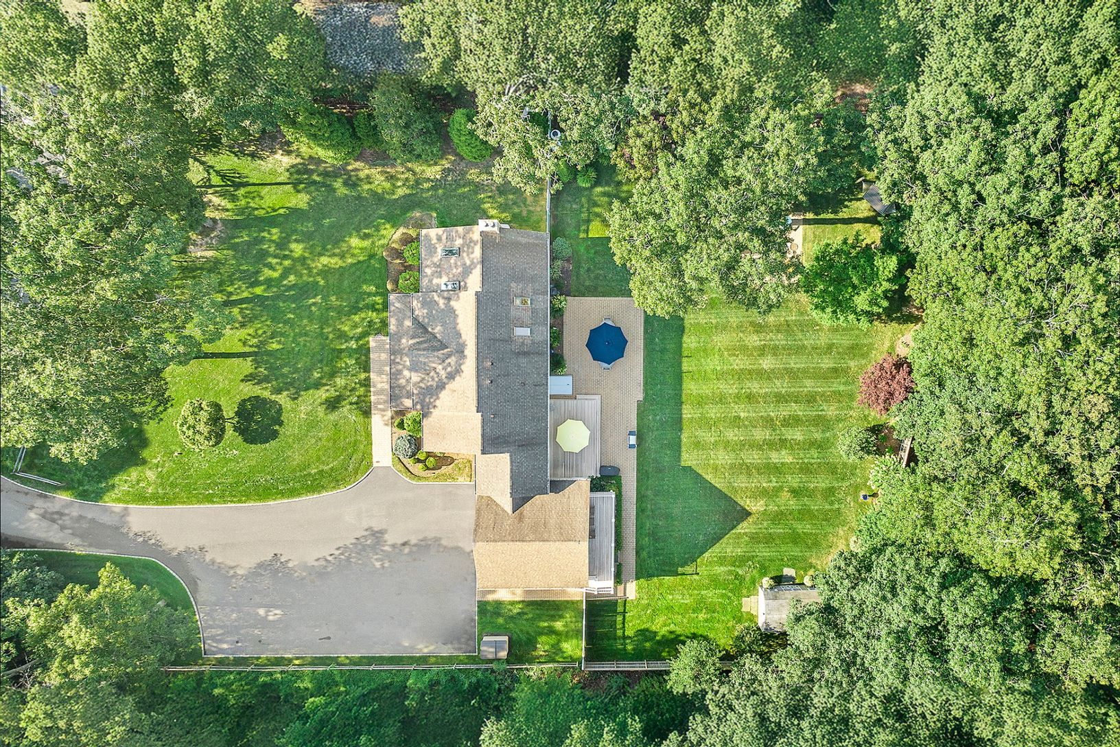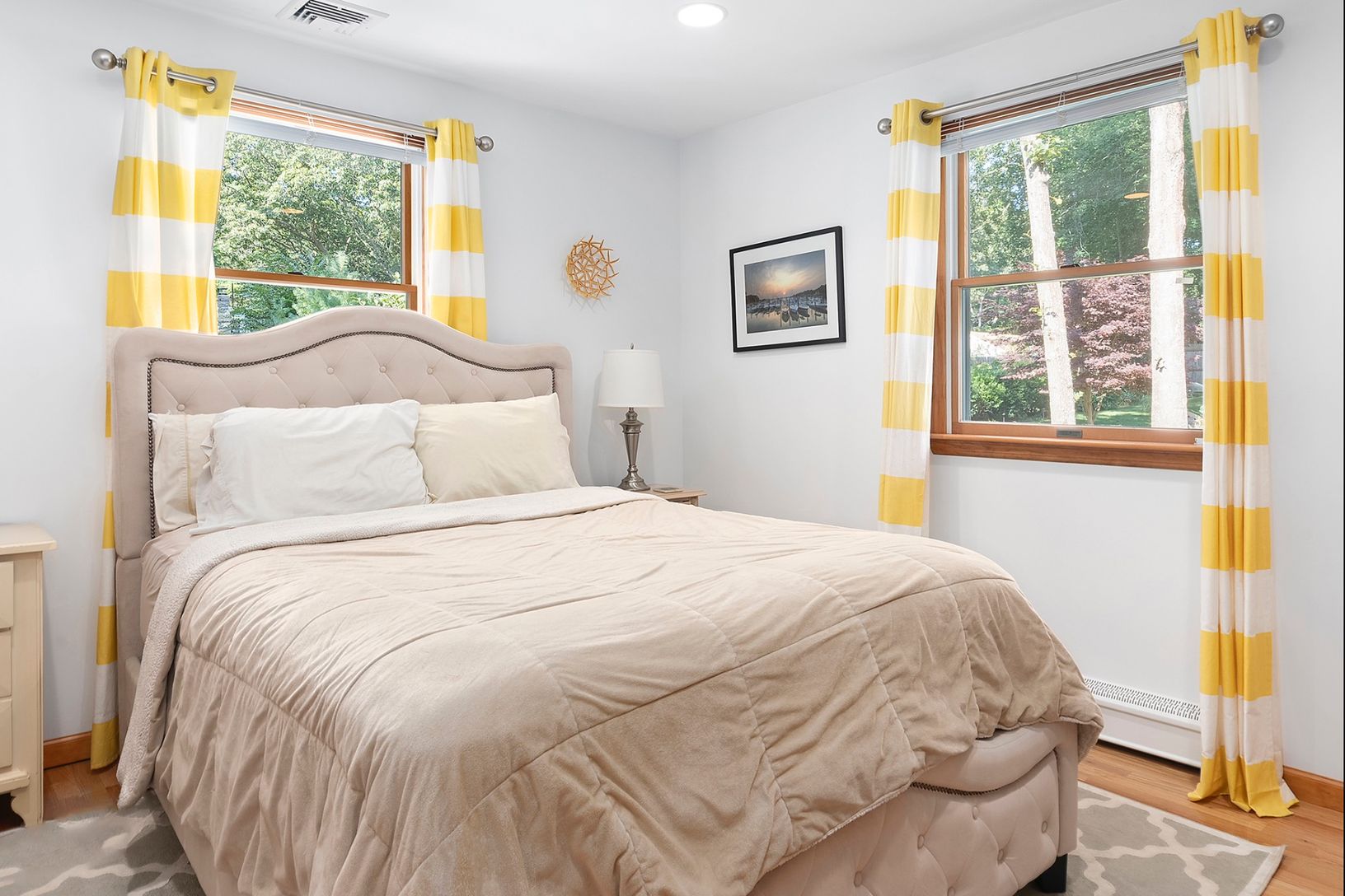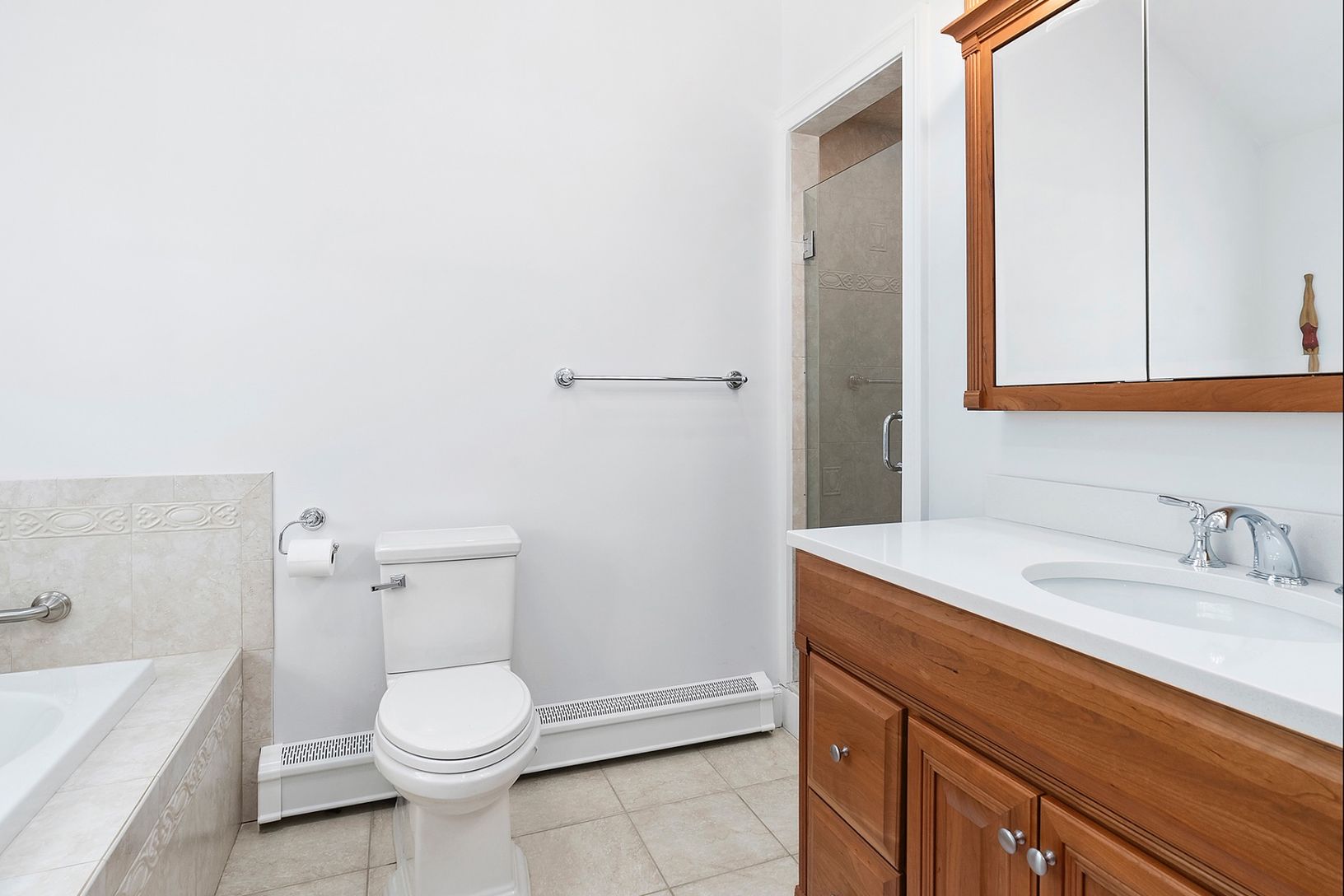 Located on a .69-acre lot, this five-bedroom, four-bath home in Southampton was renovated in 2009 and offers a mix of traditional design and modern updates. Features include custom cabinetry, granite countertops, hardwood floors, and an open floor plan. The main level includes a living area, formal dining room, eat-in kitchen, two guest suites, and two full bathrooms. Upstairs, the primary suite has vaulted ceilings, skylights, a gas fireplace