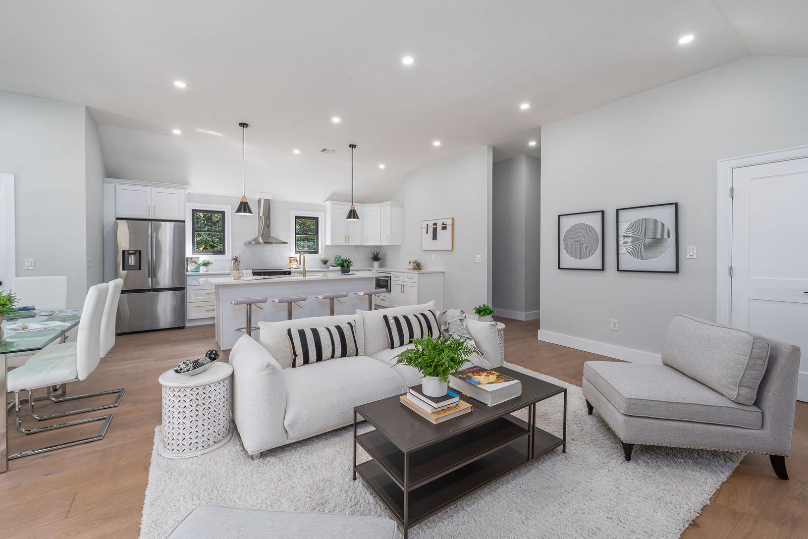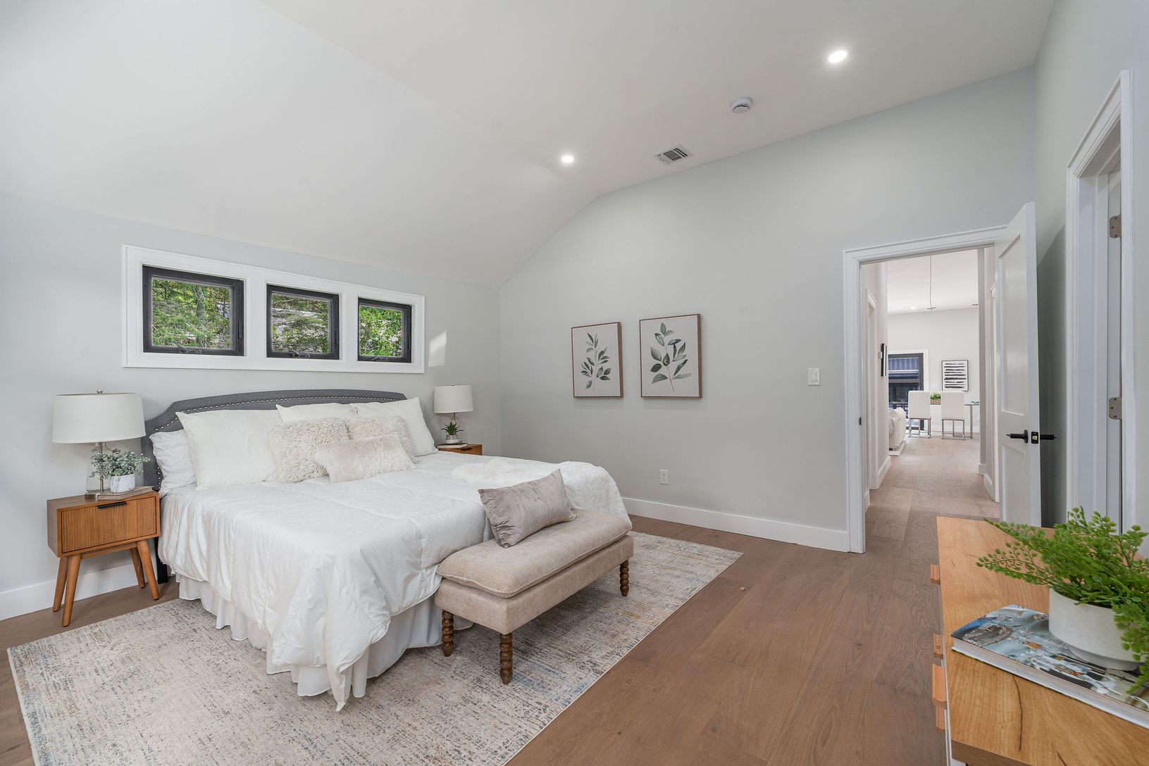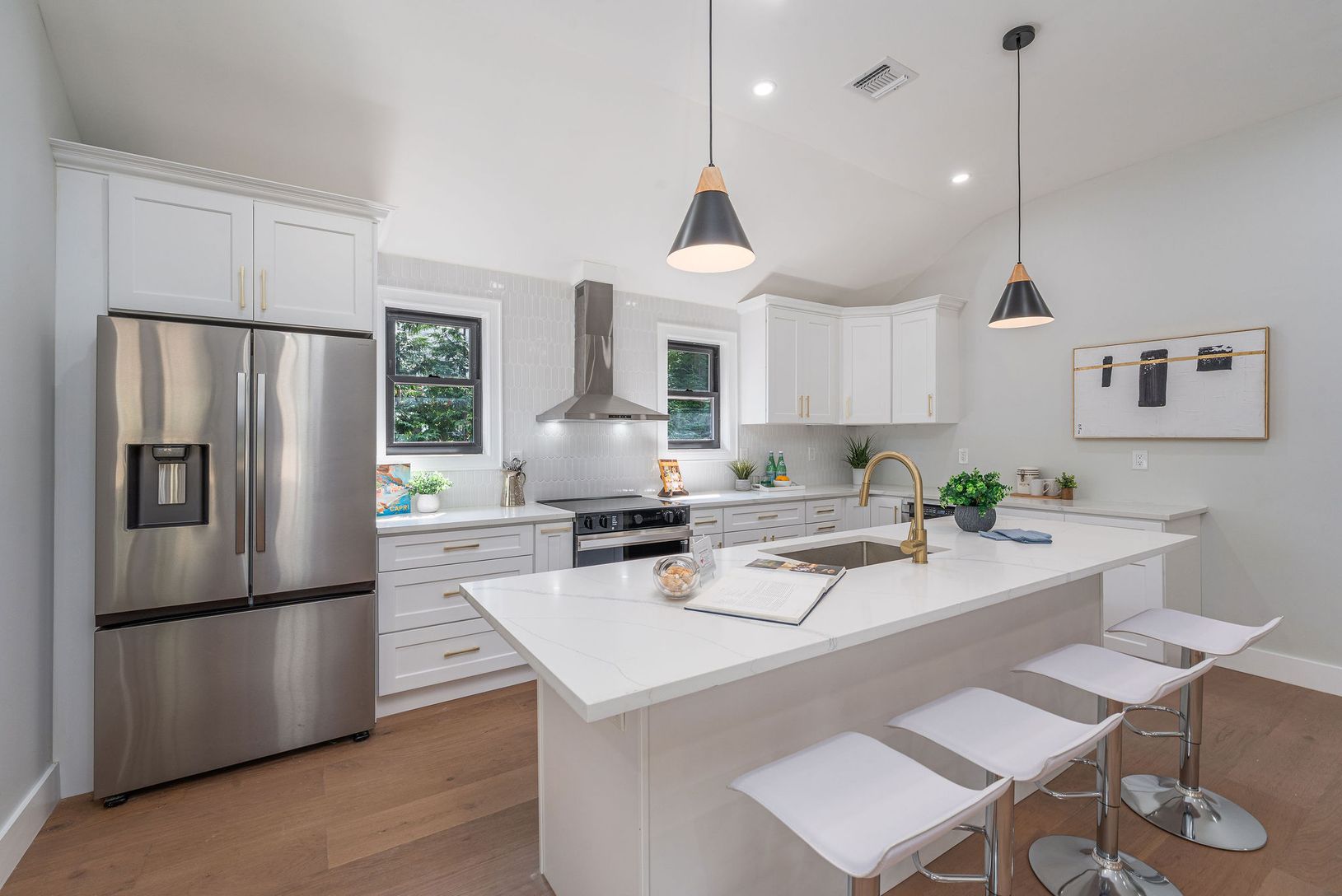 Complete renovation in 2025. This fully renovated 3-bedroom, 2.5-bath home offers 1,400 sq ft of modern living with soaring 10’ vaulted ceilings throughout. The primary suite features a walk-in closet and marble-tiled bath. A new high-efficiency Bosch electric central air and heating system, smart Alexa-ready lighting, sprinkler system, and all new WaterSense appliances ensure comfort and convenience. The kitchen includes a wine fridge, whil