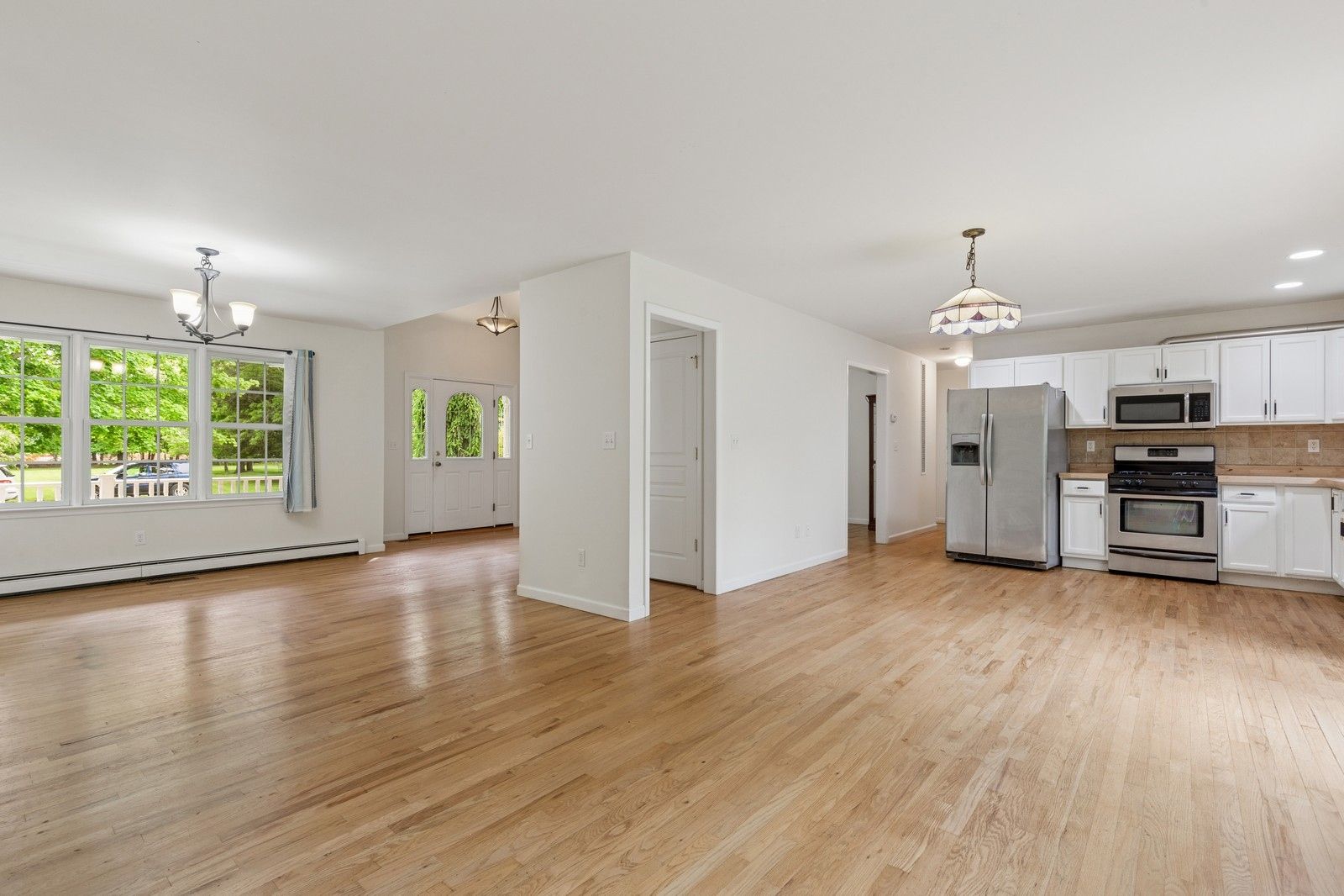 This charming, unfurnished Cape-style home sits on a peaceful side street, offering comfort and convenience in a desirable setting. The home features 3 bedrooms and 2.5 baths, including a spacious primary bedroom with en-suite bath on the first floor—perfect for ease of living. A welcoming open front porch sets the tone, while a cozy wood-burning fireplace adds warmth and charm to the living space. The property also includes a nicely sized ya