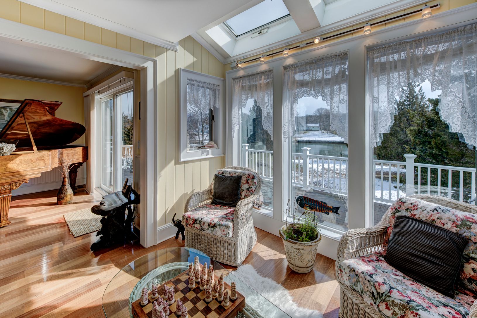 This wonderful waterfront Contemporary in East Hampton, includes panoramic views of Gardiners Bay, Shelter Island, Orient Point, and Connecticut. From over 600 square feet of decking, enjoy the most beautiful sunsets in the Hamptons, year round. The gourmet kitchen and beamed & vaulted great room have an open floor plan, perfect for entertaining friends and family with a gas fireplace, multiple skylights, and beautiful Brazilian wood floo