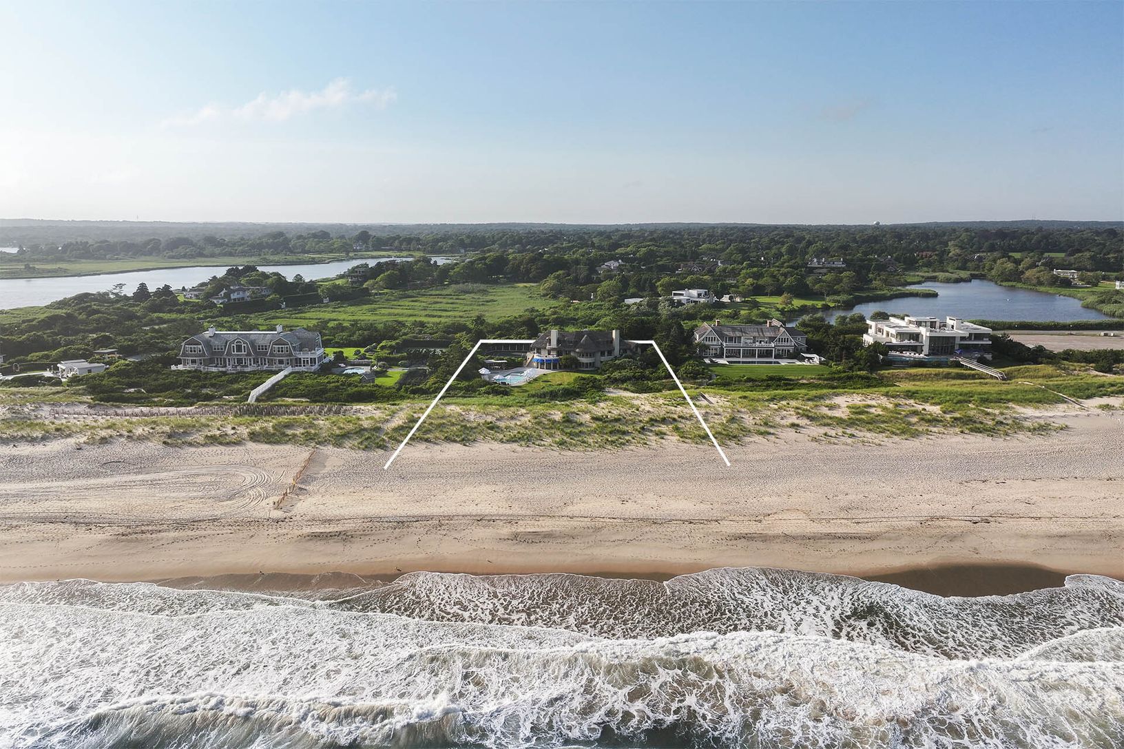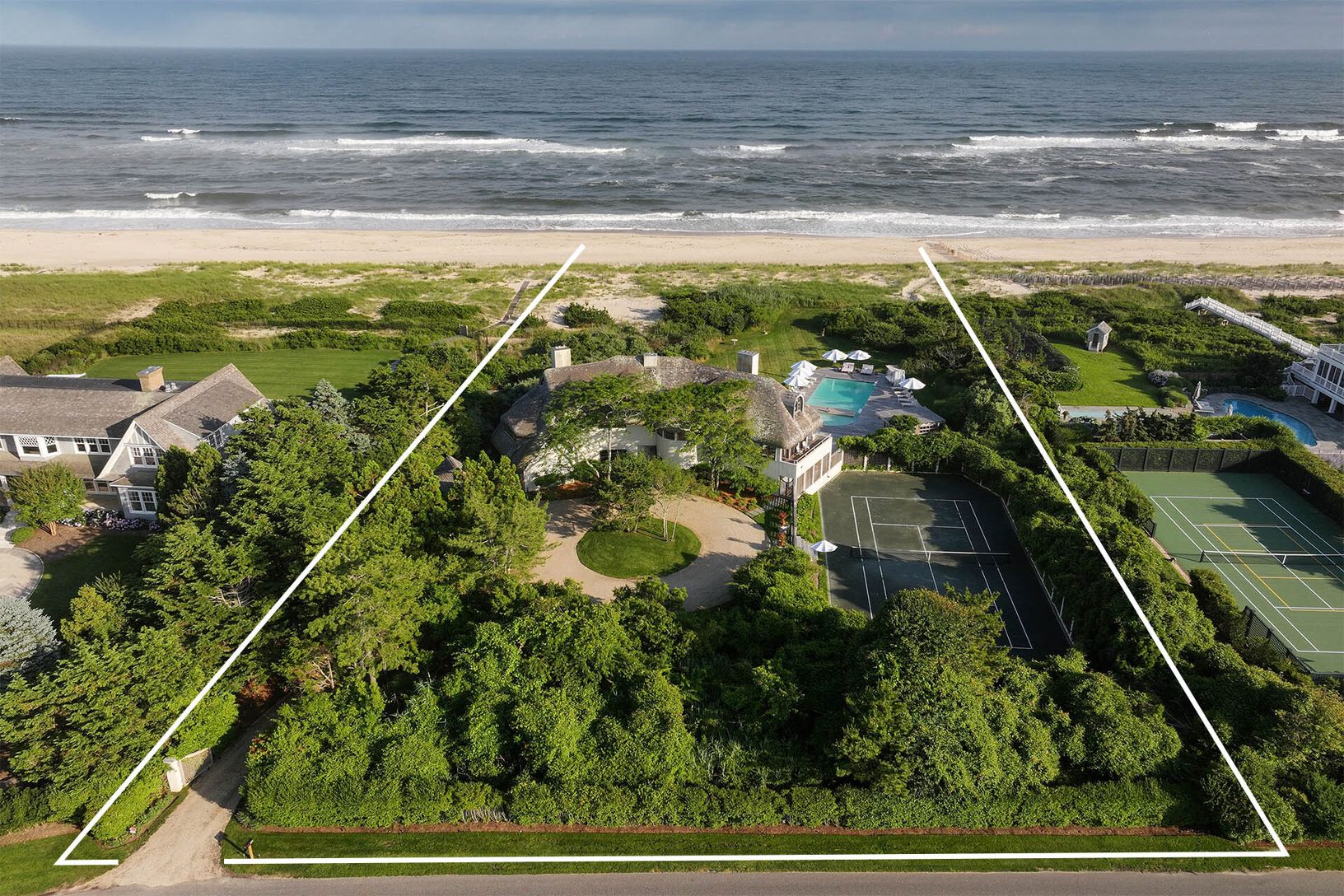 This exclusive 2.3 acre+/- property boasts 200' of pristine ocean frontage, offering breathtaking ocean views and convenient beach access just beyond the private dune. The 5,000 SF+/- main residence, designed by the renowned architectural team Beyer Blinder Belle and featuring interiors by French designer Andrée Putman, blends English style with contemporary interiors. The home boasts seven bedrooms across three levels, with ample exterior dec