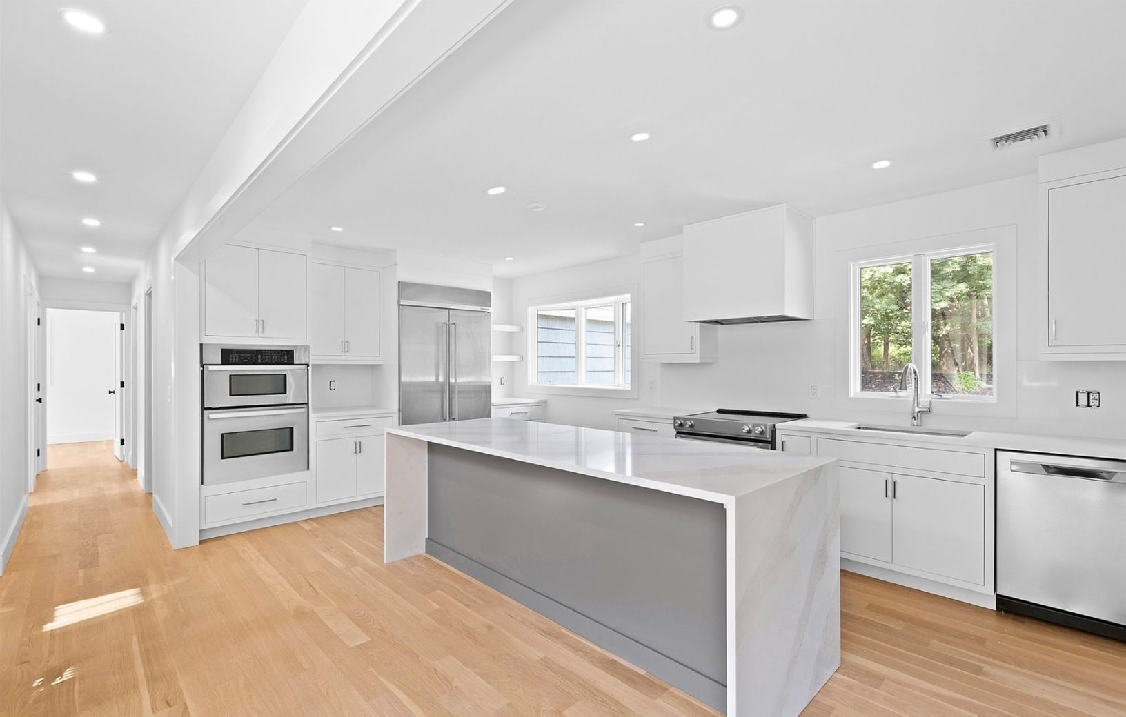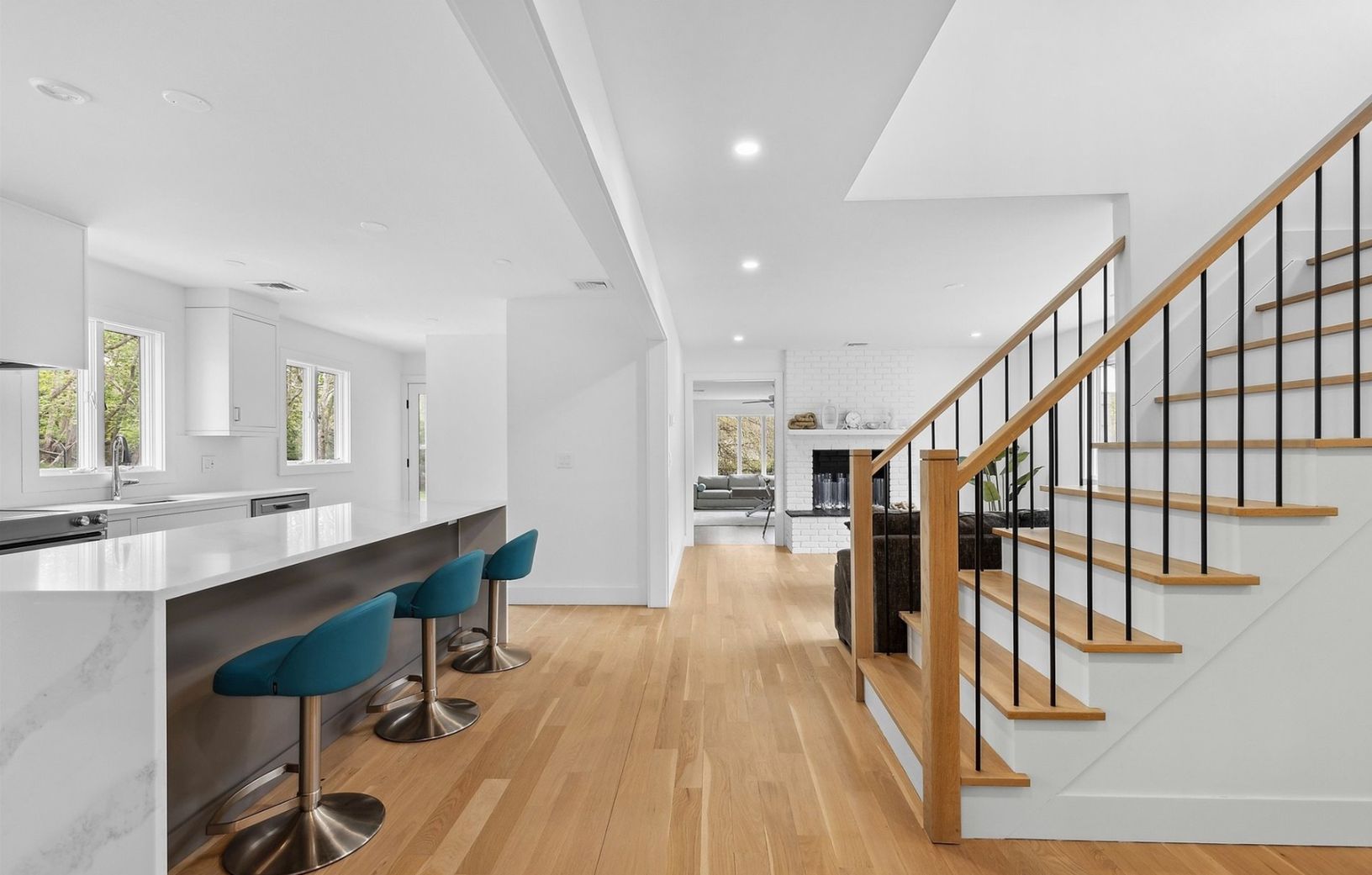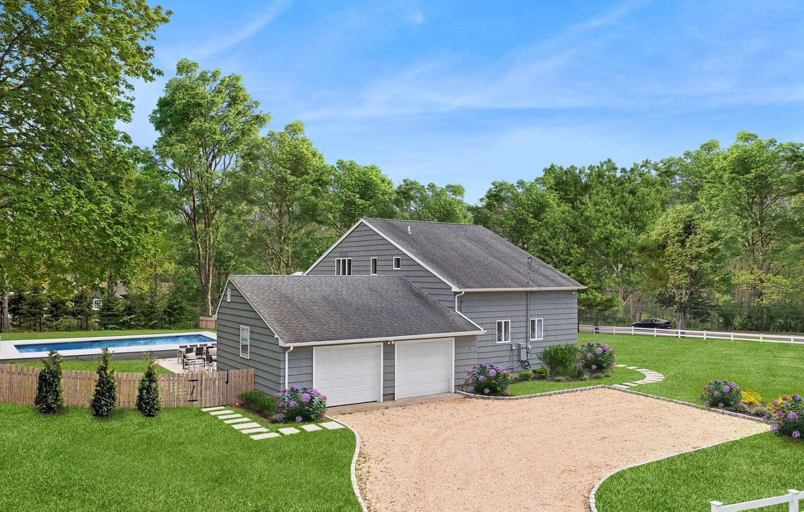 This masterfully renovated residence is the secluded retreat that you've been looking for! Perfectly situated on a sprawling 0.88-acre lot, lush lawns and extensive landscaping with impressive outdoor spaces to suit your Hamptons lifestyle. The transitional new home offers high end materials and finishes featuring four/five bedrooms, large living room with oversized windows for ample natural light, open flow dining Room, two full bathrooms inc
