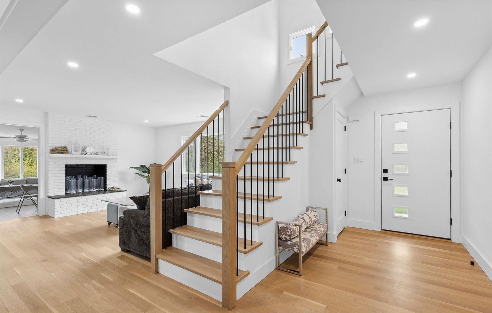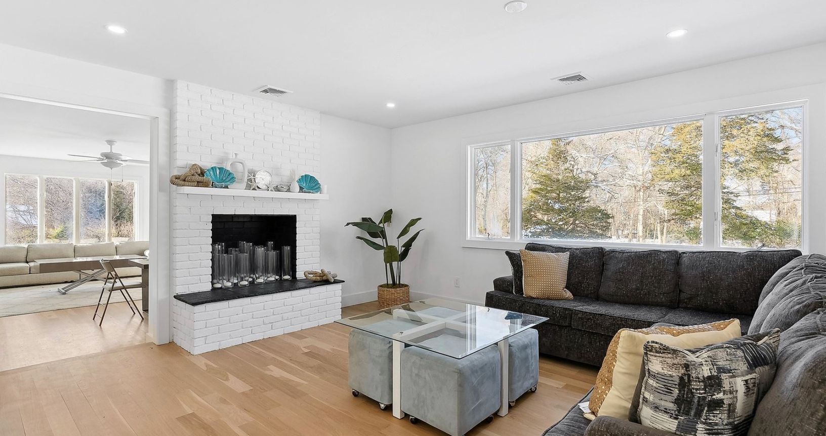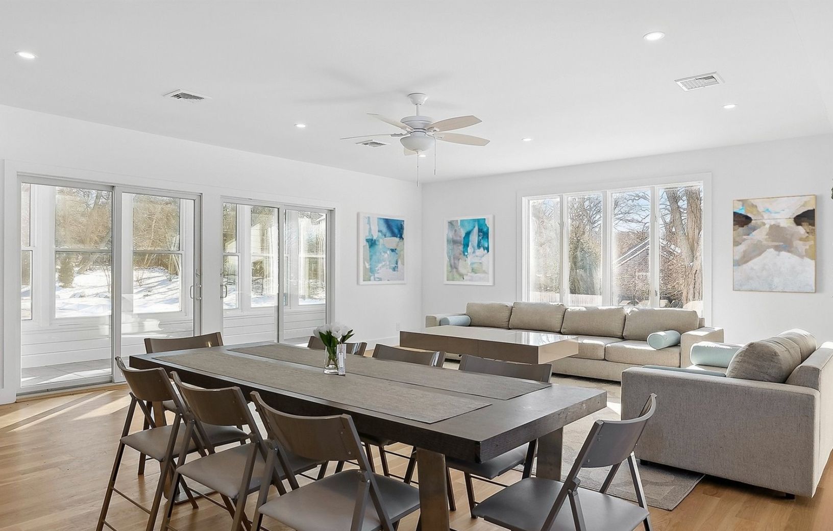 This masterfully renovated residence is the secluded retreat that you've been looking for! Perfectly situated on a sprawling 0.88-acre lot, lush lawns and extensive landscaping with impressive outdoor spaces to suit your Hamptons lifestyle. The transitional new home offers high end materials and finishes featuring four/five bedrooms, large living room with oversized windows for ample natural light, open flow dining Room, two full bathrooms inc