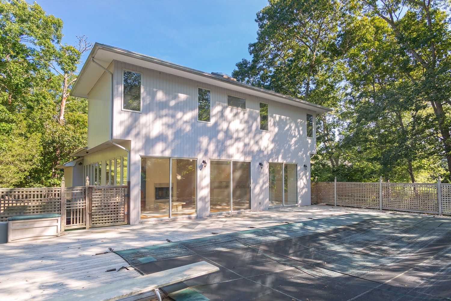 Set on a builder's Acre in a private setting, this Modern four bedroom home offers a bright and spacious open floor plan ready for your own personal touches. A sun filled island kitchen with southern exposure overlooks the deck and outdoor dining area. The living and dining rooms feature dramatic soaring ceilings and an open fireplace. Two queen size guest bedrooms on the main level and a king size master bedroom and guest bedroom on the se