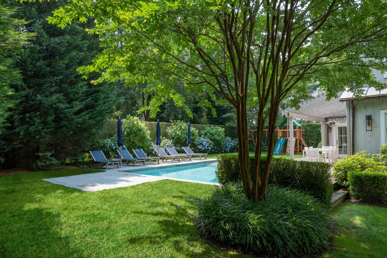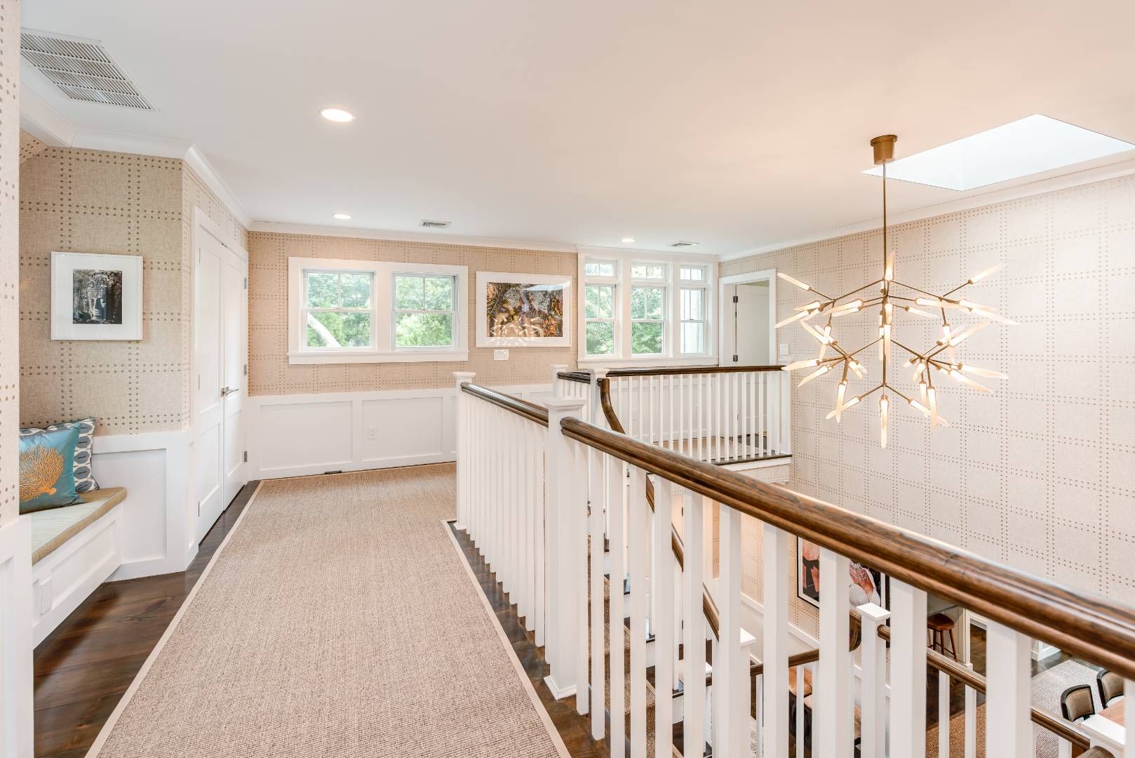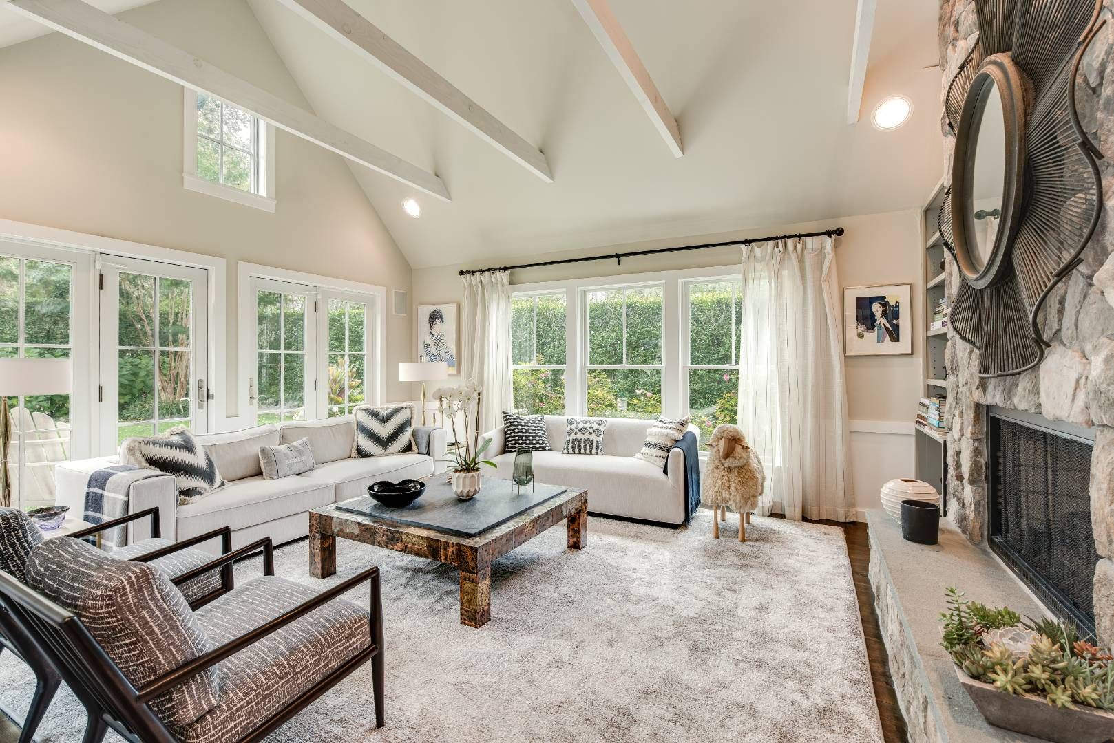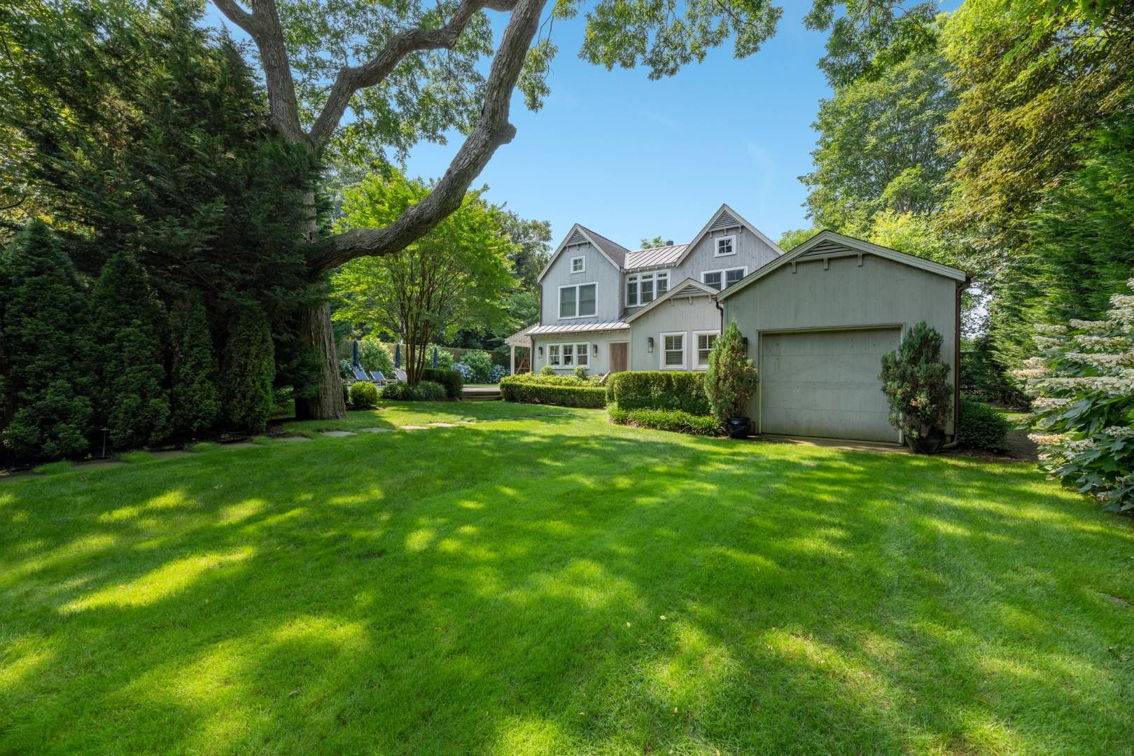 Set well back from the road on a quiet street, discover this stylish two-story home with three bedrooms and three and a half baths. The .4+/- acre property abuts a 16 acre agricultural reserve and is lined with mature landscaping for ultimate privacy. Light-filled first floor living areas flow among the living room with fieldstone fireplace, den with pocket door, dining area and chic black and white kitchen with quartz countertops, marble back