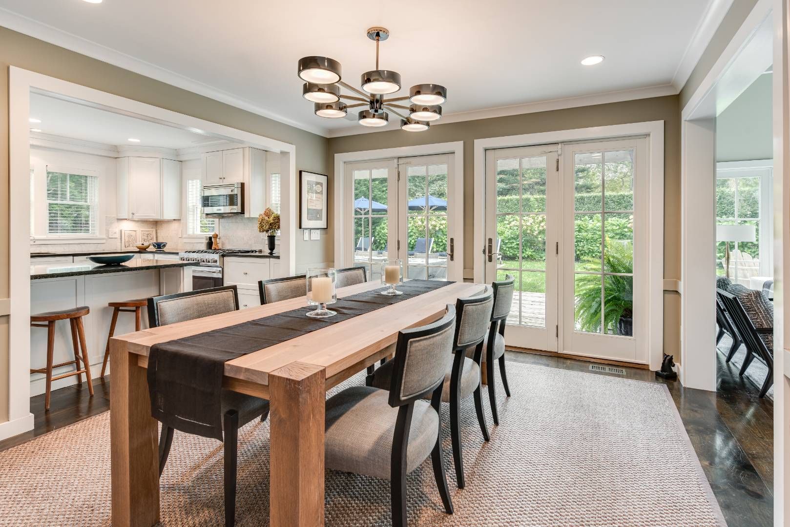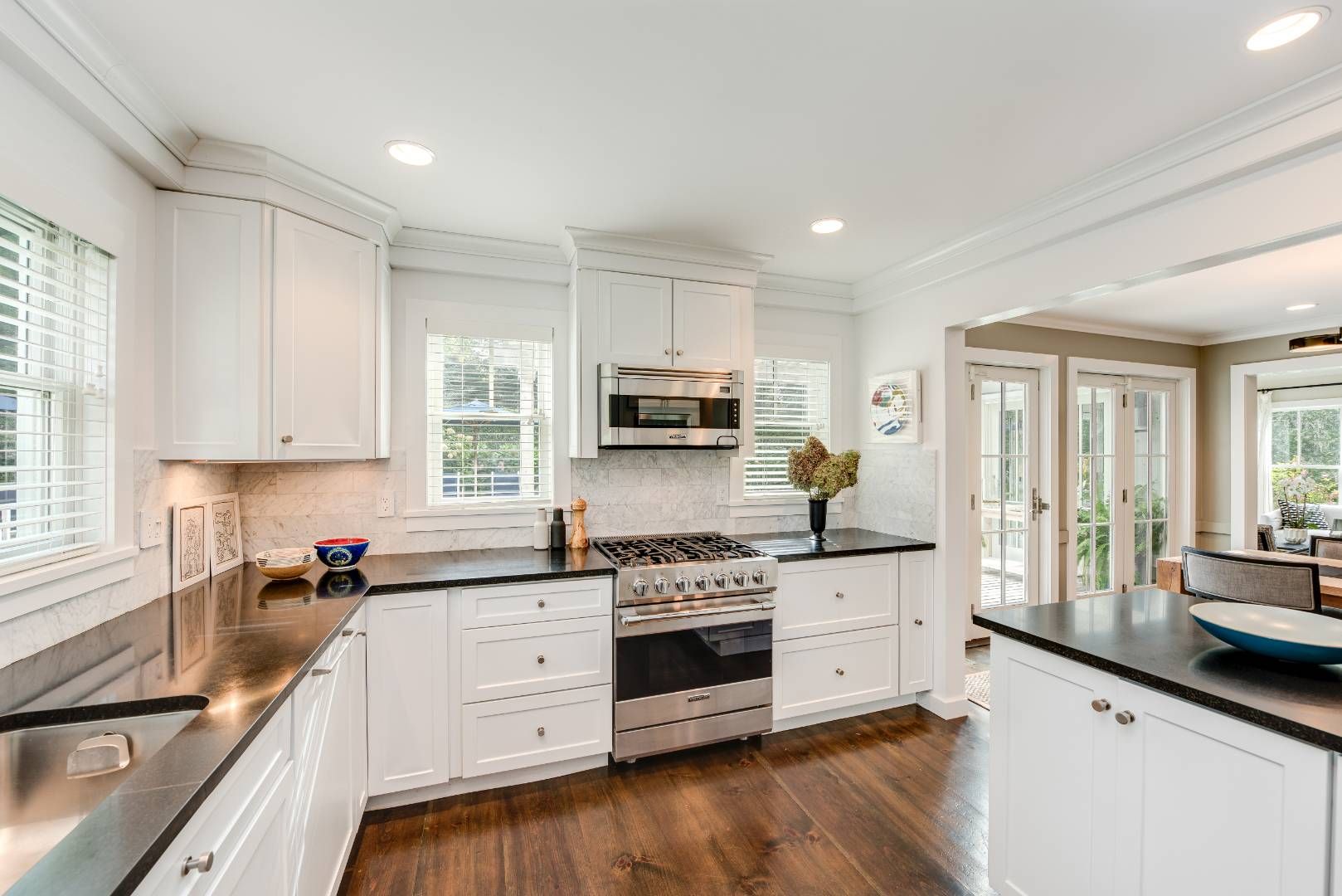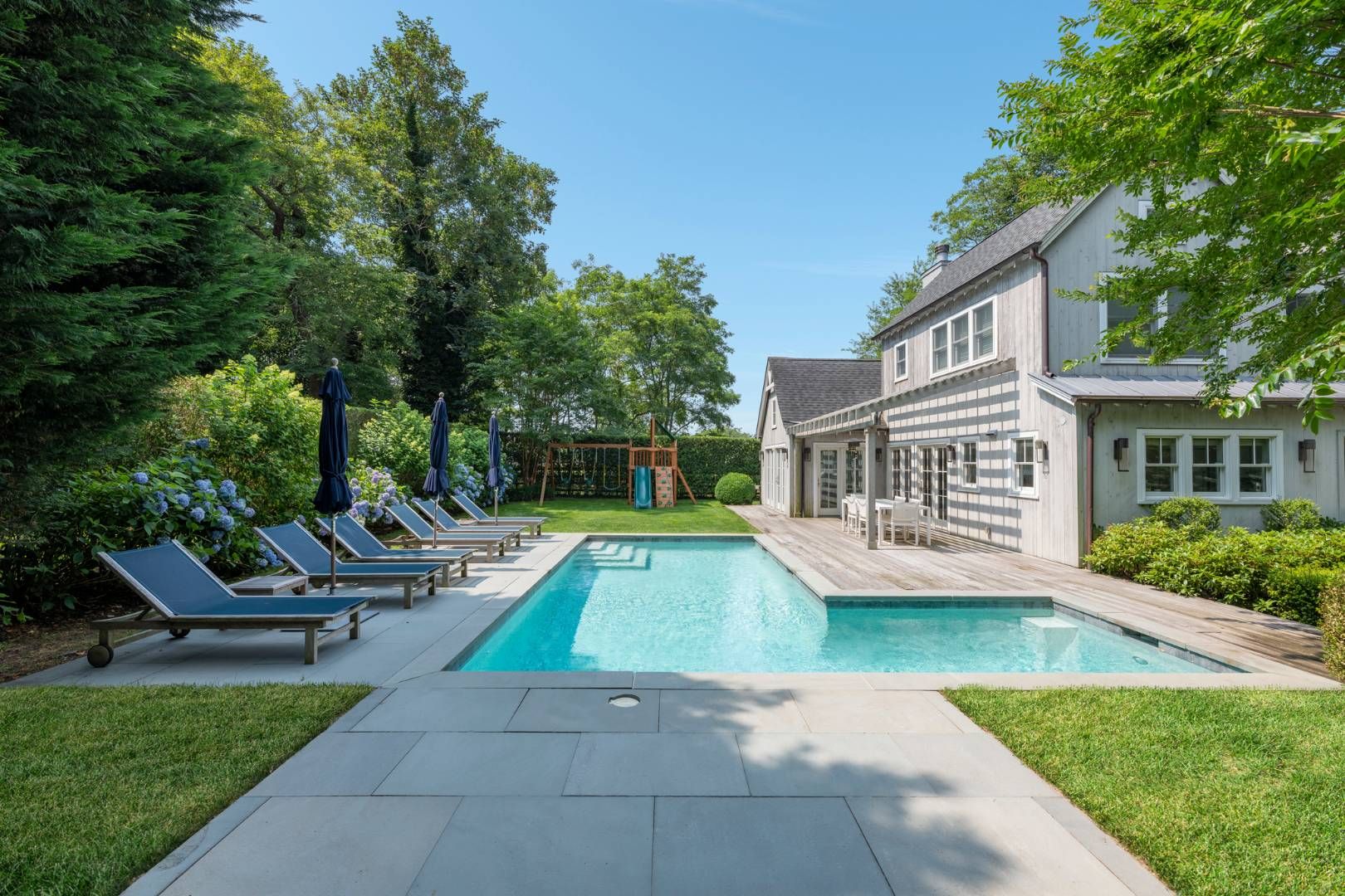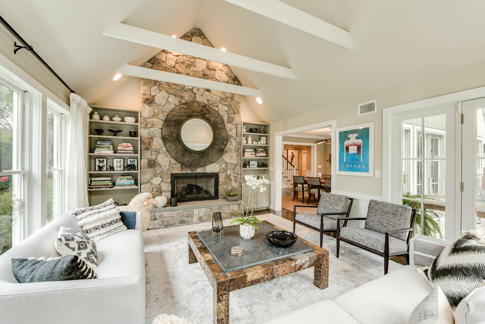 Set well back from the road on a quiet street, discover this stylish two-story home with three bedrooms and three and a half baths. The .4+/- acre property abuts a 16 acre agricultural reserve and is lined with mature landscaping for ultimate privacy. Light-filled first floor living areas flow among the living room with fieldstone fireplace, den with pocket door, dining area and chic black and white kitchen with quartz countertops, marble back
