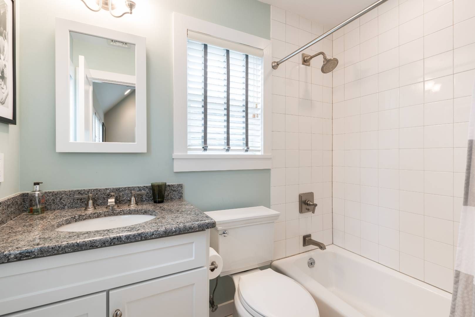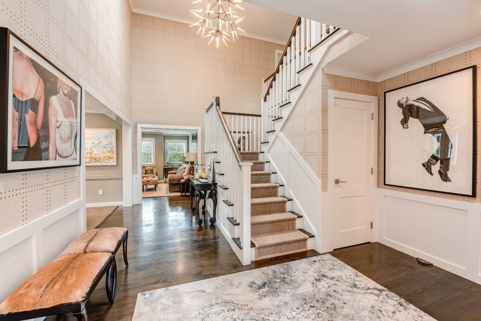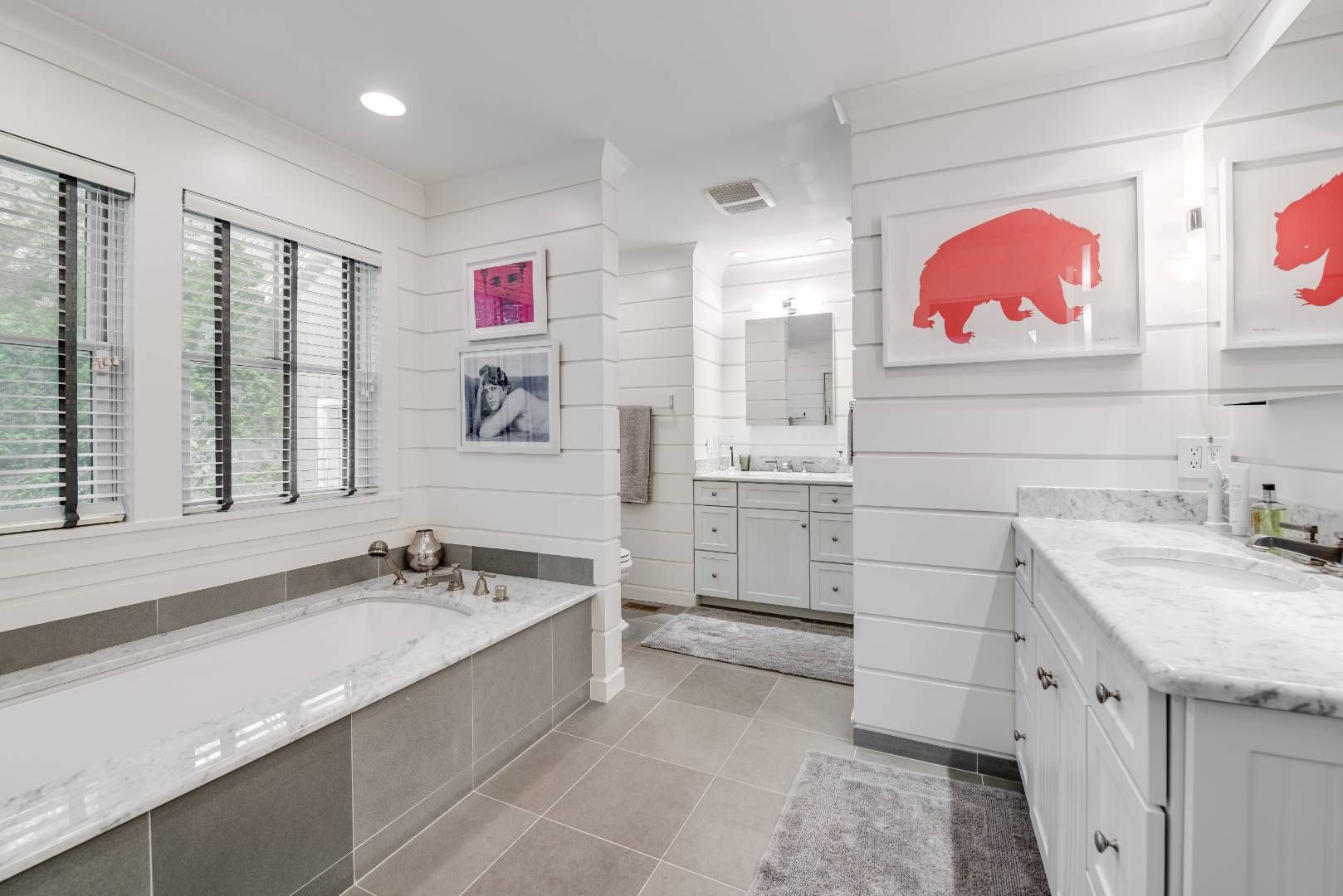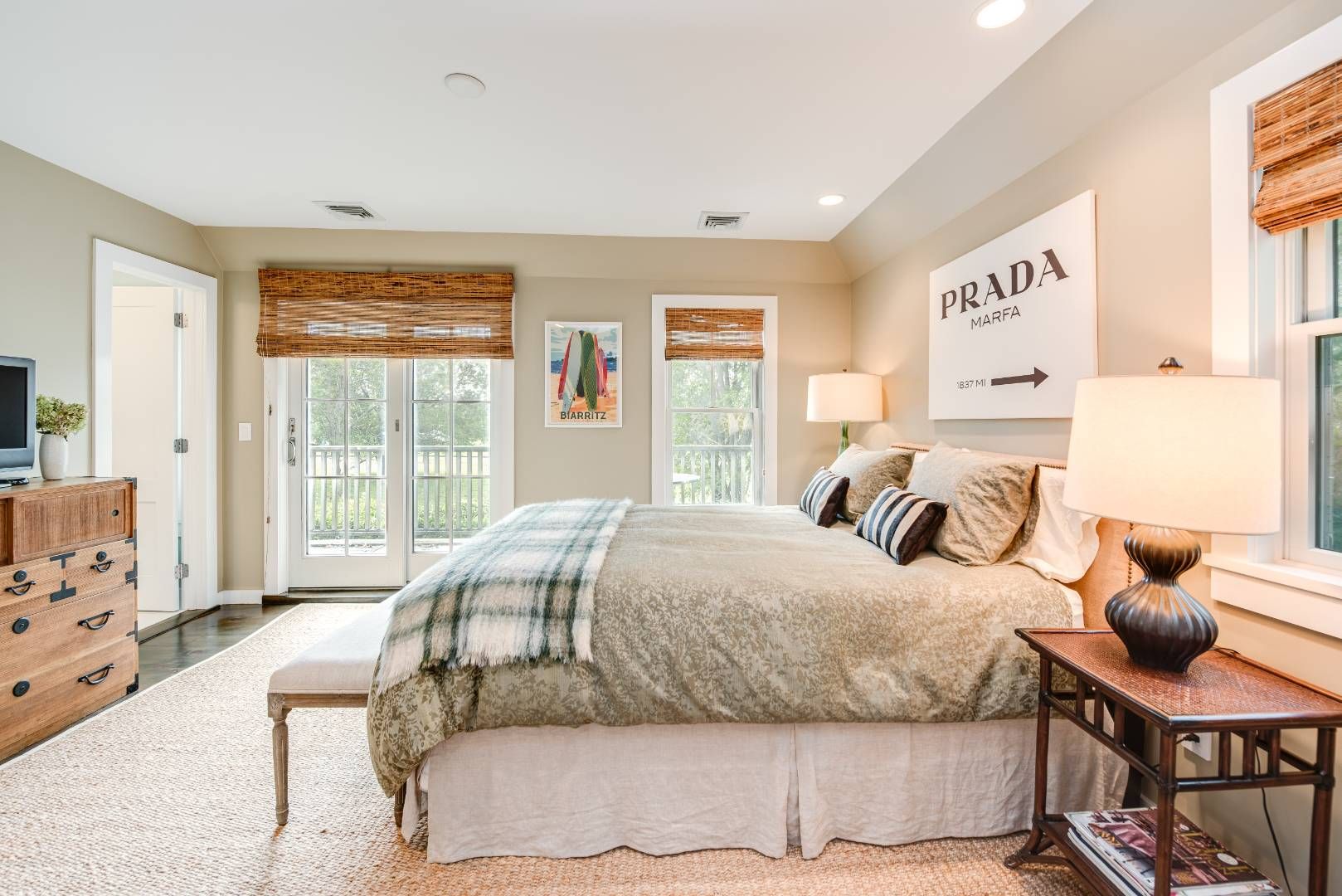 Set well back from the road on a quiet street, discover this stylish two-story home with three bedrooms and three and a half baths. The .4+/- acre property abuts a 16 acre agricultural reserve and is lined with mature landscaping for ultimate privacy. Light-filled first floor living areas flow among the living room with fieldstone fireplace, den with pocket door, dining area and chic black and white kitchen with quartz countertops, marble back