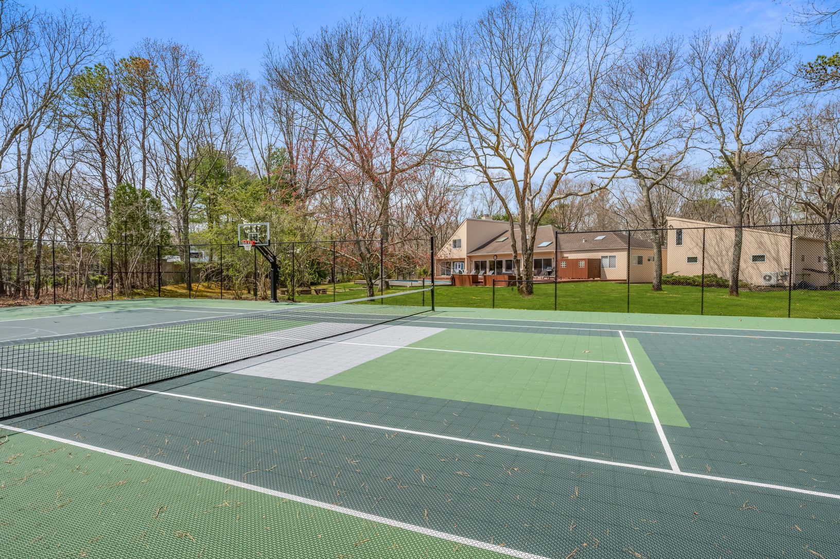 A beautiful & sunlight contemporary home with seven bedrooms including the primary bedroom on the first floor. Enjoy a brand new Versacourt - tennis/pickle ball/basketball and a newly furbished heated pool; continue your workout in the two car garage that has been converted to a gym. It is a private compound on 1.84 acres so you never have to leave.