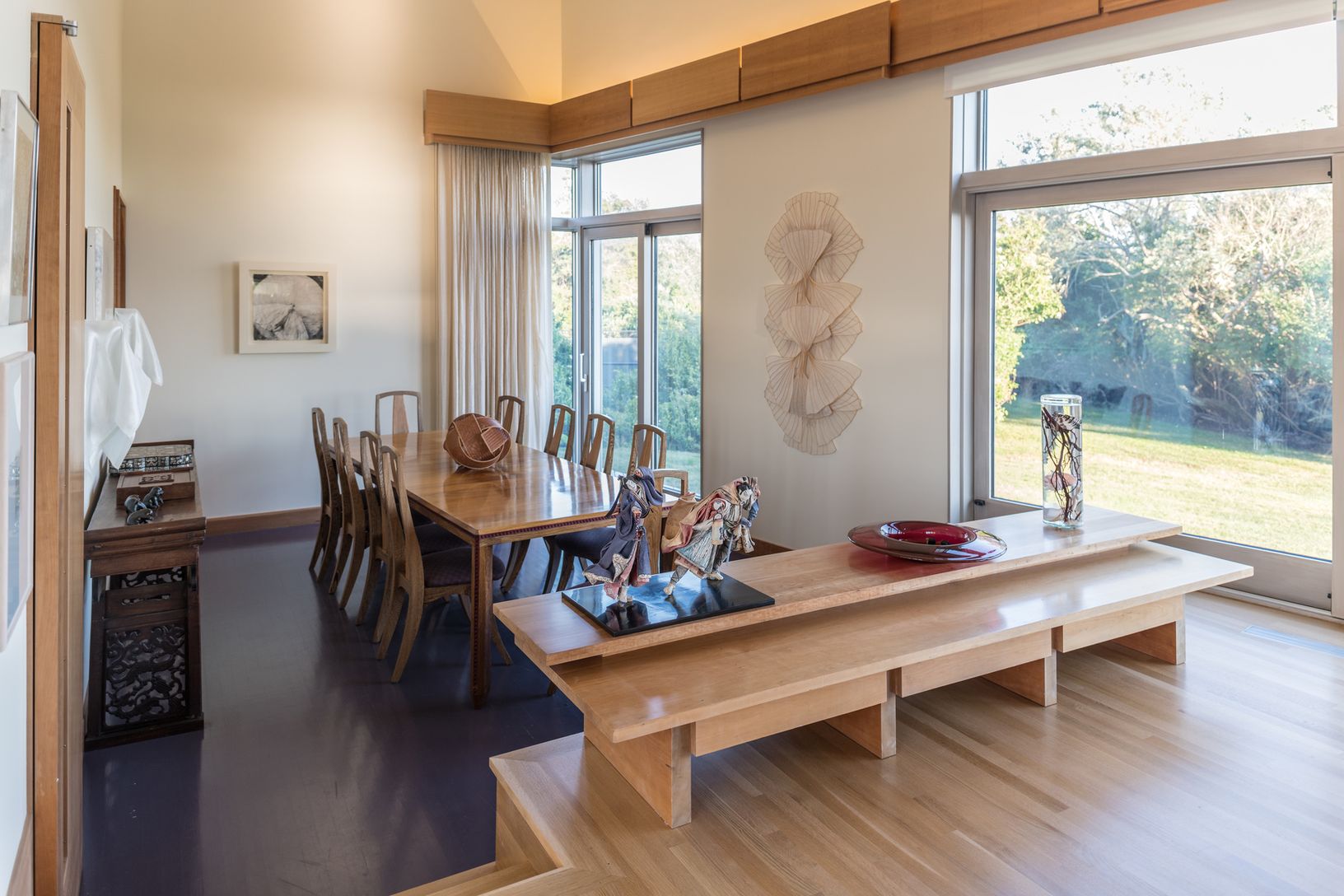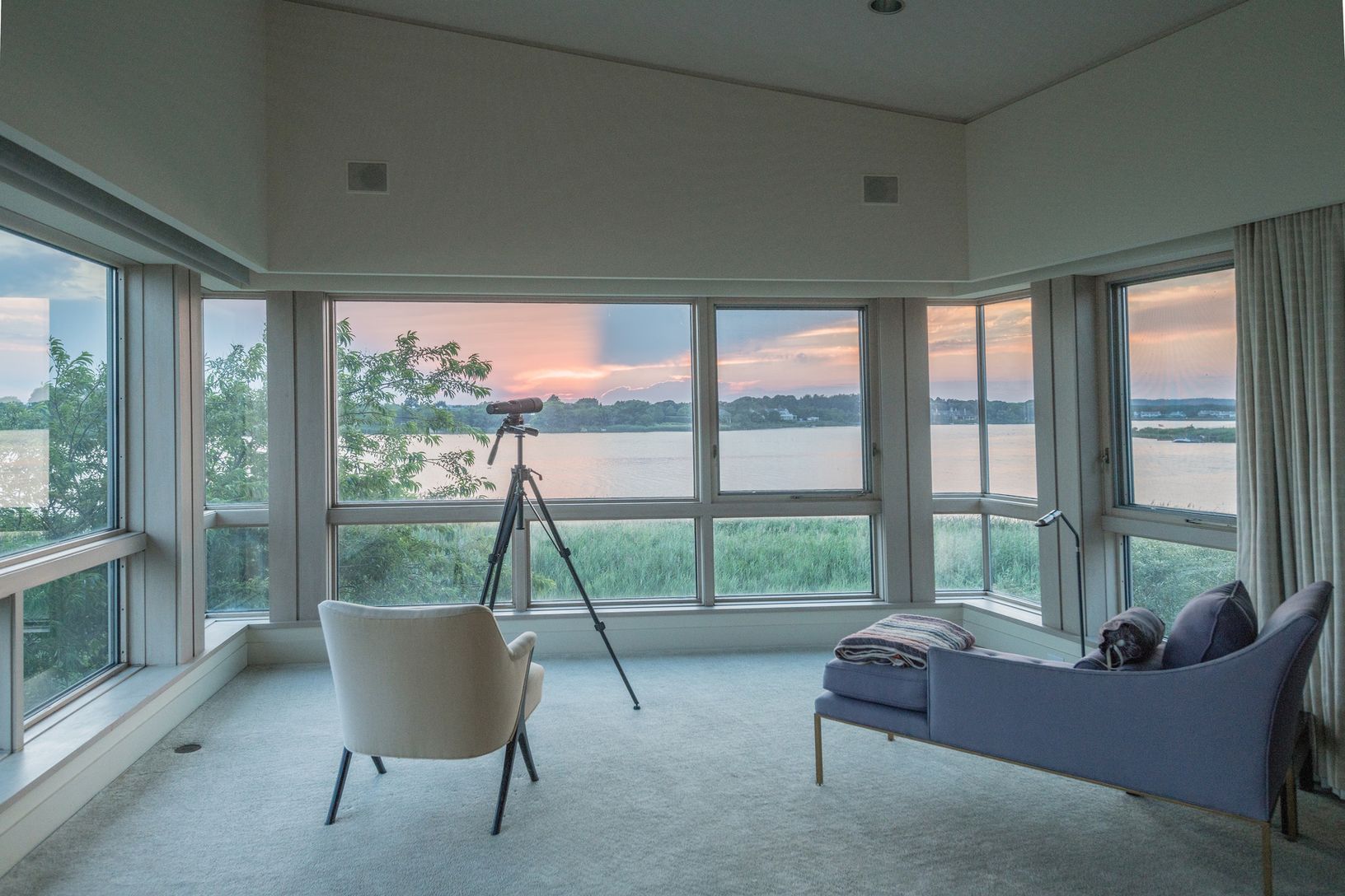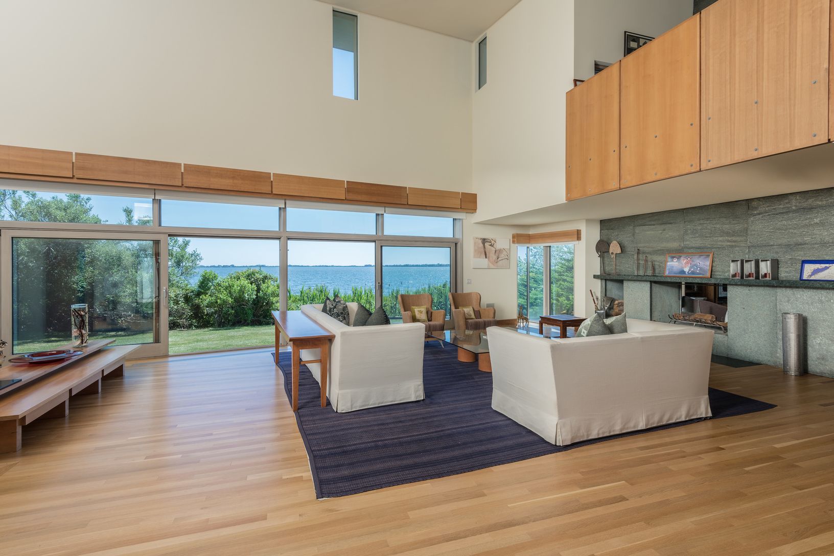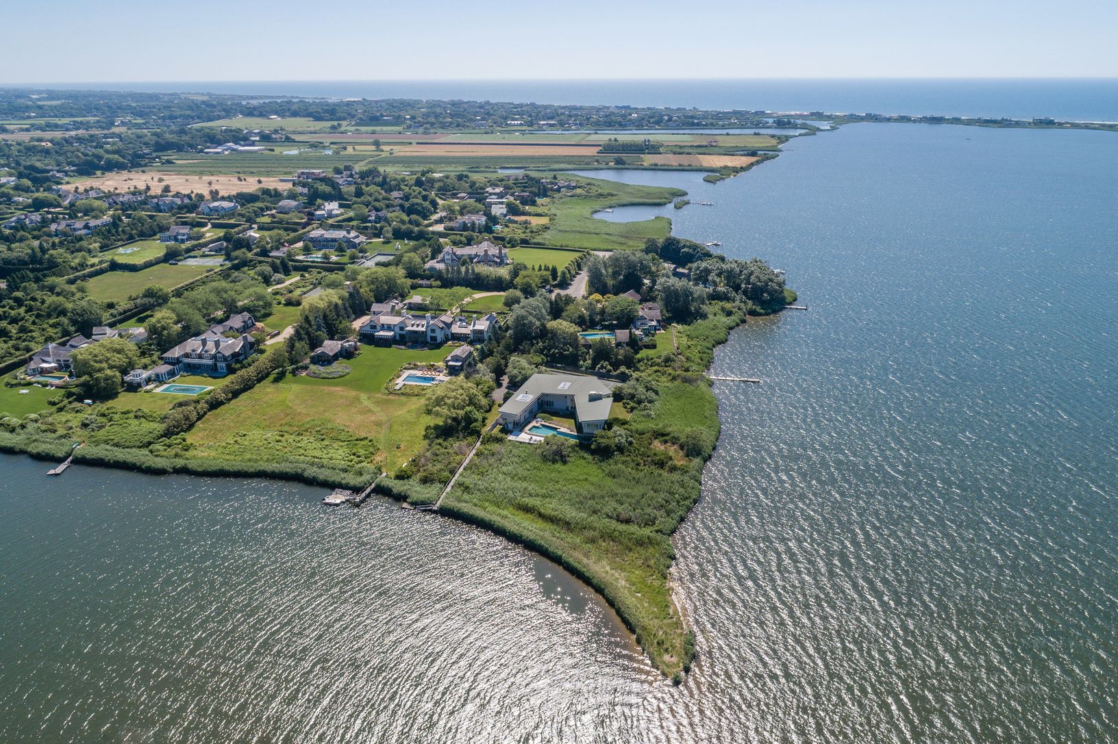 TRY AND FIND A MORE BREATHTAKING LOCATION. THIS IS THE POINT. A 7000 SF MID CENTURY MODERN HAS 5 BEDROOMS, 4.5 BATHROOMS, WATERSIDE POOL, TENNIS AND DOCK. DESIGNED BY RENOWN ARCHITECT TOD WILLIAMS. 2.6 +/- ACRES OF 500' +/- OF WATER FRONTAGE. EVERY WHERE YOU LOOK IS UNOBSTRUCTED VIEWS OF OCEAN AND MECOX BAY. THERE IS OFTEN A SIGHTING OUR NATIONAL BIRD - 2 EAGLES, PERCHED ROOFTOP ENJOYING THE VIEW TOO. ..