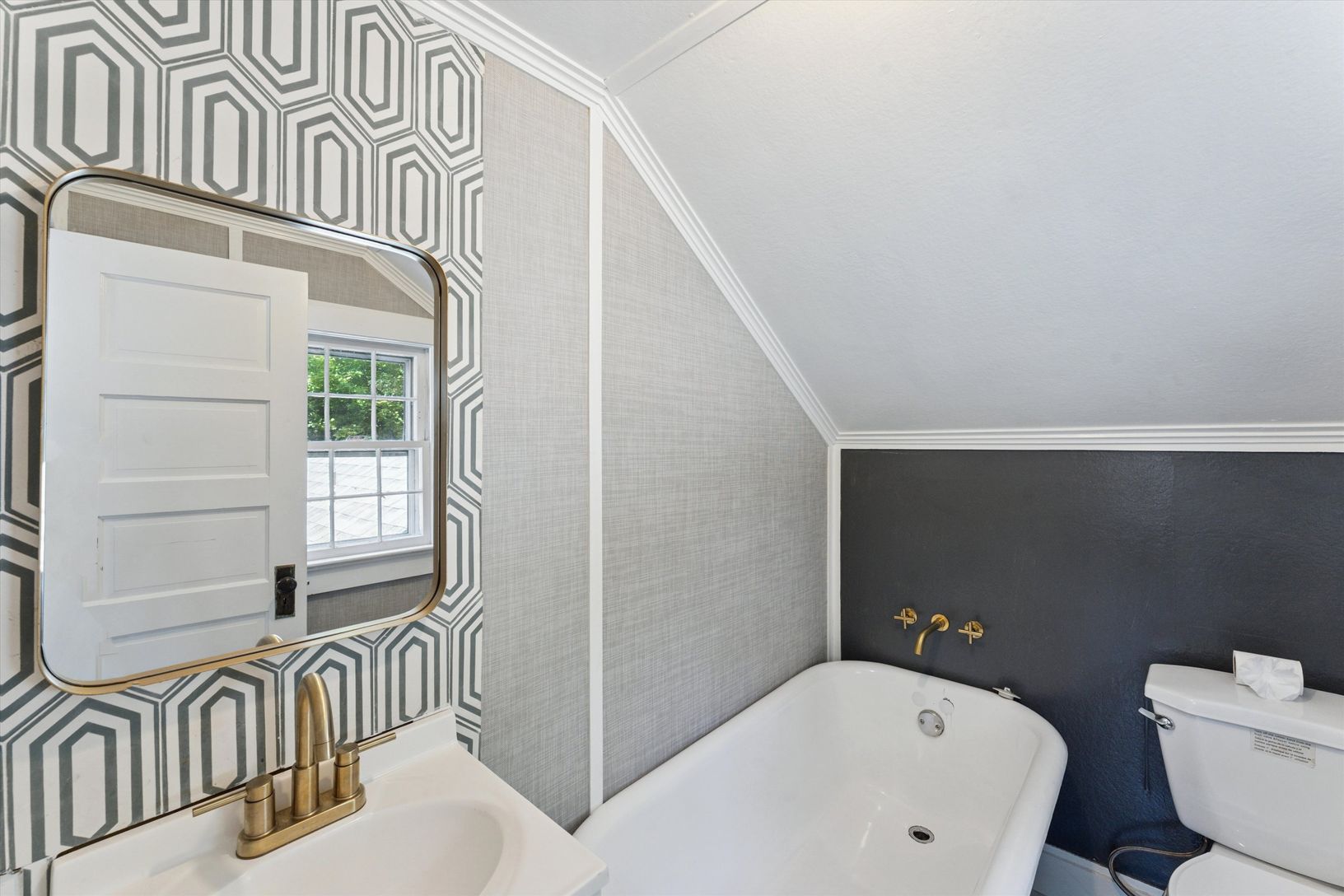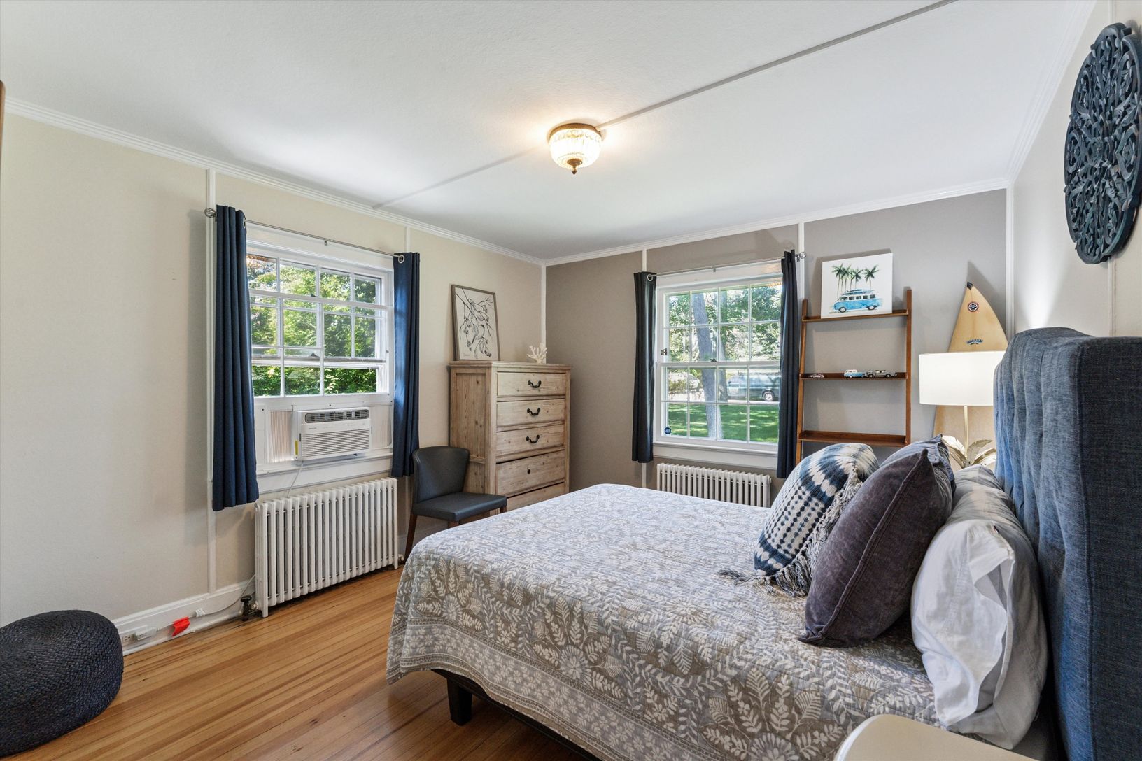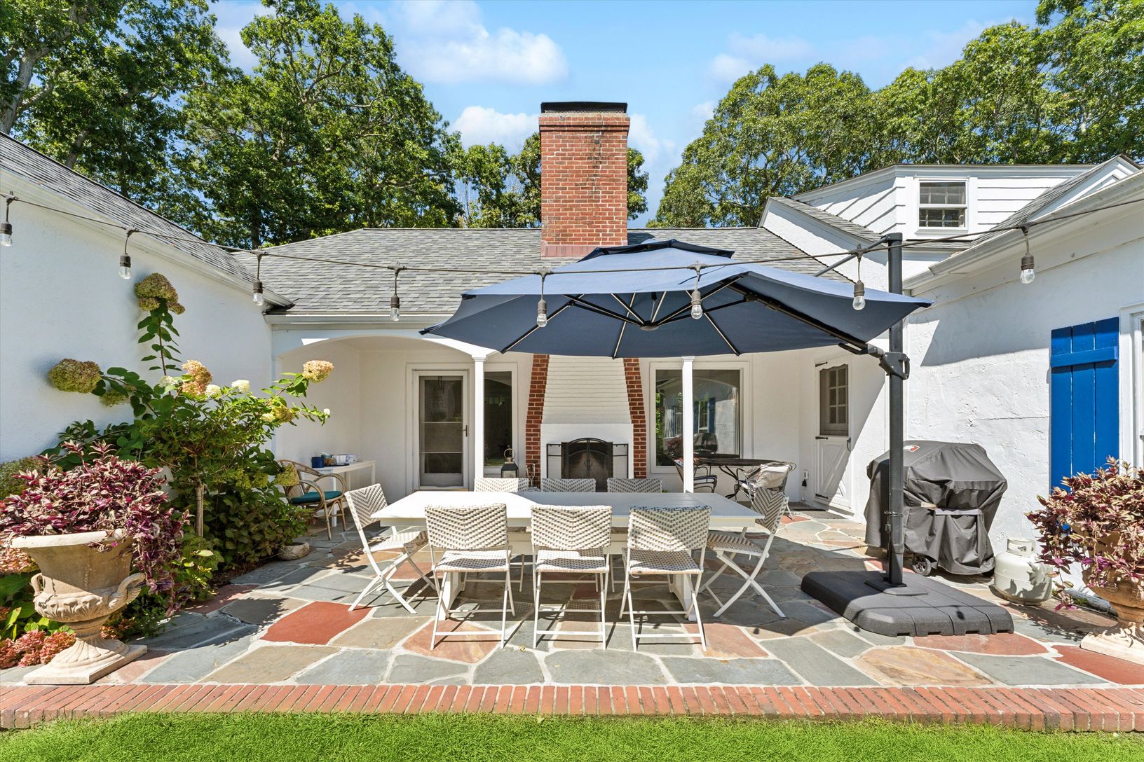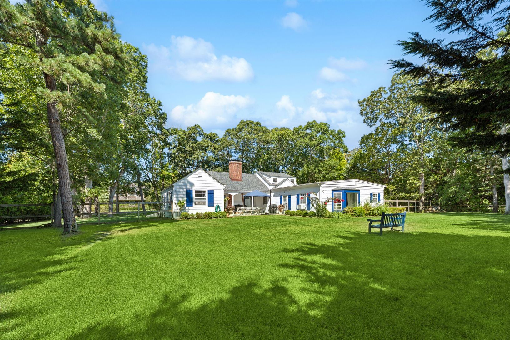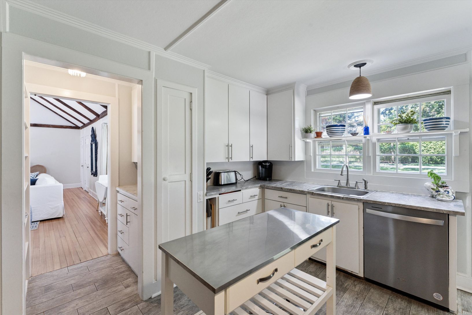 Tucked away on a quiet cul-de-sac in Quiogue, less than a mile from Westhampton Beach's Main Street, this recently renovated cottage blends comfort, convenience, and contemporary style. On the main floor there's a sunny living room with high ceilings and a wood-burning fireplace; a cozy kitchen; and an oversized first-floor primary suite with spa bath and walk-in closet. There's also a separate office with its own full bath, and a guest wing w