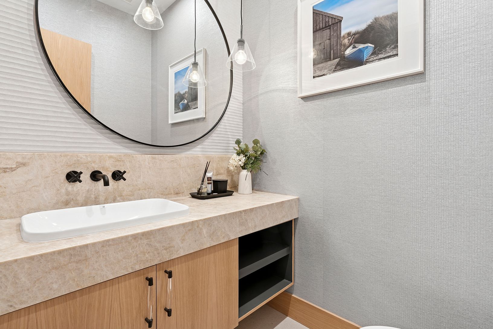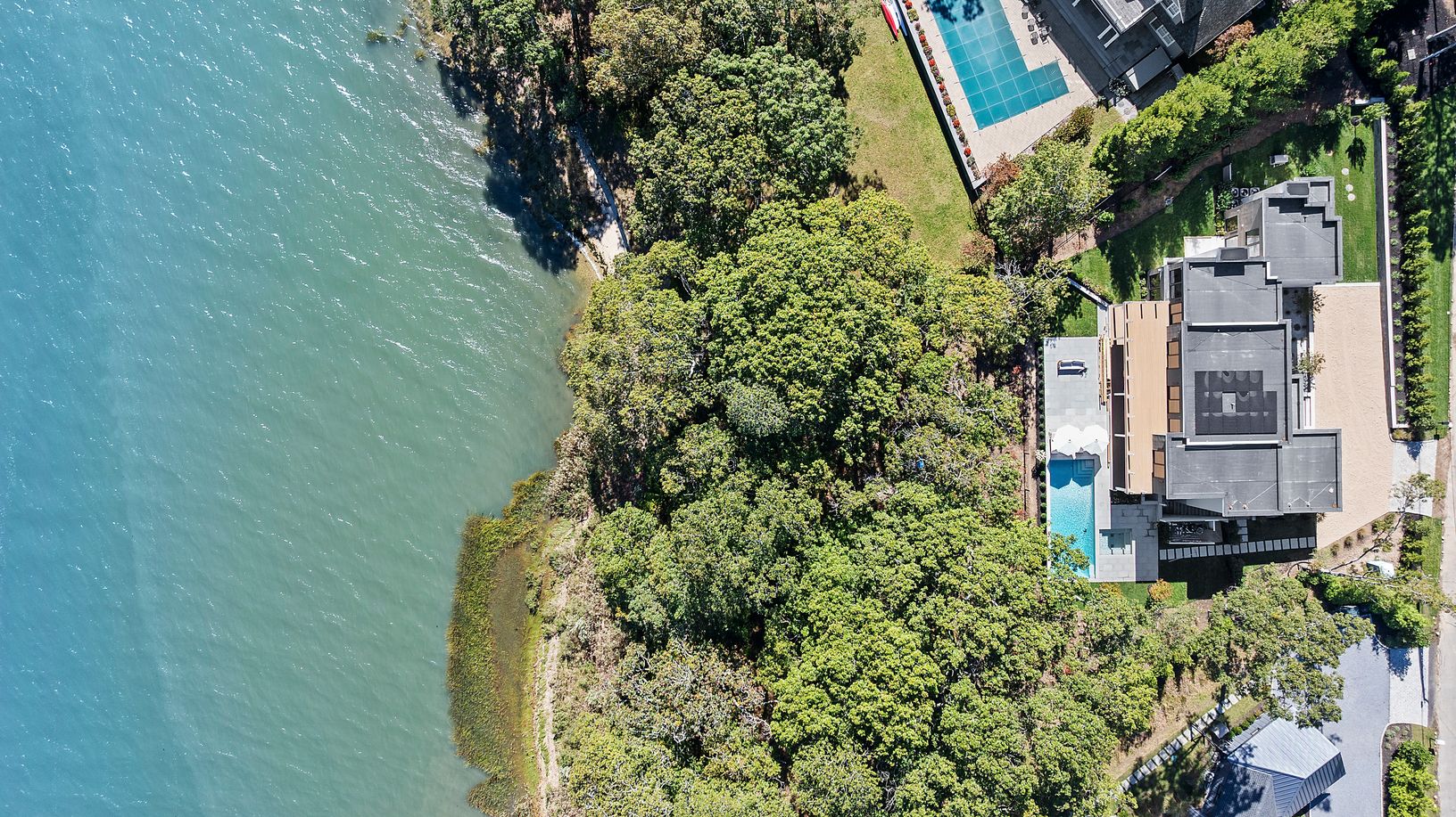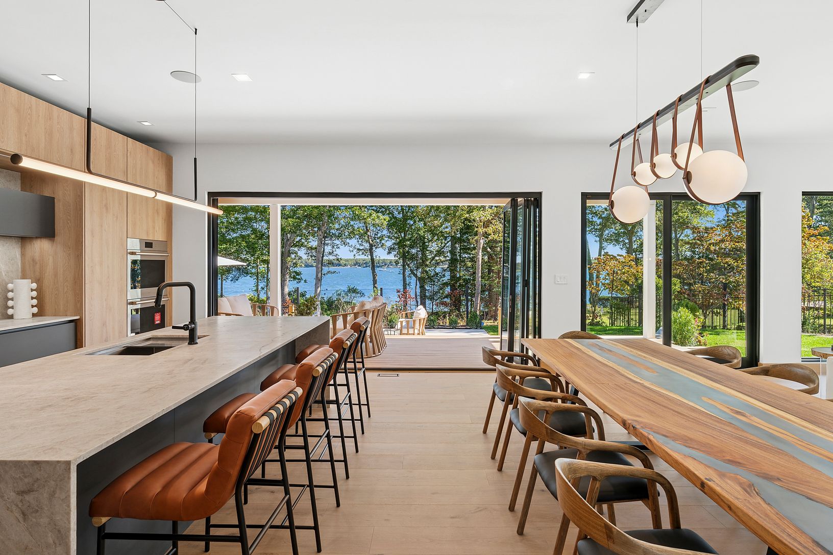 Newly completed and design-driven, this waterfront home makes a bold statement in modern coastal living on a private acre with 140 feet of frontage. Thoughtfully conceived and beautifully furnished, it blends architectural sophistication with effortless Hamptons style. A dramatic double-height foyer opens to sun-filled living and dining spaces framed by walls of glass overlooking the water. The imported German kitchen is a showcase of precisio