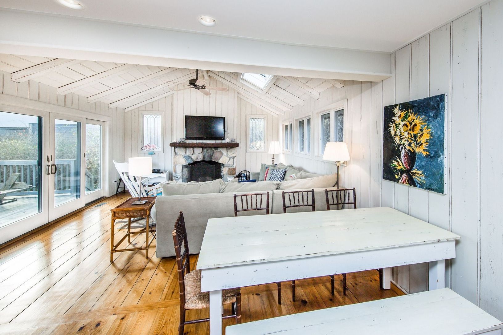 The open-concept top floor boasts a sun-drenched living and dining area with vaulted ceilings, a stone fireplace, and sliding glass doors that lead to an expansive deck—perfect for outdoor dining, BBQs, and t