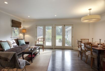 Stylish one level Traditional new construction home with 3 all en suite bedrooms, powder room, living room with fireplace, gourmet kitchen, dining room with french doors and full basement. You will relax on the .70 acre property with an expansive back yard, heated gunite pool and a pool house with full bath and garage. The lower level has been prepped for an additional bedroom and bath. The owners have thoughtfully outfitted the home with be