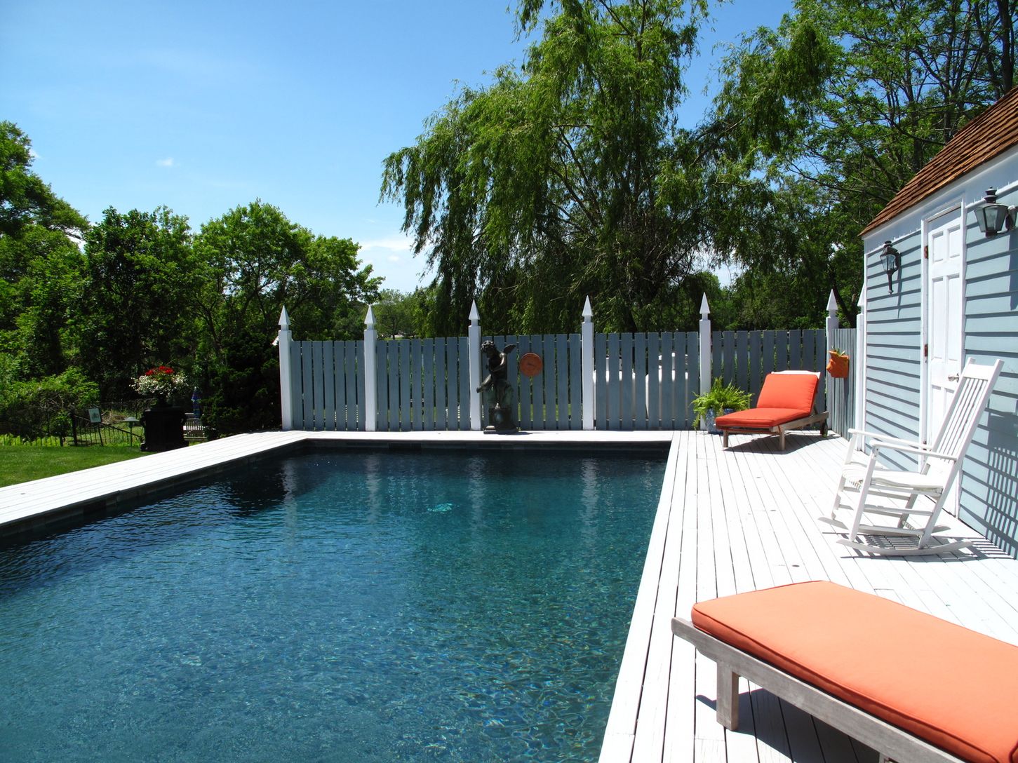 The sun sets over Otter Pond on a peaceful property with a pool and a huge lawn that gently falls toward the water's edge. In the heart of the Village, this light-filled home has 3 bedrooms, 3 1/2 bathrooms, an open living /dining space with super high ceilings, a glass solarium, and a TV room (from where you can also watch the sun setting) There's comfortable furniture to lay around on -inside and out. Very sweet.