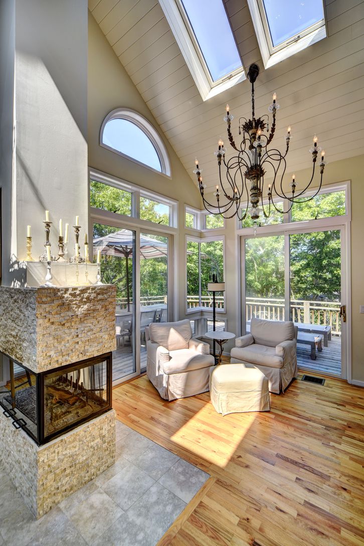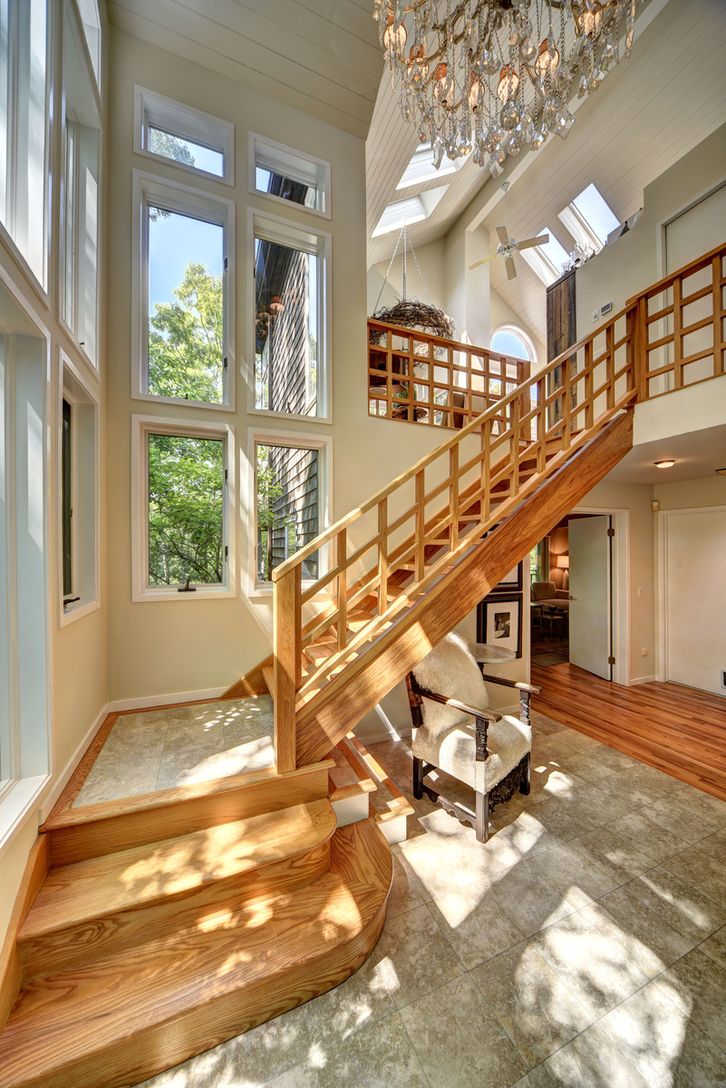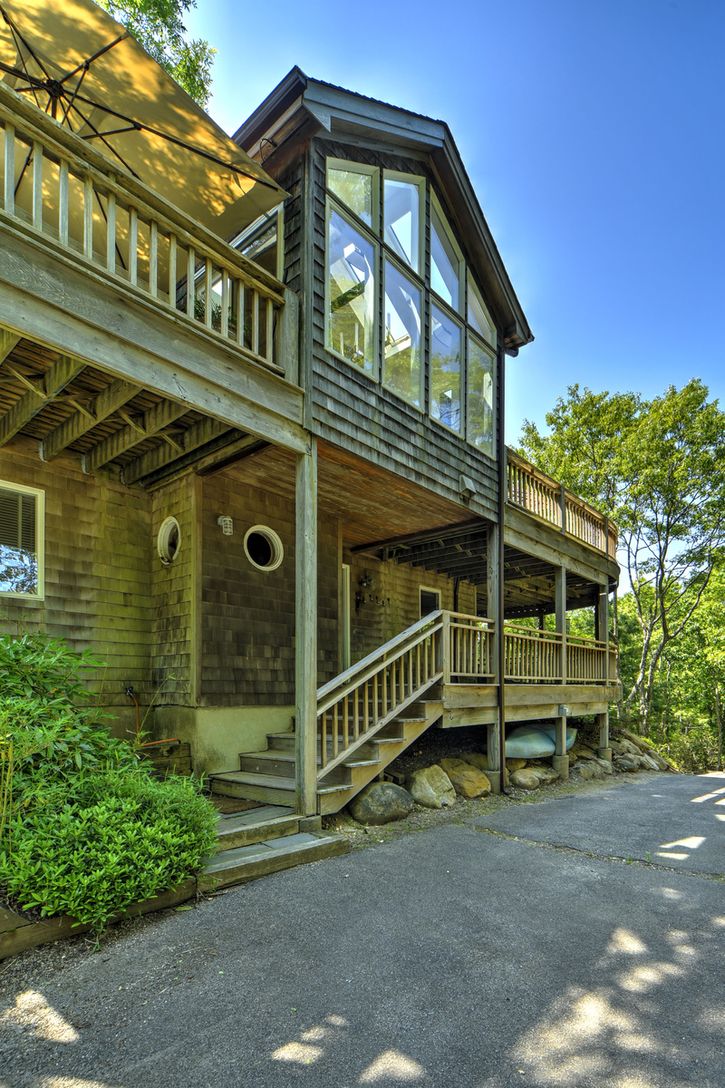 Stylish upside down contemporary just minutes from the heart of Sag Harbor Village. Perched high on a hill, this 3 bedroom, 2 1/2 bath home features entry foyer, two of the bedrooms and full bath, den (which could be a 4th bedroom), side entrance/laundry room and deep wrap-around porch on the first floor. Upstairs is the living room with fireplace, dining area, large modern kitchen, generous deck with dining, seating and BBQ, powder room,