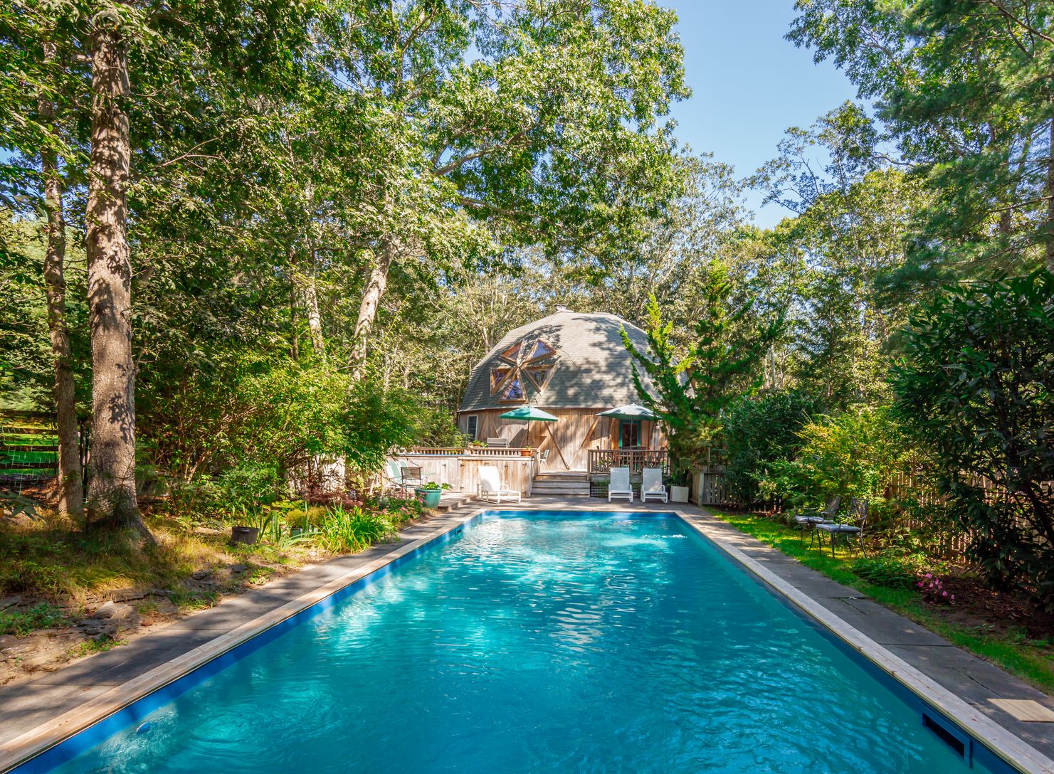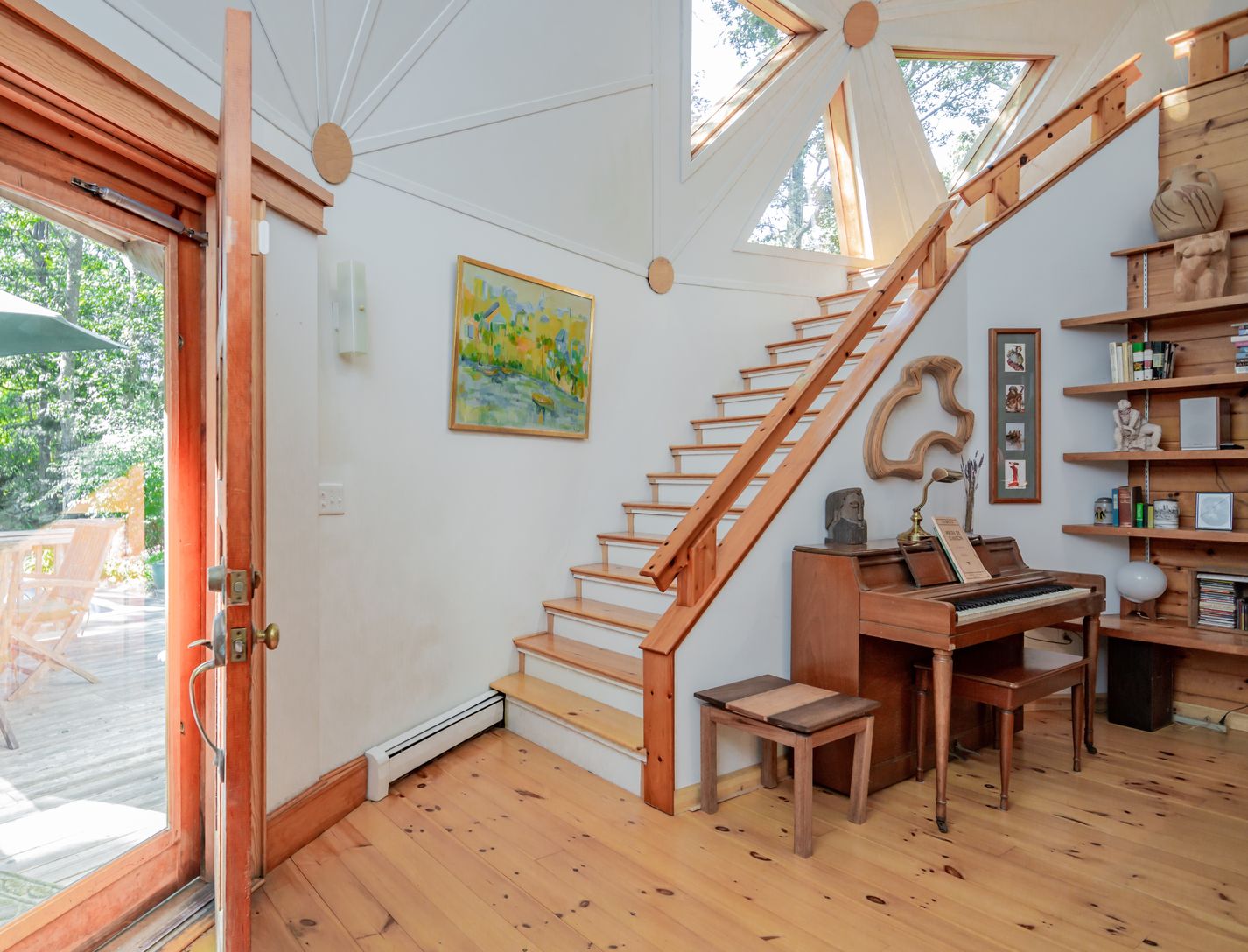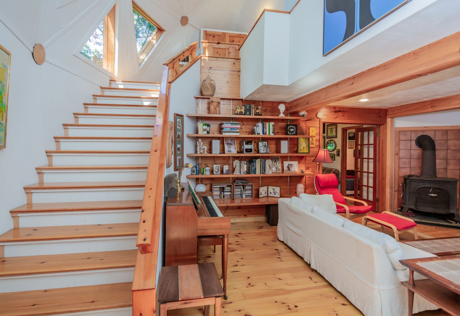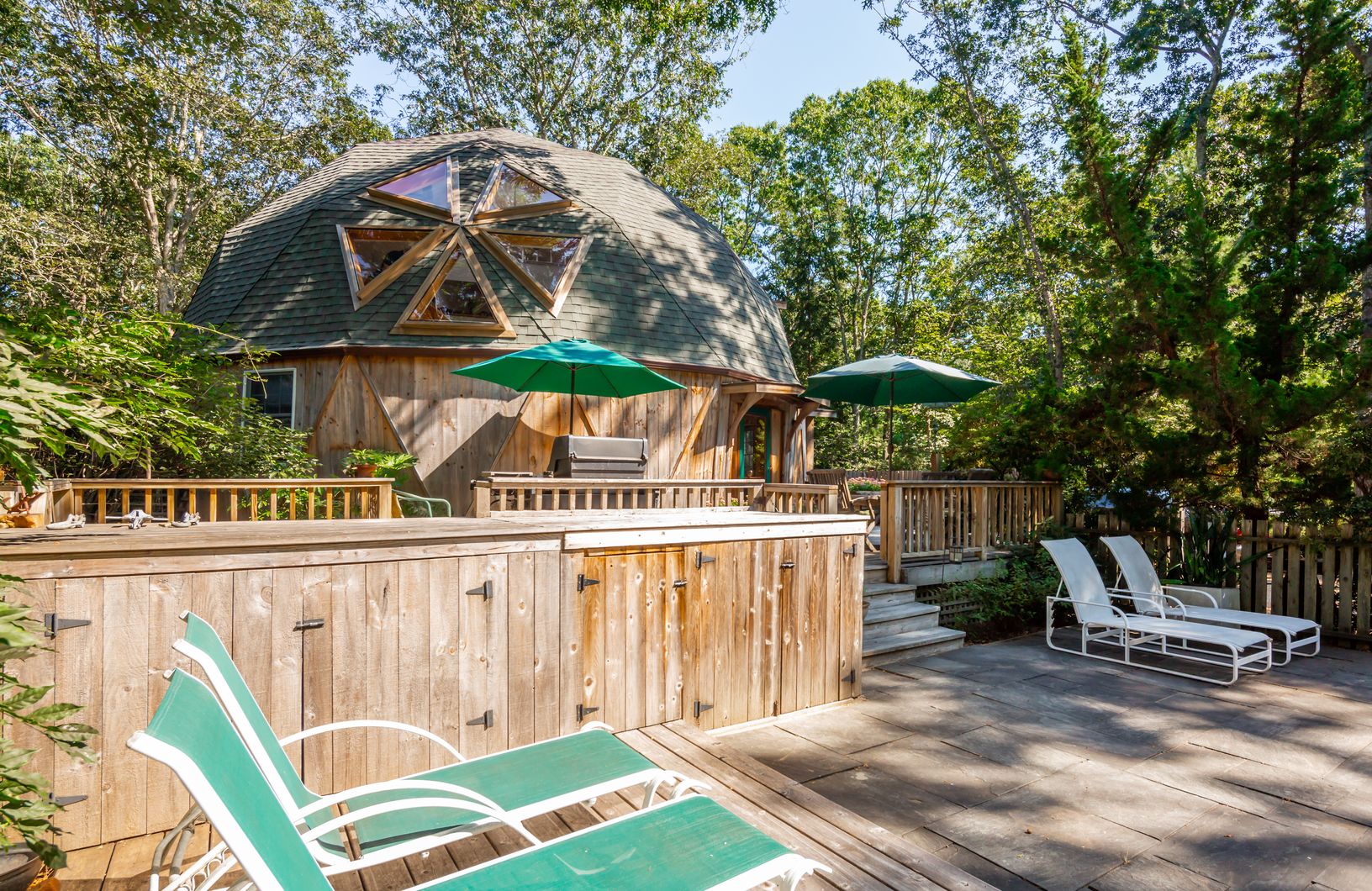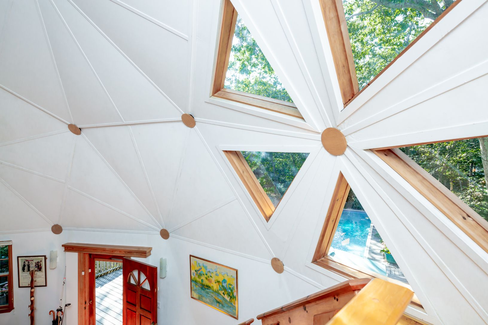 Inspired by Buckminster Fuller's geodesic design, this unique architecture evokes a cool California vibe with an open airy interior and an abundance of natural light that flows throughout. The first floor is comprised of an expansive living room, dining area, kitchen, den, and guest bedroom with ensuite bathroom. The second story holds a very secluded master bedroom with ensuite bathroom, two additional guest bedrooms, and a guest bathroom. Th