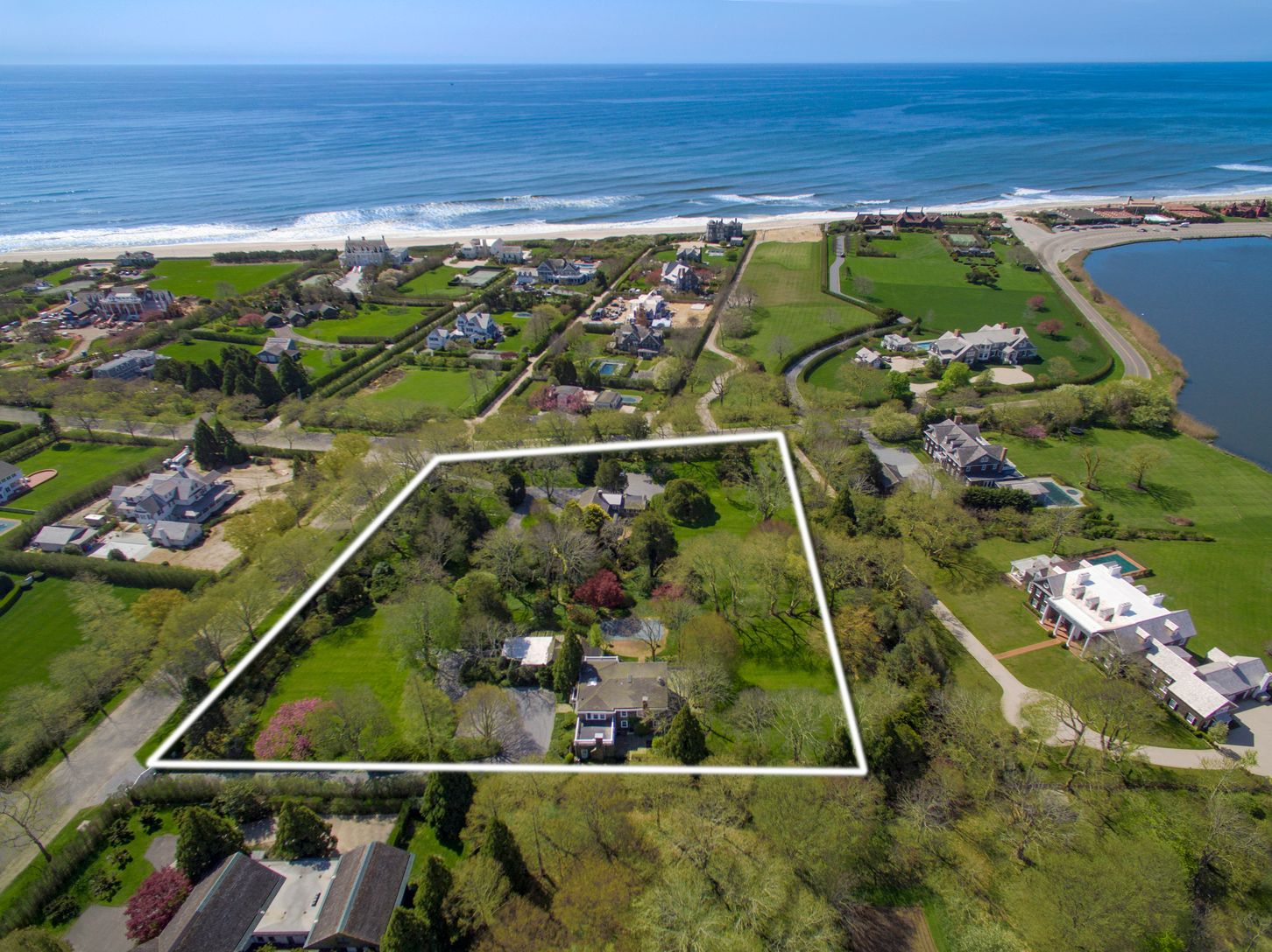 At the end of South Main Street cornering onto Gin Lane, Puffin Hall, the four-acre property with incredible grounds and gardens comprises two separate shingle-sided residences and swimming pool, and literally is steps to ocean beaches. First time on the market in nearly 50 years, gated entrances open to winding drives through mature and meticulous landscaping that feature 200-year-old trees. Broad brick patios off both homes provide seamless