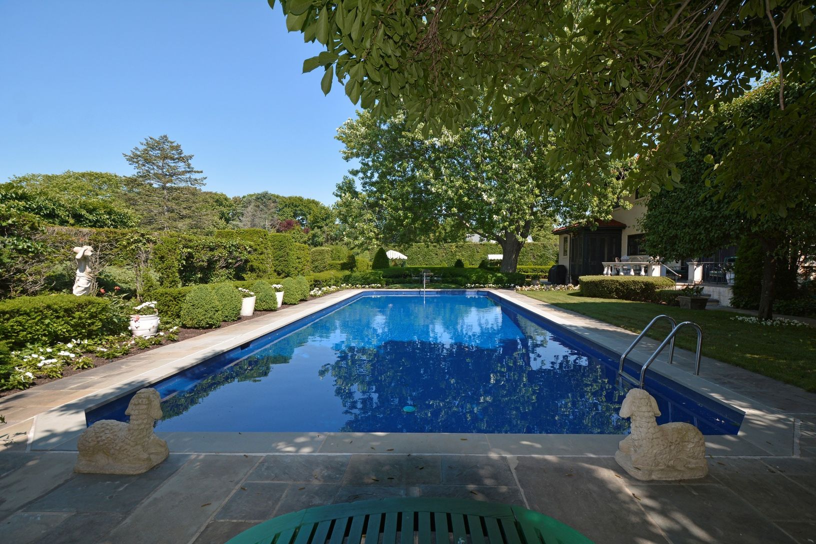 This property is a double lot property located in the estate section of Westhampton Beach Village. The main home, nearly 3,700 +/- square feet, features a double-height living room with a stunning statement staircase, and brick wood-burning fireplace, a formal dining room, a den off the eat-in kitchen, laundry room, and powder room. The second level offers a master suite with a walk-in closet, a large bathroom, and a sitting room, and three ad