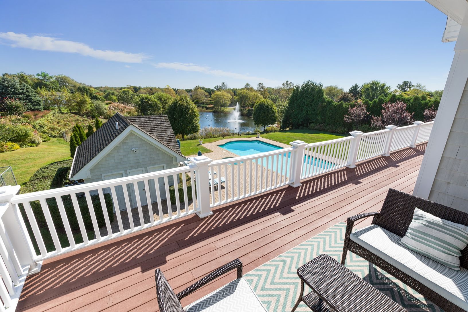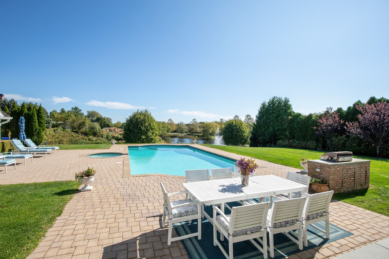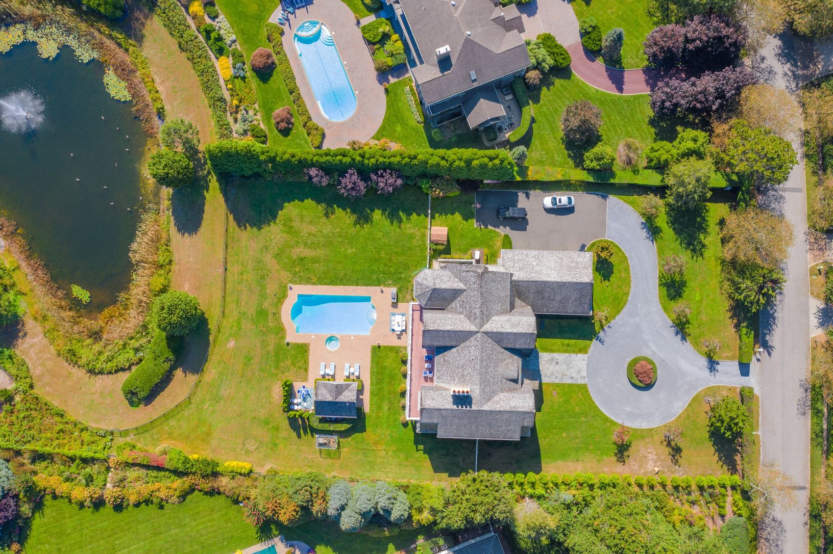 This immaculate 9,600 Sq. Ft. traditional home includes 6 bedrooms and 9.5 baths sited on 1.38 acres. An oversized entry foyer leads to a sprawling living room with fireplace and multiple accesses to the covered bluestone observation decks, outdoor kitchen, dining areas and stately pond views with private garden access. French doors lead into the living room with wet bar, additional fireplace and outdoor access to a covered entertaining deck f