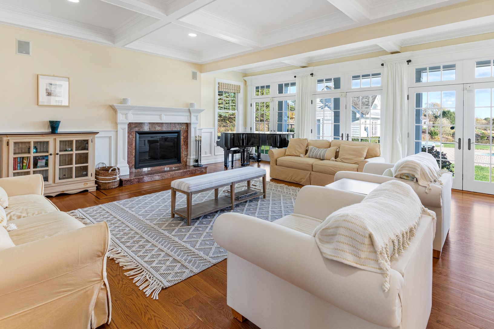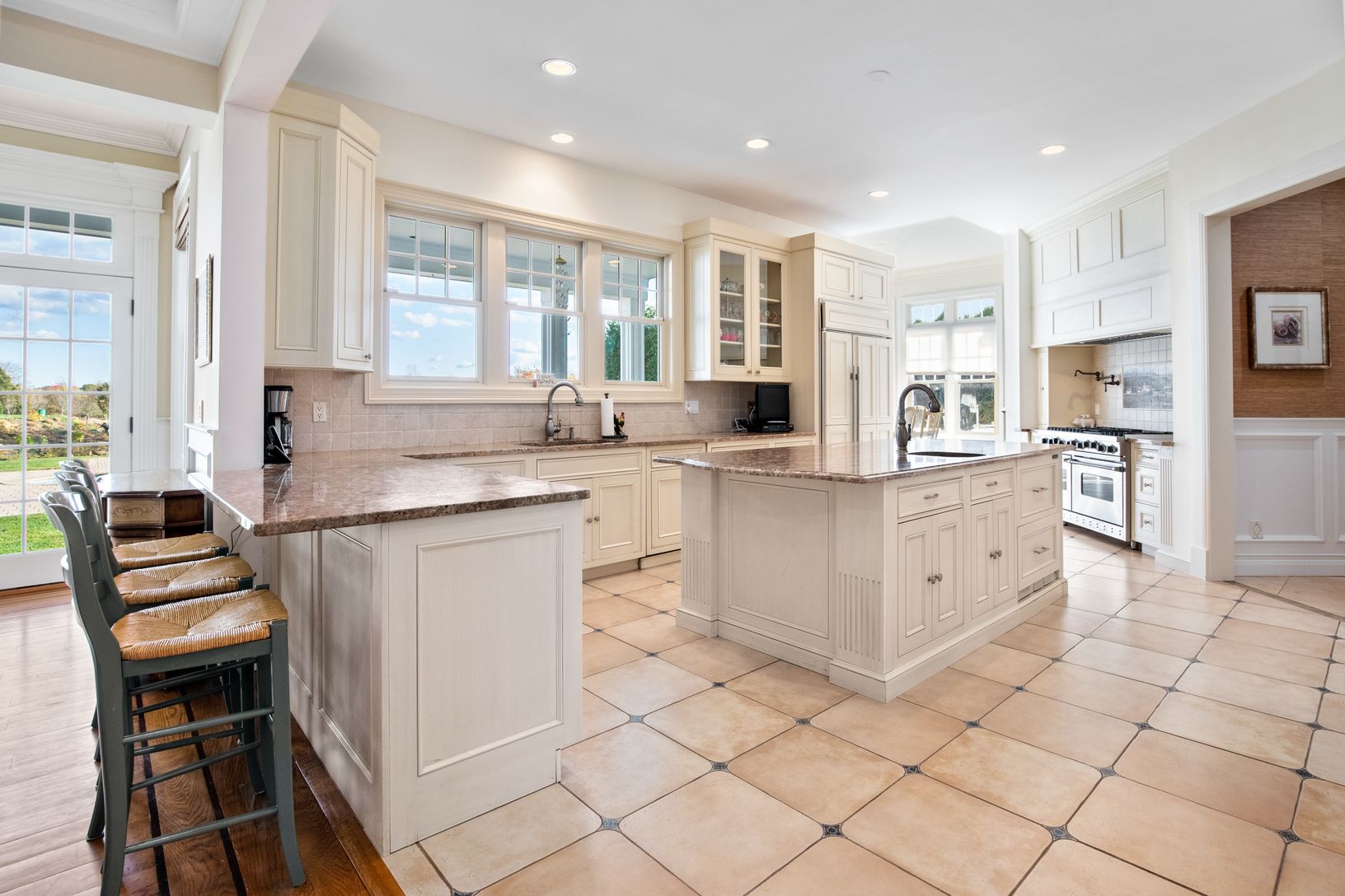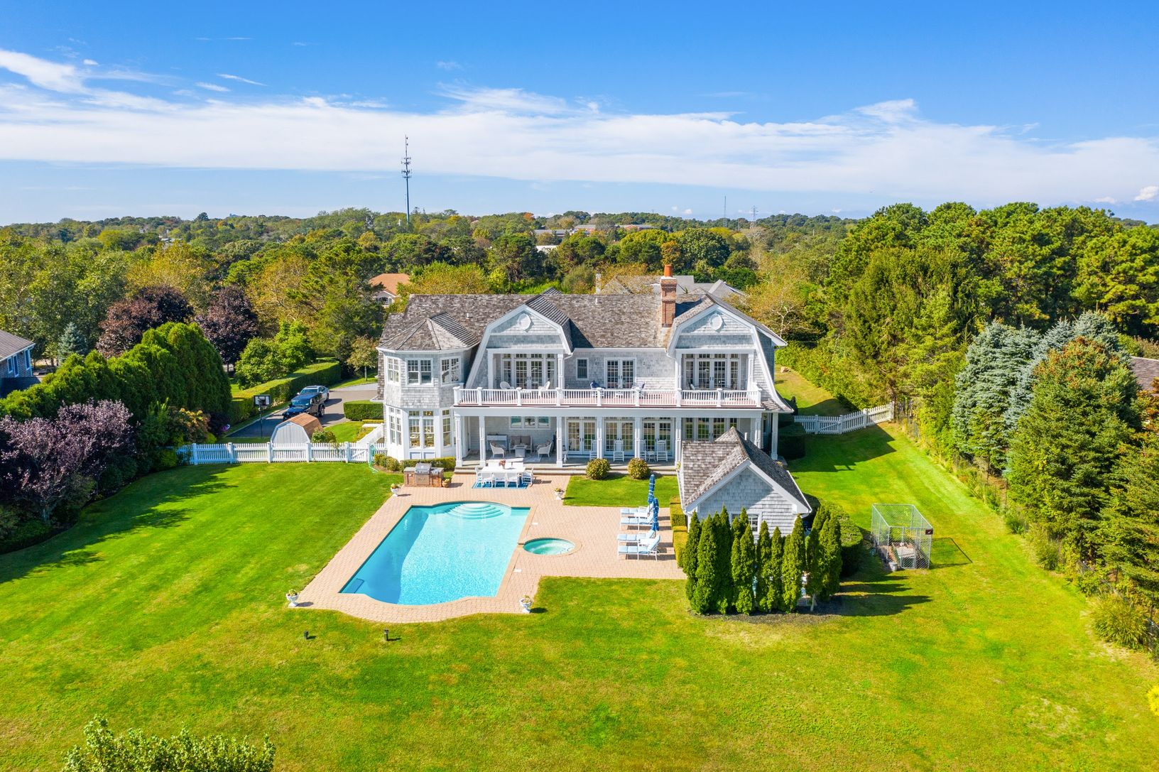 This immaculate 9,600 Sq. Ft. traditional home includes 6 bedrooms and 9.5 baths sited on 1.38 acres. An oversized entry foyer leads to a sprawling living room with fireplace and multiple accesses to the covered bluestone observation decks, outdoor kitchen, dining areas and stately pond views with private garden access. French doors lead into the living room with wet bar, additional fireplace and outdoor access to a covered entertaining deck f
